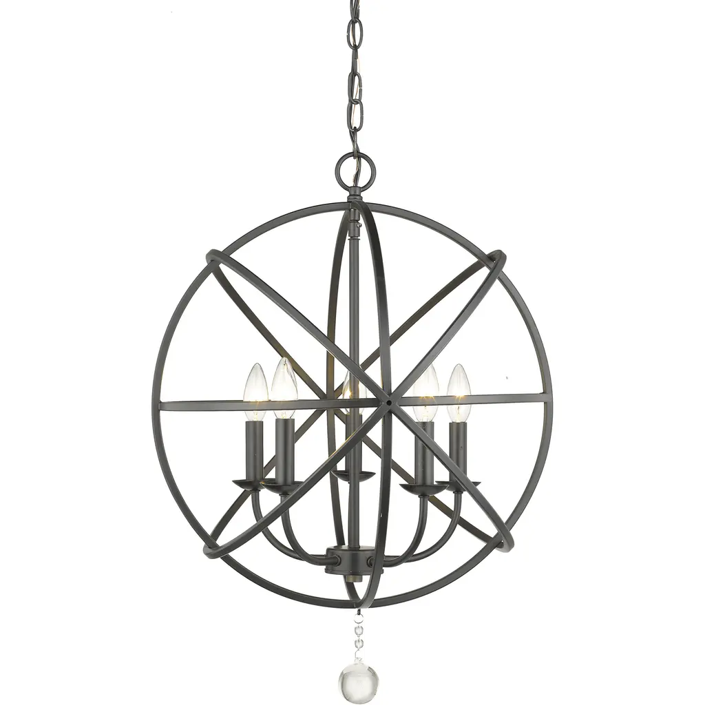 Fun contemporary style with a space-age twist adds character to this matte black orb-shaped five-light chandelier. Custom finish options allow a perfect palette that complements your decor personality, and a charming strand of dangling crystal balls changes up its rugged personality.