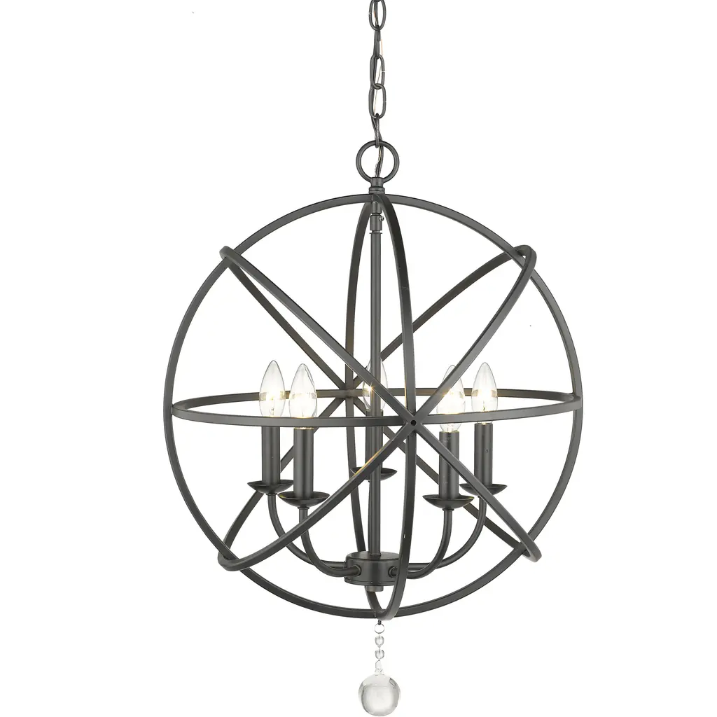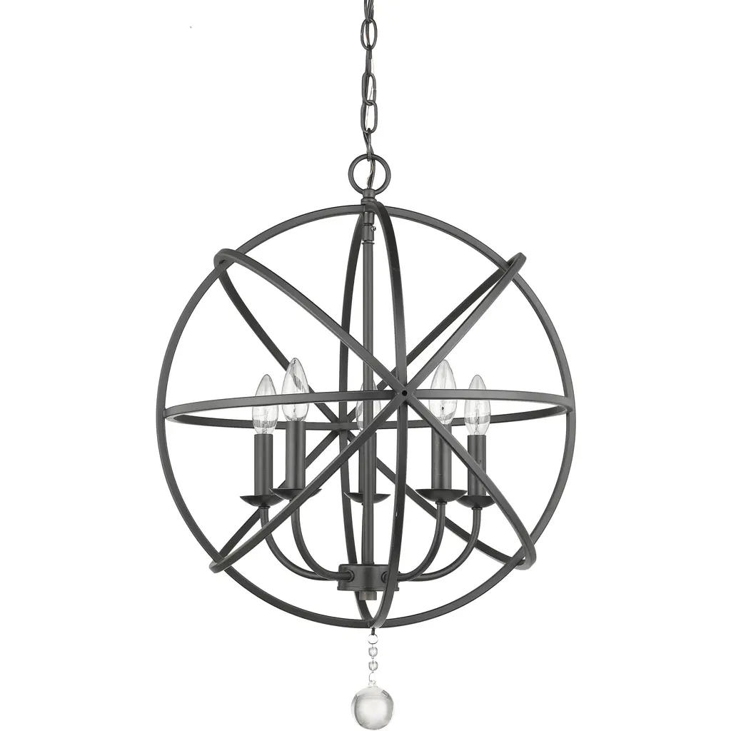 Fun contemporary style with a space-age twist adds character to this matte black orb-shaped five-light chandelier. Custom finish options allow a perfect palette that complements your decor personality, and a charming strand of dangling crystal balls changes up its rugged personality.