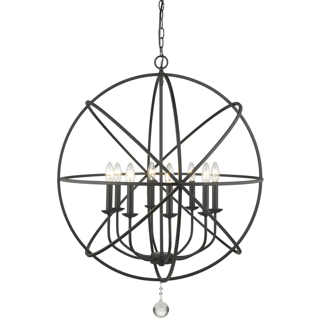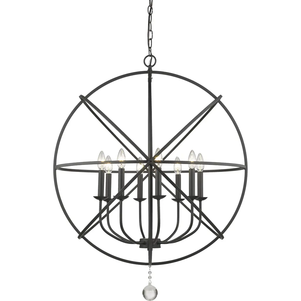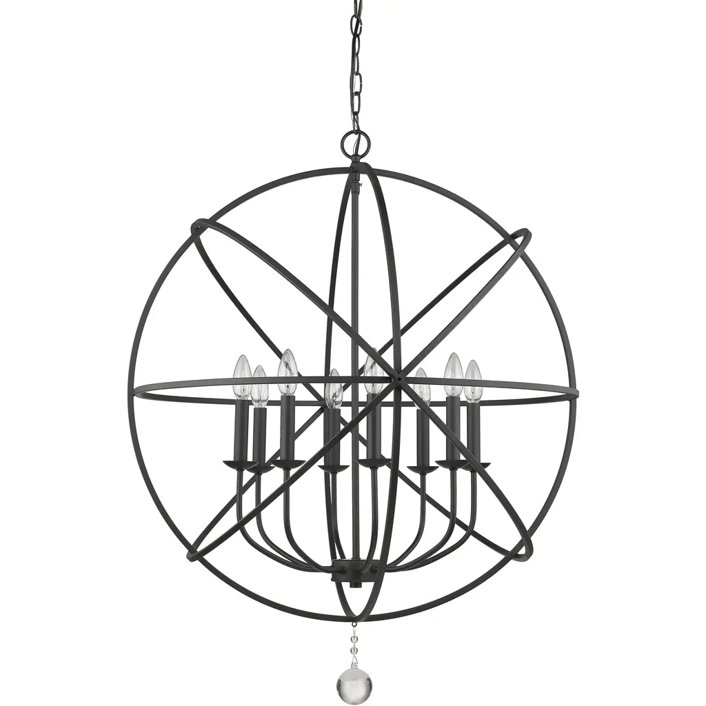A dramatic and dynamic ambiance makes this matte black steel eight-light open-orb chandelier a fabulous choice for transitional living spaces. Try your hand at customizing a blend of finishes for its frame interior, finials, and candelabra bulb bases, and appreciate the delicate, ornate look of floating crystal shapes that deliver an artistic, glamorous touch.