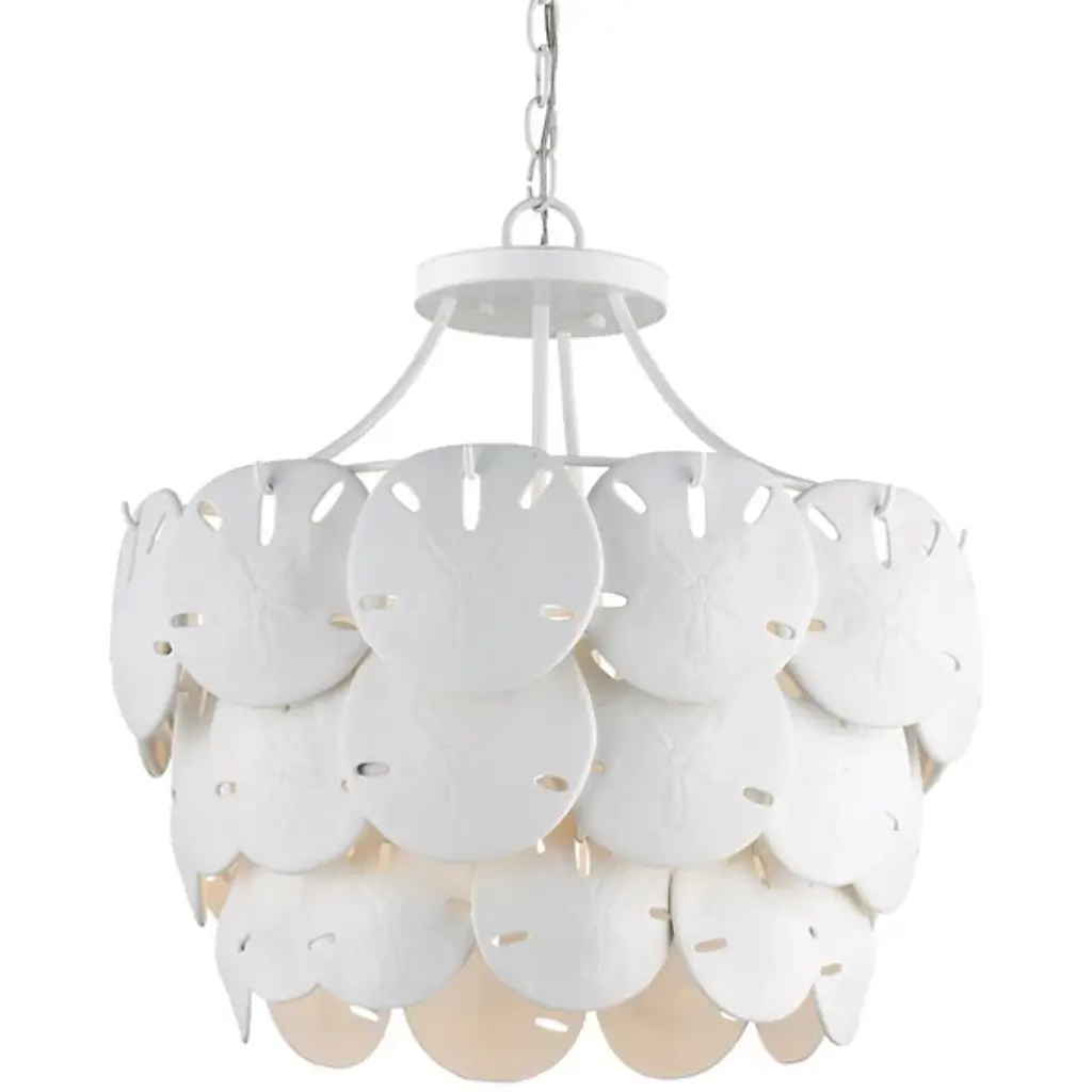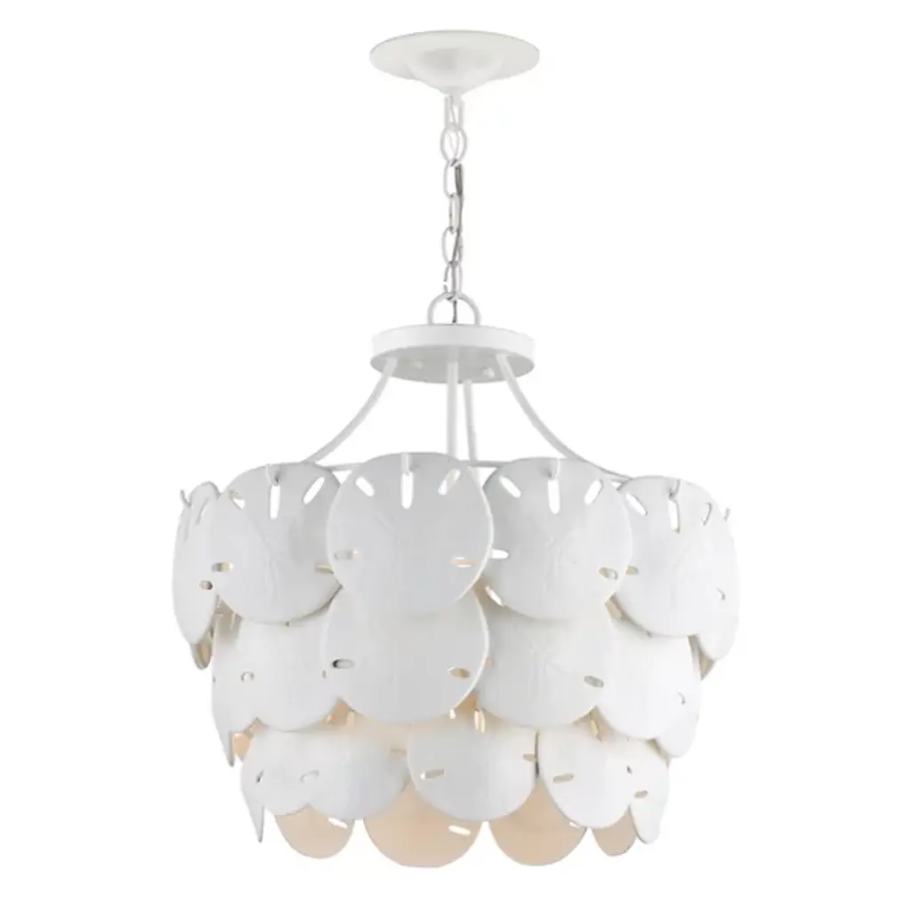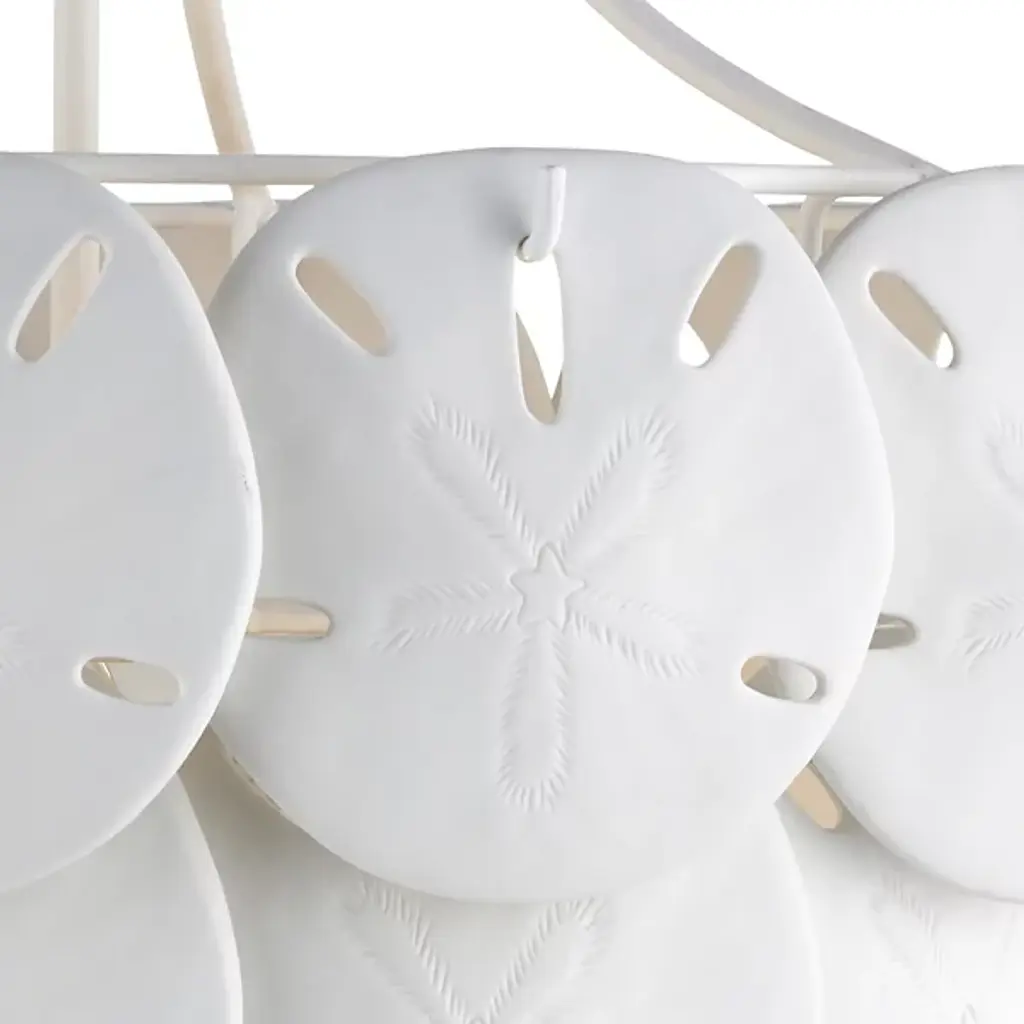 The Tulum Chandelier from Currey & Company delights with a coastal and nautical aesthetic, fashioned from a frame of wrought iron enhanced with delicate bone china shades. Designed by Marjorie Skouras and inspired by her home on the Yucatan Peninsula, it features semi-translucent ceramic sand dollars that create a soothing sound when brushed by the breeze. The sand dollars come in three sizes and are removable for easy dusting. At the same time, a sugar white finish on the metal hardware complements the pale discs, adding a nature-inspired, transitional style to its surroundings and making any room it is placed in subtly seaside-adjacent.