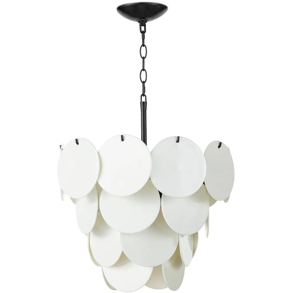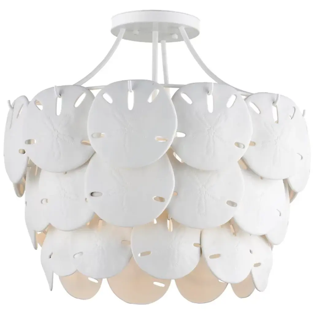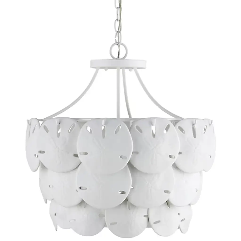 The Tulum Chandelier from Currey & Company delights with a coastal and nautical aesthetic, fashioned from a frame of wrought iron enhanced with delicate bone china shades. Designed by Marjorie Skouras and inspired by her home on the Yucatan Peninsula, it features semi-translucent ceramic sand dollars that create a soothing sound when brushed by the breeze. The sand dollars come in three sizes and are removable for easy dusting. At the same time, a sugar white finish on the metal hardware complements the pale discs, adding a nature-inspired, transitional style to its surroundings and making any room it is placed in subtly seaside-adjacent.