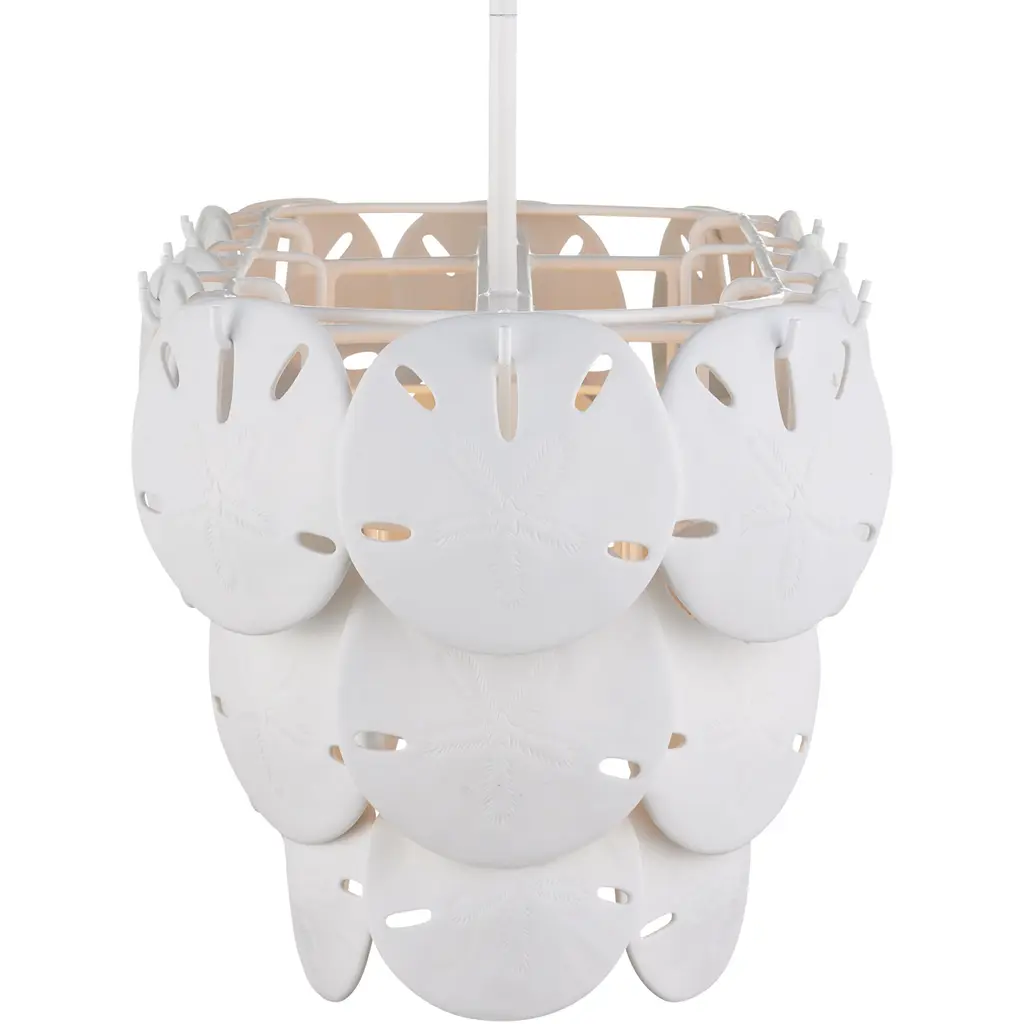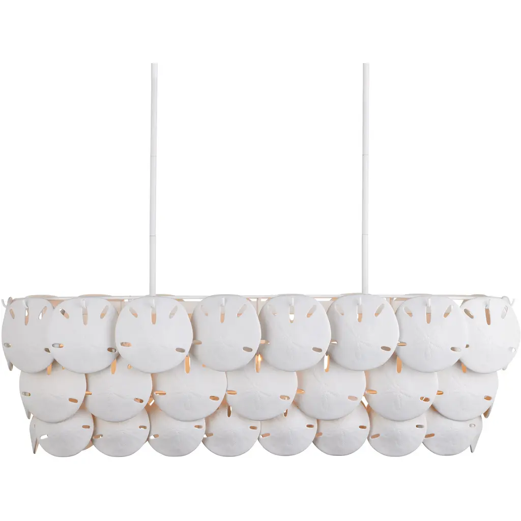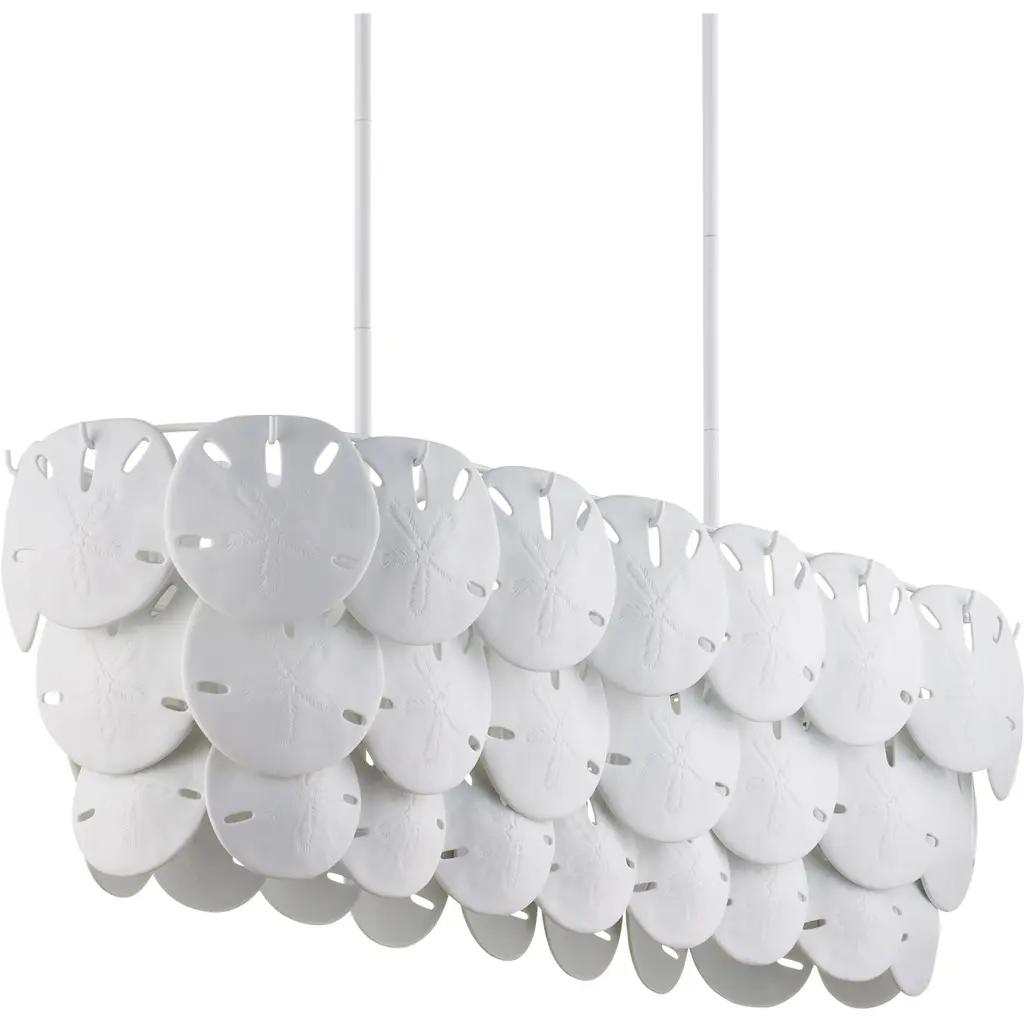 Marjorie Skouras designed the Tulum Oval Chandelier, inspired by the tropical beauty of the Yucatan Peninsula where she lives. This is an elegantly delicate design, as the sand dollars are cast in semi-translucent bone china and they make a pretty sound when a strong breeze ruffles them. There are three sizes of removable sand dollars on this design, which makes it easy to clean. The sugar white finish on the hardware complements the pale discs on this nature-inspired chandelier, making it apropos for rooms overlooking the ocean. Adjustable from 17.5" to 59.5" with use of included chain/rod kit/cable. If your space calls for a longer drop, additional chain/rods/cable is available for purchase.