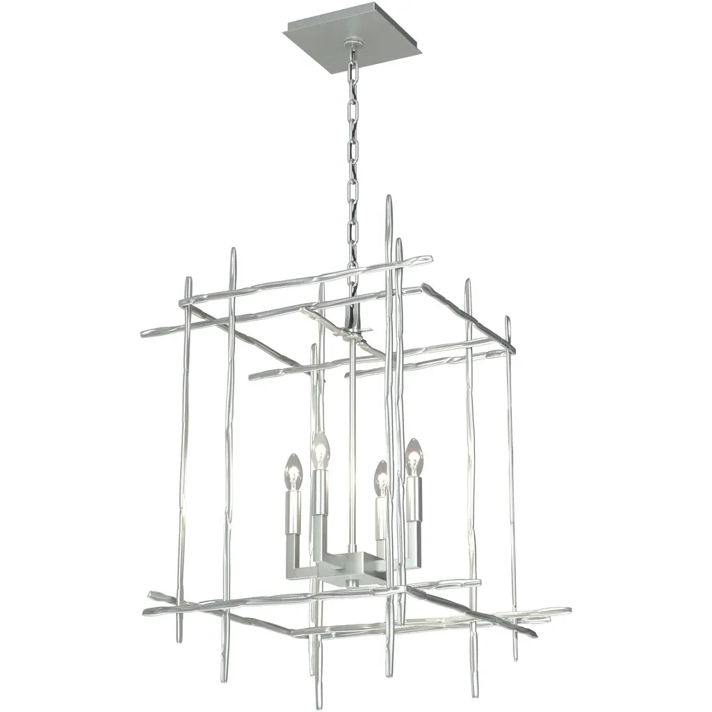 An impressive mid-sized hanging fixture, the Tura 4-Light Medium Pendant features hammered aluminum pieces that intersect at perpendicular angles to create an open cage-like structure that holds 4 candelabra bulbs within. A versatile size that is perfect for breakfast nooks, as a duo over a kitchen island, in a hallway or in any gathering space.