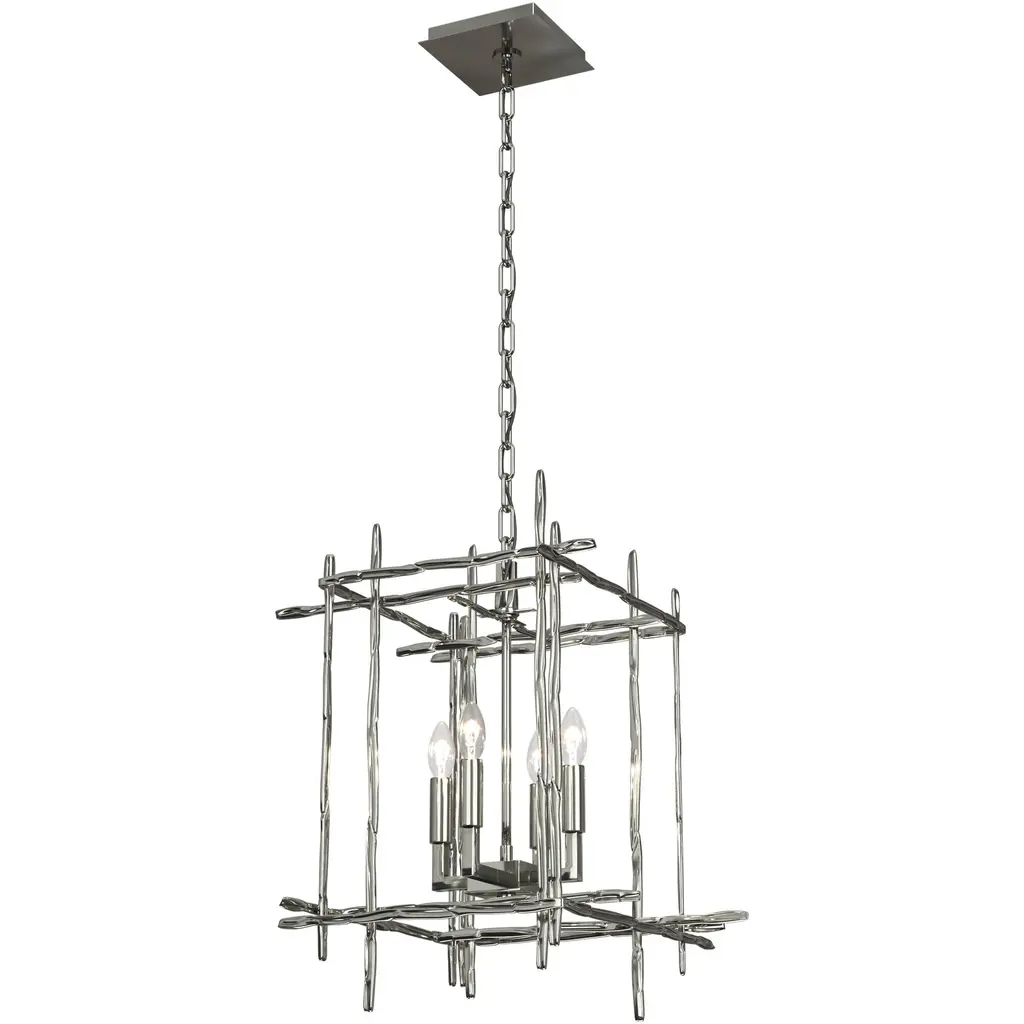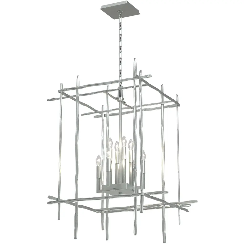 The Tura 8-Light Large Chandelier is the perfect focal piece for your dining room, foyer, great room or any living space. The chandelier has candelabra bulbs and an intersecting perpendicular structure of individually hammered aluminum pieces that look like organic twigs from nature.