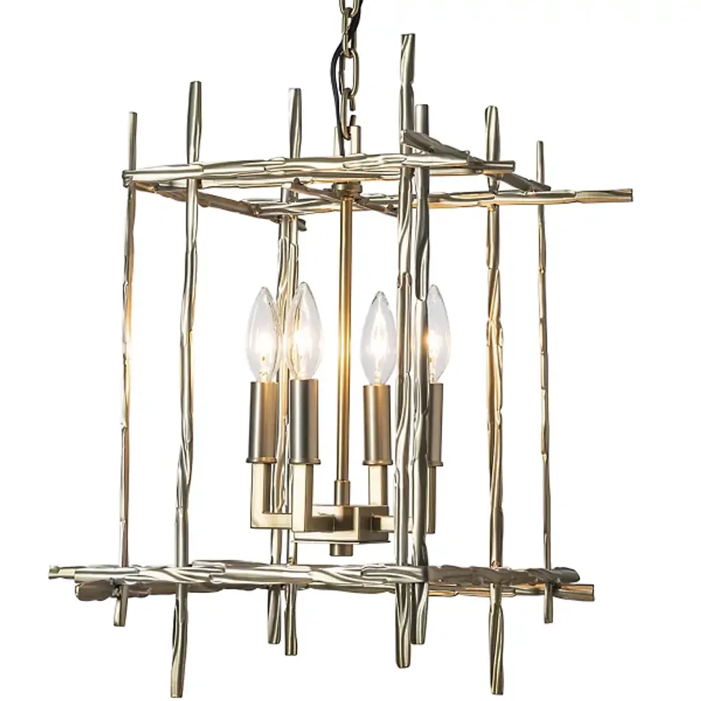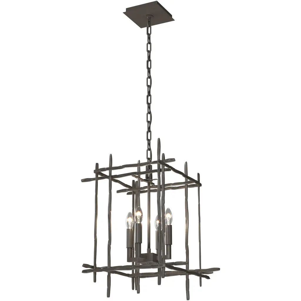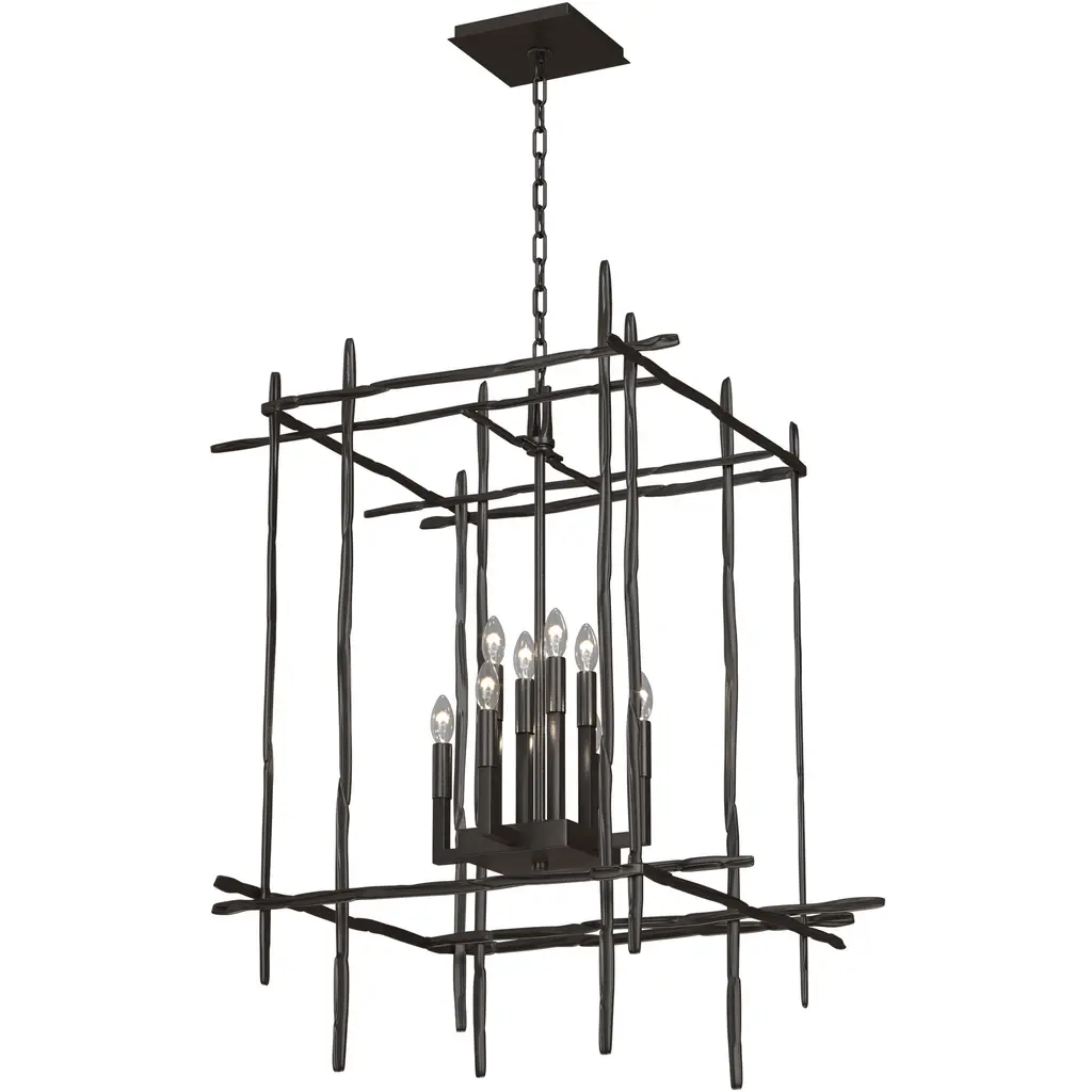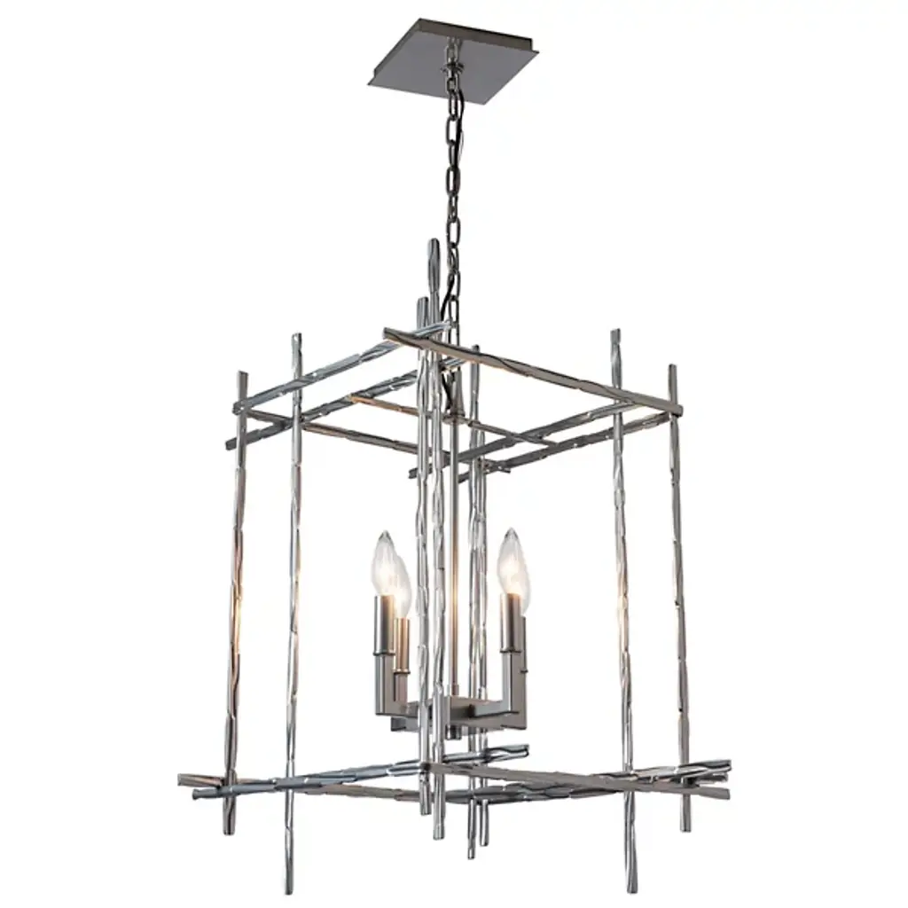 The ideal way to set a rustic yet elegant tone in modern foyers, kitchens or dining areas. The Tura Chandelier by Hubbardton Forge has numerous annealed aluminum bars arranged perpendicularly and welded together to form a cage-like structure around the array of exposed bulbs within. The bars have a deep, natural texture like twigs; this one-of-the-kind effect is produced by artisans in Vermont using specialty trip hammers and custom dies. Created by David Kitts.