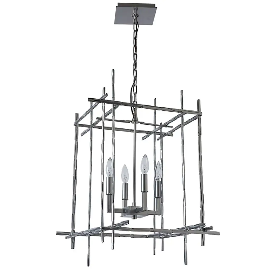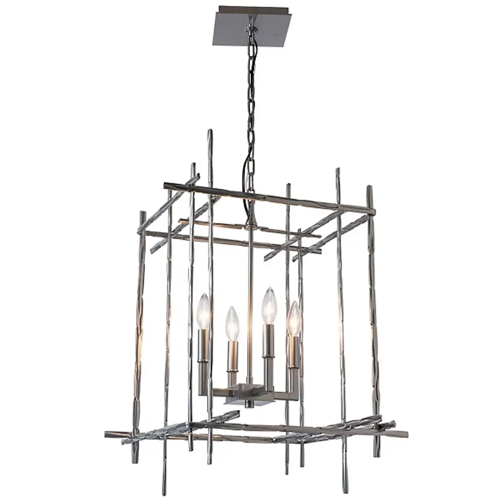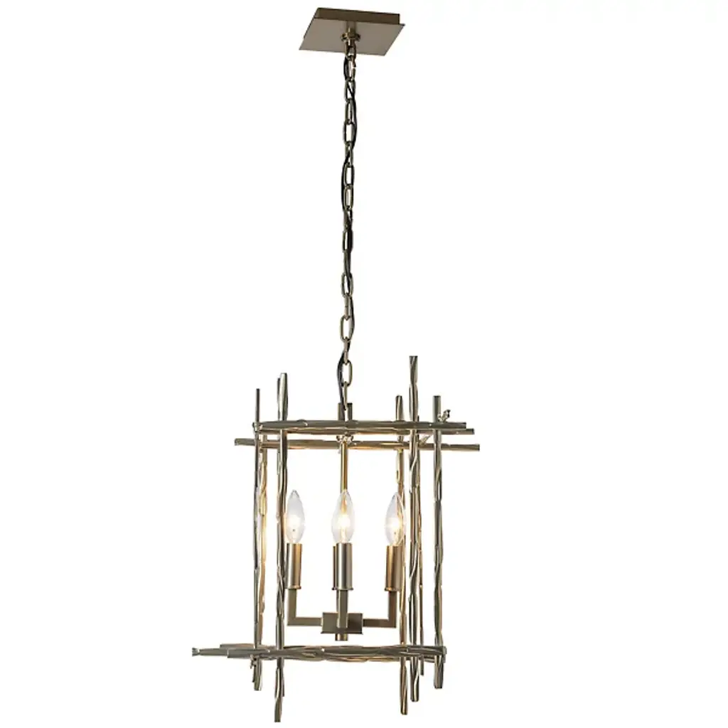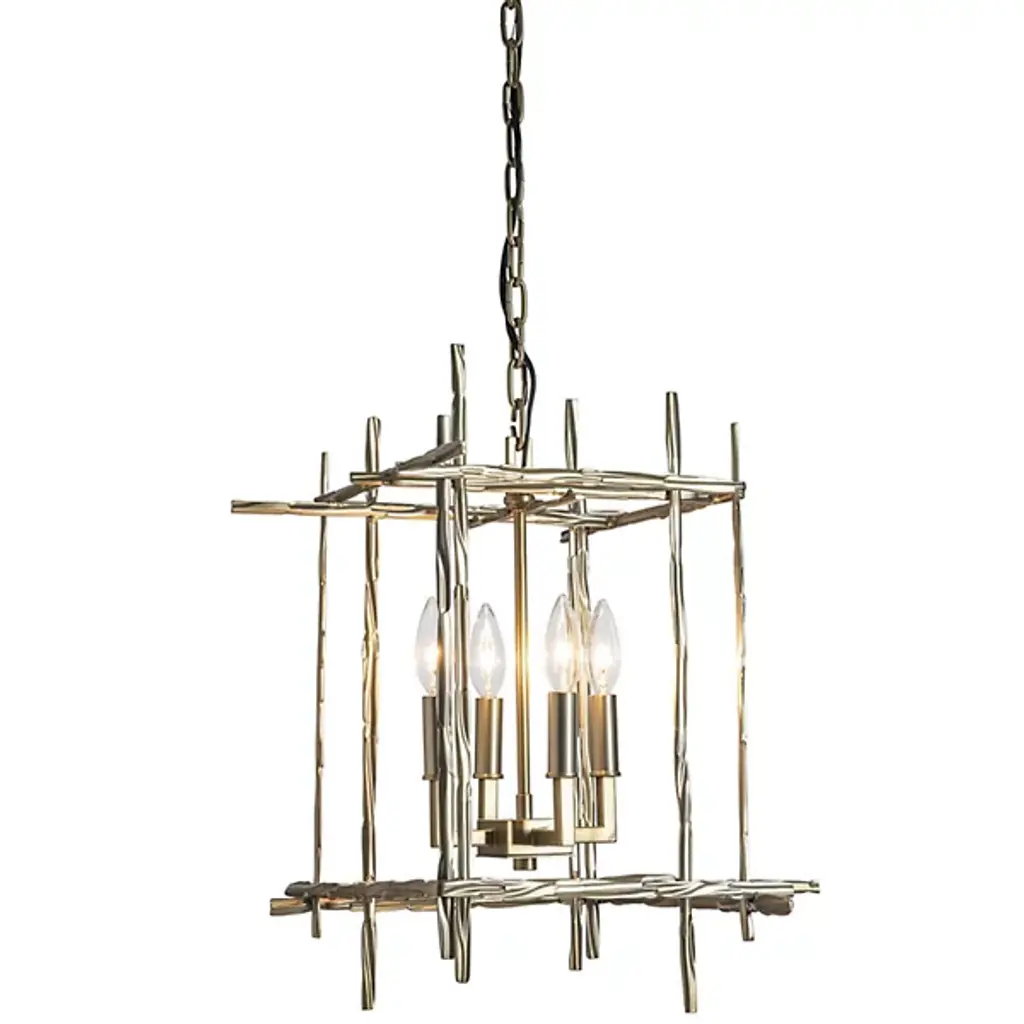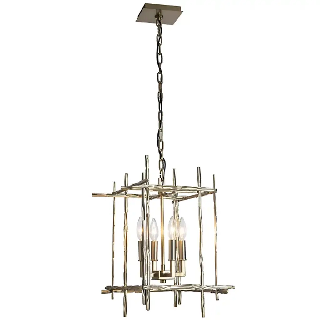 The ideal way to set a rustic yet elegant tone in modern foyers, kitchens or dining areas. The Tura Chandelier by Hubbardton Forge has numerous annealed aluminum bars arranged perpendicularly and welded together to form a cage-like structure around the array of exposed bulbs within. The bars have a deep, natural texture like twigs; this one-of-the-kind effect is produced by artisans in Vermont using specialty trip hammers and custom dies. Created by David Kitts.