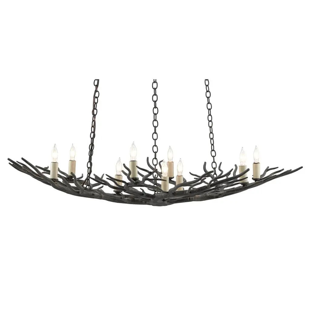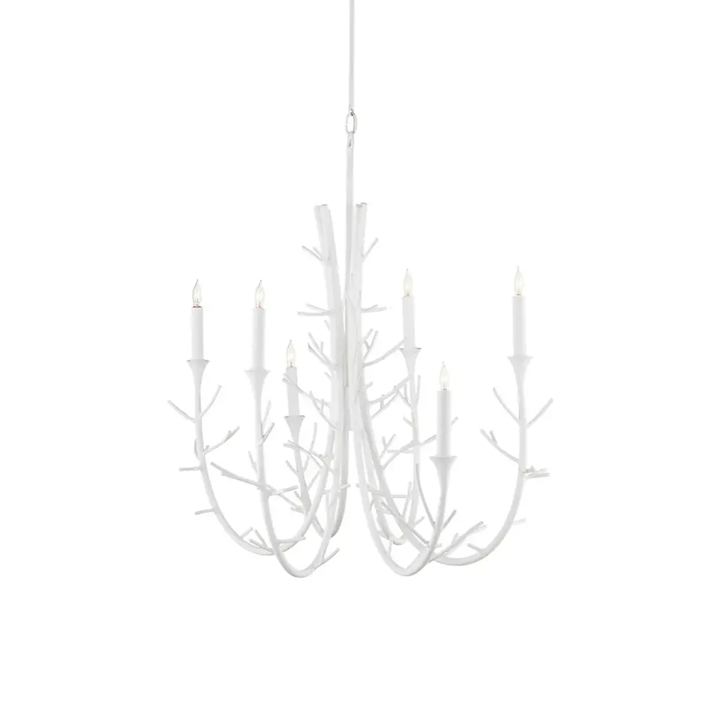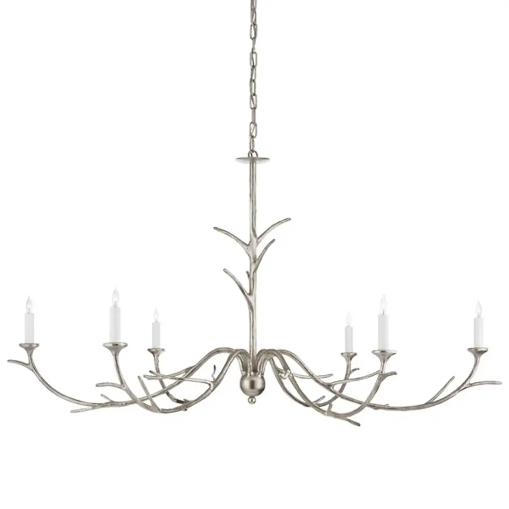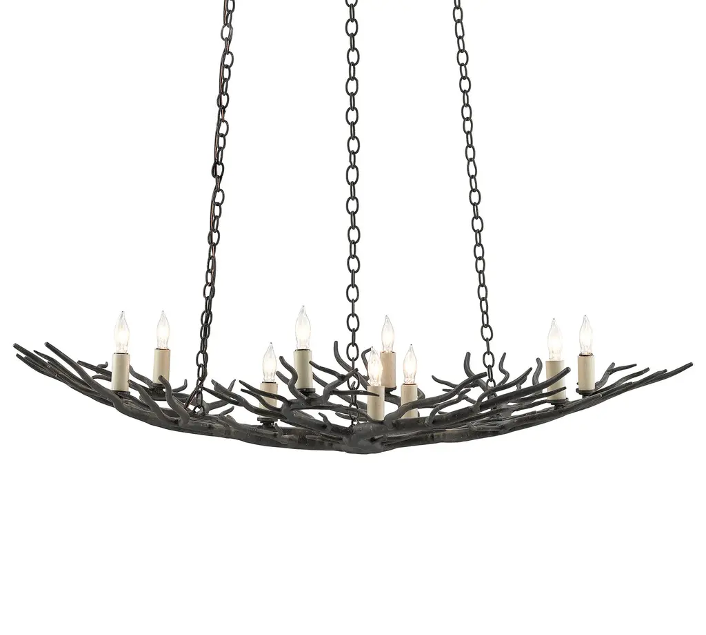 The Twiggy Oval Chandelier draws inspiration from snowy landscapes, with arcing limbs ornamented with spiky twigs. The design aims to capture the way snow collects on the leafless branches of trees, creating a visually striking and evocative piece. The gesso white wrought iron design is oblong, making it ideal for illuminating rectangular dining room tables or long kitchen islands. Adjustable from 47.5" to 112.5" with use of included chain/rod kit/cable. If your space calls for a longer drop, additional chain/rods/cable is available for purchase. Ships In 7-10 Business Days This image is for illustrative purposes only. The colors shown are accurate within the constraints of lighting, photography, and the color accuracy of your screen.