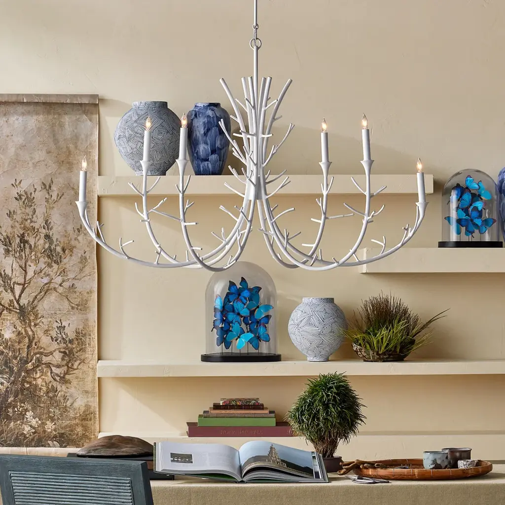 The Twiggy Oval Chandelier draws inspiration from snowy landscapes, with arcing limbs ornamented with spiky twigs. The design aims to capture the way snow collects on the leafless branches of trees, creating a visually striking and evocative piece. The gesso white wrought iron design is oblong, making it ideal for illuminating rectangular dining room tables or long kitchen islands. Adjustable from 47.5" to 112.5" with use of included chain/rod kit/cable. If your space calls for a longer drop, additional chain/rods/cable is available for purchase. Ships In 7-10 Business Days This image is for illustrative purposes only. The colors shown are accurate within the constraints of lighting, photography, and the color accuracy of your screen.