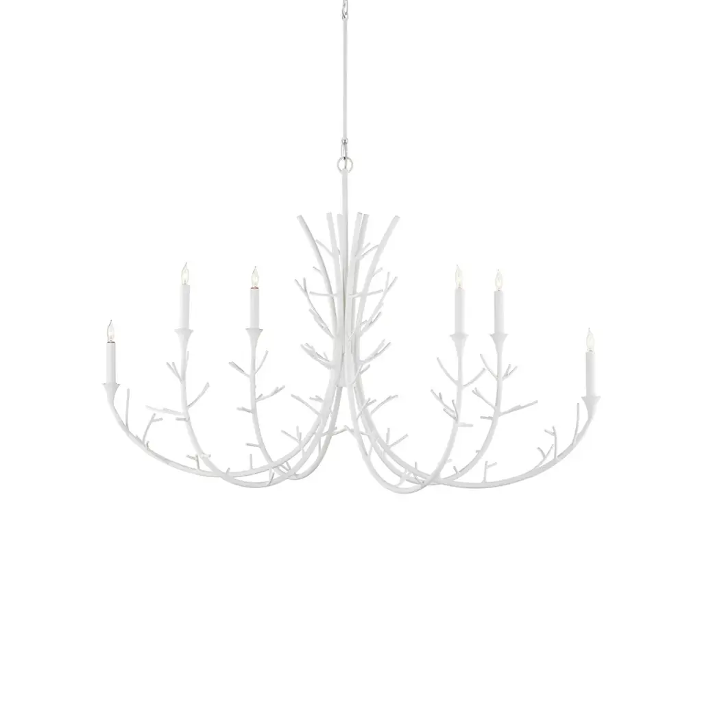 The Twiggy Oval Chandelier draws inspiration from snowy landscapes, with arcing limbs ornamented with spiky twigs. The design aims to capture the way snow collects on the leafless branches of trees, creating a visually striking and evocative piece. The gesso white wrought iron design is oblong, making it ideal for illuminating rectangular dining room tables or long kitchen islands. Adjustable from 47.5" to 112.5" with use of included chain/rod kit/cable. If your space calls for a longer drop, additional chain/rods/cable is available for purchase. Ships In 7-10 Business Days This image is for illustrative purposes only. The colors shown are accurate within the constraints of lighting, photography, and the color accuracy of your screen.