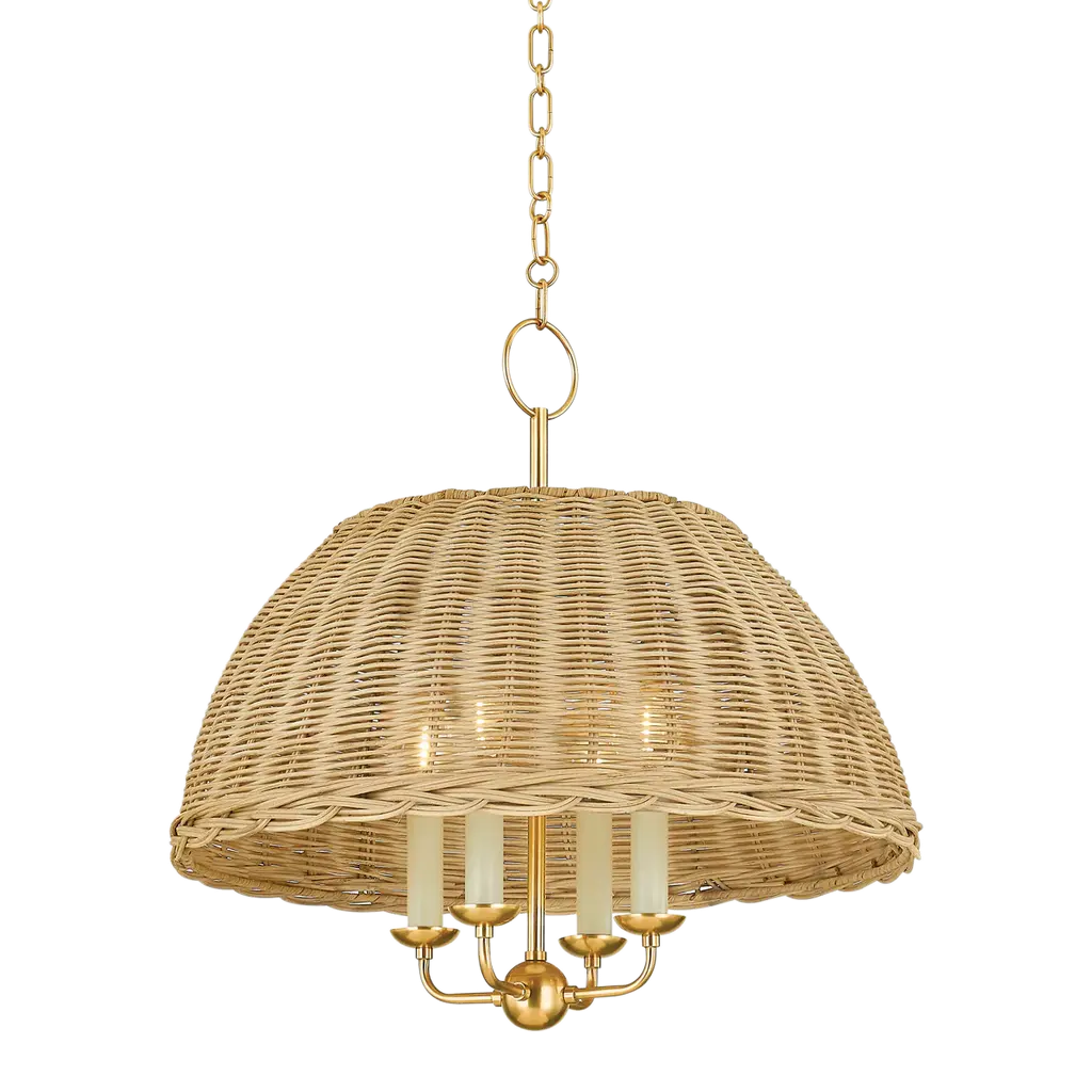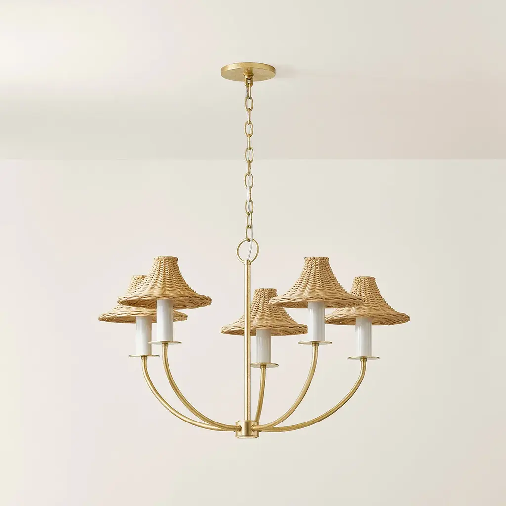 Merging a handmade aesthetic with a sense of luxury, the style-forward Twila combines natural rattan and Vintage Gold Leaf. The white candle and goose neck arm give this fixture an heirloom feel. The slight flip in the shade and light filtering through the rattan weave add to the beauty of the fixture. As both a sconce and a chandelier, Twila brings effortless sophistication to any space. *Due to the one-of-a-kind nature of the medium, exact colors and patterns may vary slightly from the image shown.