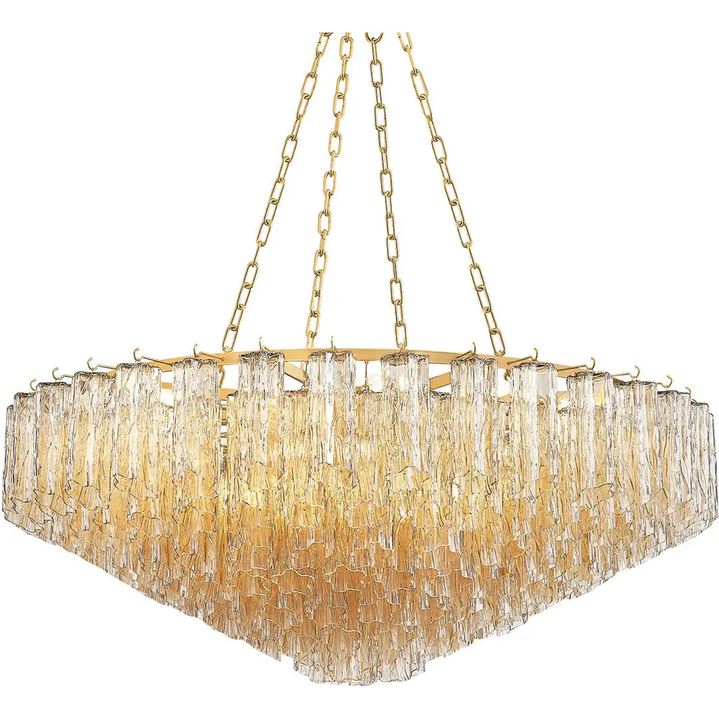 Twilight twenty-four-light chandelier with five tiers of slumped glass panels with gold-leaf gradations. Candelabra Base, 60 Watt Max, 24 Type B Bulbs, Canopy: 6", Chain: Five pieces of 10' (included)