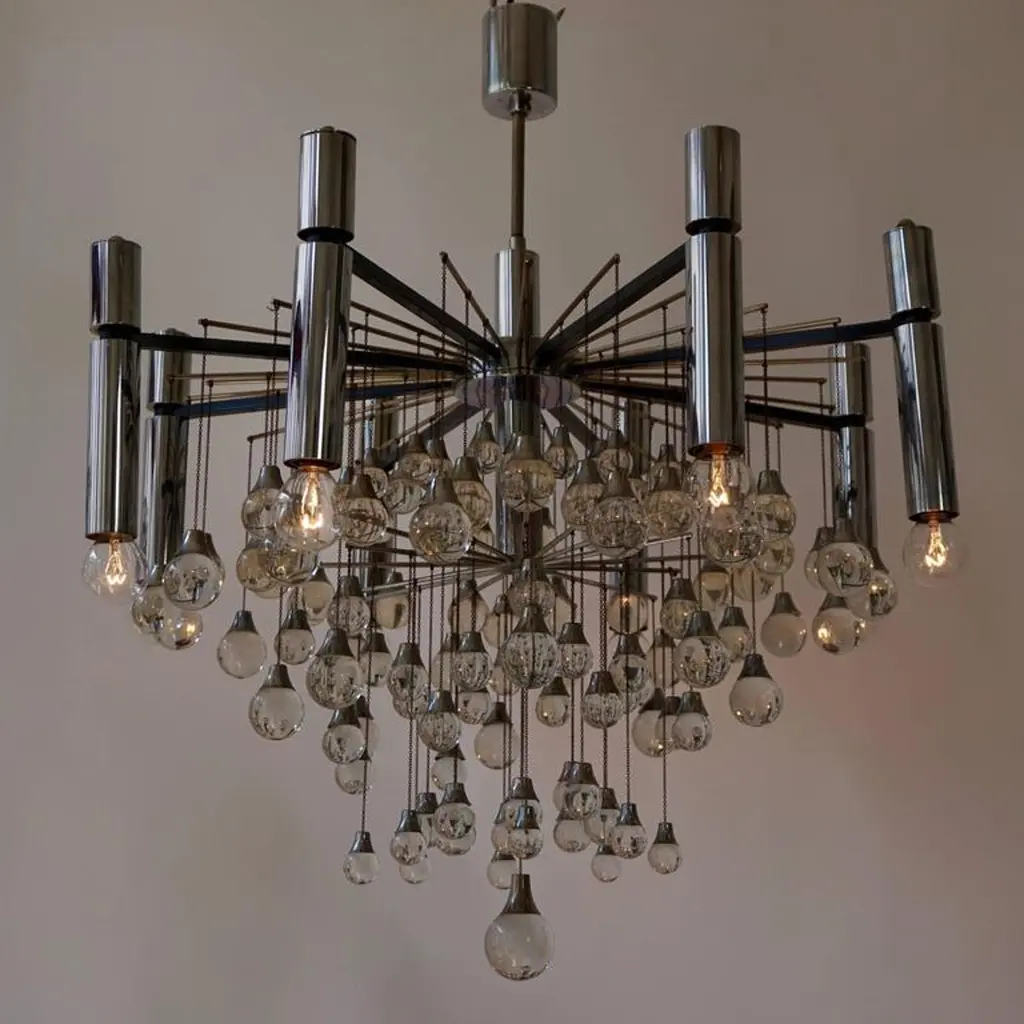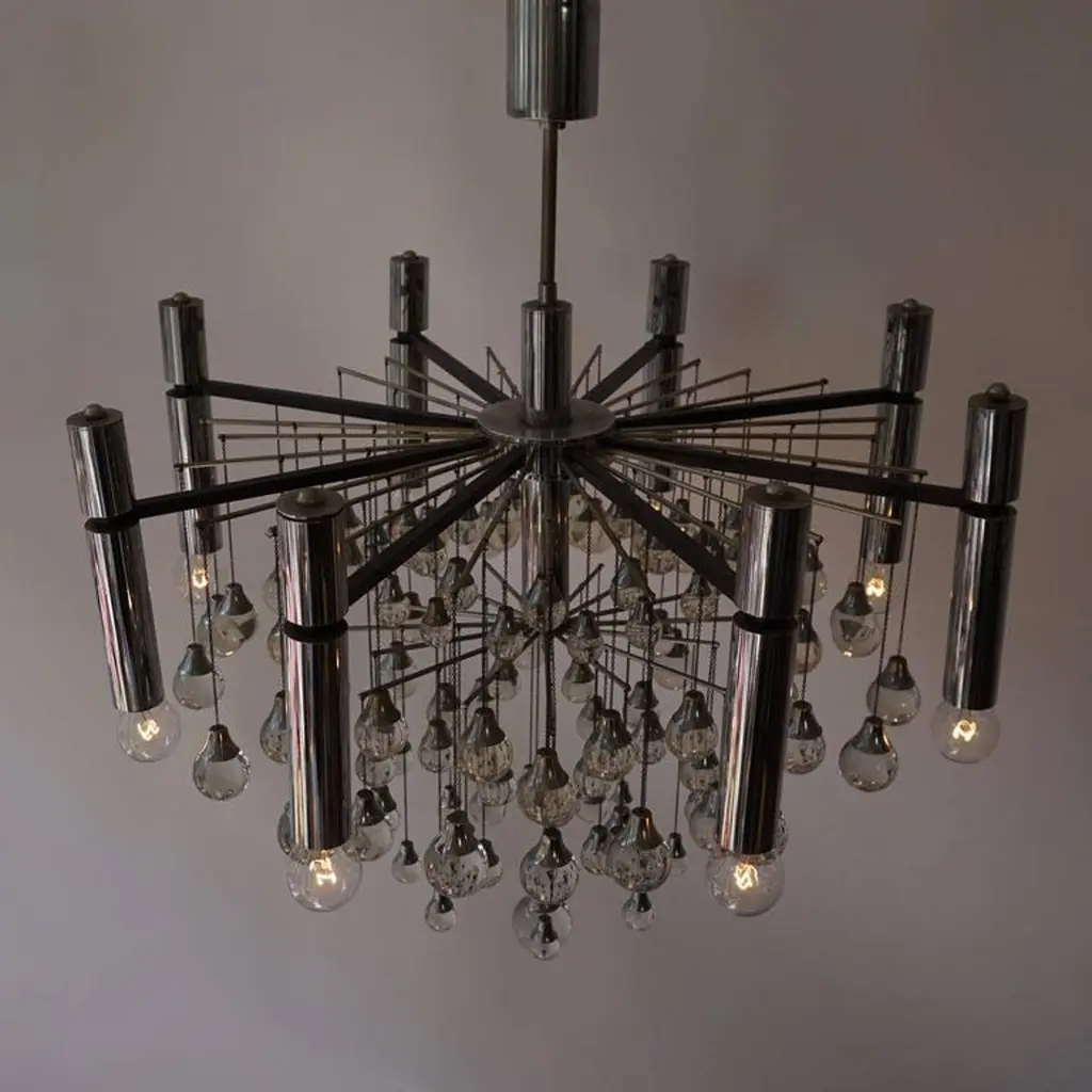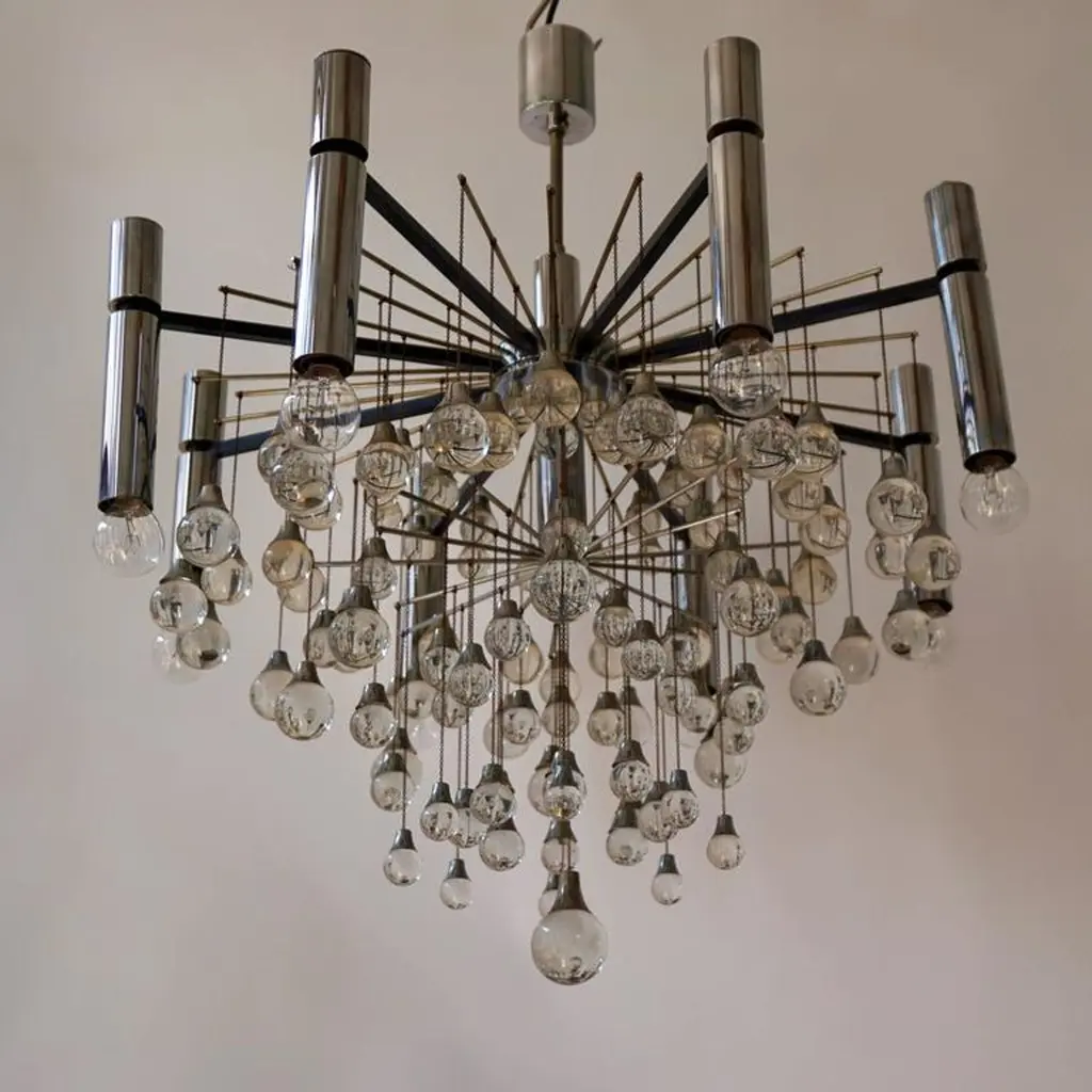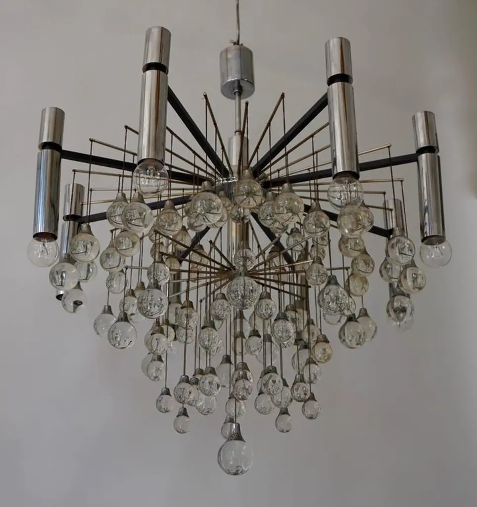 Two Gaetano Sciolari Crystal Drops Chandeliers.Materials: Round lampshade made of chromed metal rods, tubes and parts in iron and brass. Black rectangular rods. Thin brass rods. Crystal bubble glass beads or pearls in a drop form. Metal chains. Chrome rod and canopy. 8 Bakelite E14 sockets.Total Height: 75 cm / 37.79”Width: ∅ 65 cm / 21.25”Electricity: 8 bulbs E14, 8 x 40 watt maximum, 110/220 volt.Any type of light bulb can be used, not a specific one preferred.Period: 1960s, 1980s – Mid-Century Modern.Designer: Gaetano Sciolari (1927-1994).Angelo Gaetano SciolariAngelo Sciolari graduated with a degree in architecture but wanted to be a filmmaker. This course came to an abrupt end when in 1949 his father suddenly died and he took over the Sciolari Lighting company at the age of 22.His first designs in the late 1950s were Sputnik inspired chandeliers such as this one; of course it was the space age.In the 1960s he created refined, futuristic and sharp classical style chandeliers. Lines were clean and sculptural and materials such as crystal and ice glass sparkled with a voluptuously luxurious coolness and he started combining brass with chrome.He led the family business with a passionate vision and within years, he expanded the business and started working with other light companies worldwide.Gaetano Sciolari created lights for Stilnovo and Stilkronen (Italy), Lightolier and Progress Lighting (USA), S.A. Boulanger (Belgium), Helestra and Leola (West Germany), Lyfa (Denmark) and some other companies and of course for his own Italian family business; the Sciolari company in Rome and Milan; where all the lighting business at that time was present.Sciolari was the founder and the first president of the trade association of Italian manufacturers of lighting fixtures, the AIDI. The Associazione Italiana di Illuminazione was founded in 1958 and still exists today.Measures: Diameter 65 cm.Height 75 cm.Eight E14 bulbs.