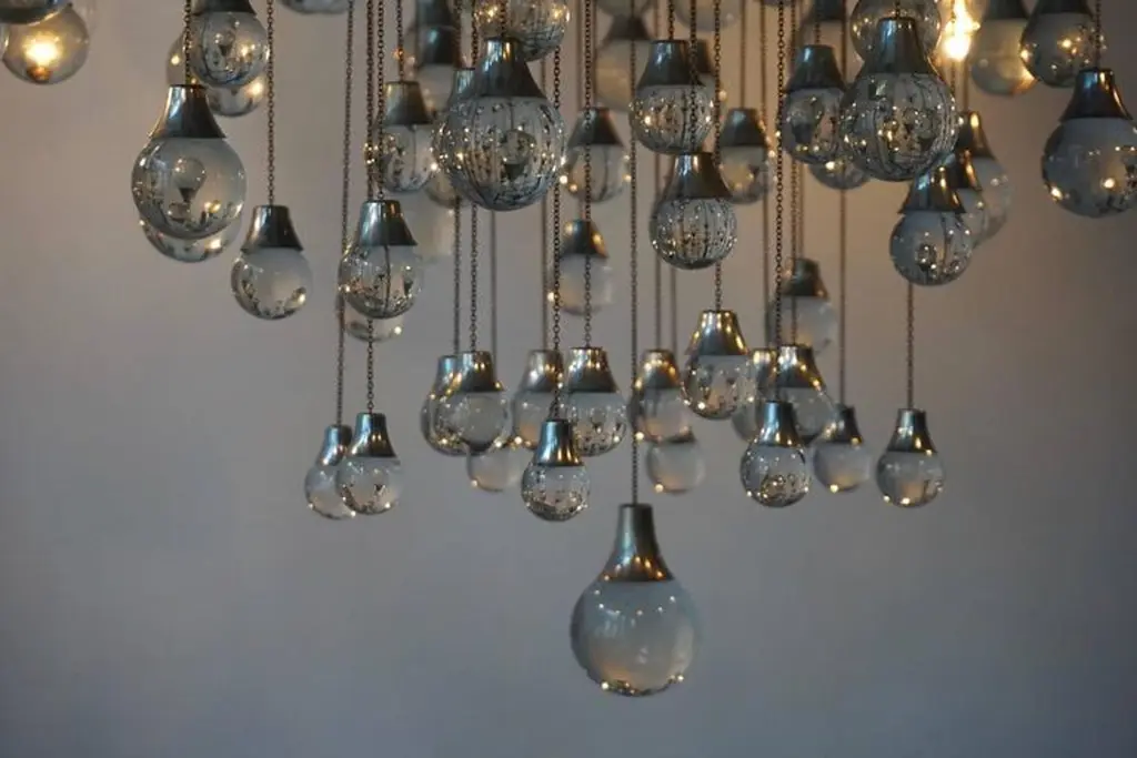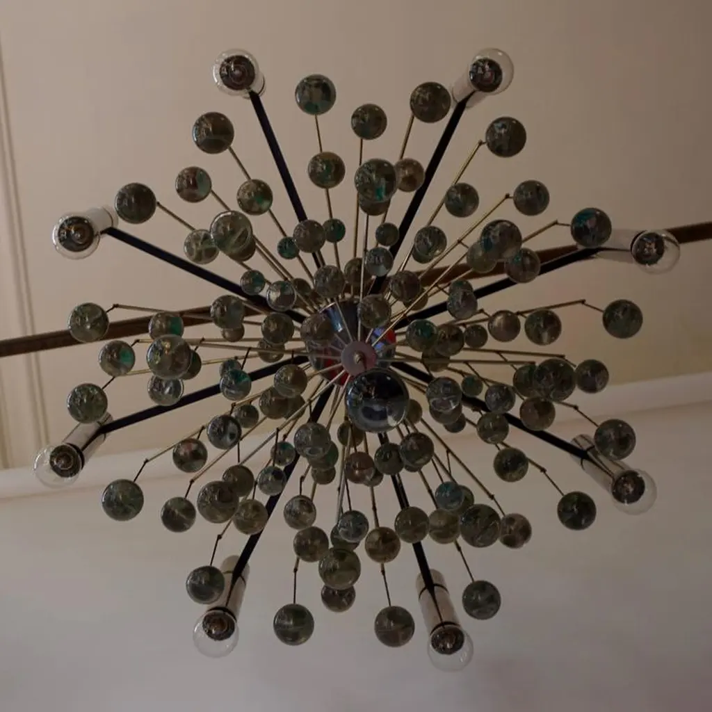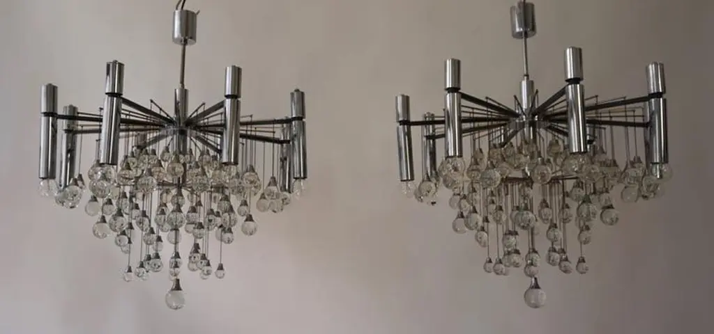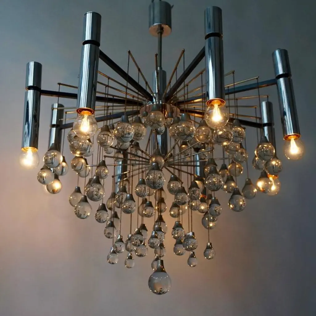 Two Gaetano Sciolari Crystal Drops Chandeliers.Materials: Round lampshade made of chromed metal rods, tubes and parts in iron and brass. Black rectangular rods. Thin brass rods. Crystal bubble glass beads or pearls in a drop form. Metal chains. Chrome rod and canopy. 8 Bakelite E14 sockets.Total Height: 75 cm / 37.79”Width: ∅ 65 cm / 21.25”Electricity: 8 bulbs E14, 8 x 40 watt maximum, 110/220 volt.Any type of light bulb can be used, not a specific one preferred.Period: 1960s, 1980s – Mid-Century Modern.Designer: Gaetano Sciolari (1927-1994).Angelo Gaetano SciolariAngelo Sciolari graduated with a degree in architecture but wanted to be a filmmaker. This course came to an abrupt end when in 1949 his father suddenly died and he took over the Sciolari Lighting company at the age of 22.His first designs in the late 1950s were Sputnik inspired chandeliers such as this one; of course it was the space age.In the 1960s he created refined, futuristic and sharp classical style chandeliers. Lines were clean and sculptural and materials such as crystal and ice glass sparkled with a voluptuously luxurious coolness and he started combining brass with chrome.He led the family business with a passionate vision and within years, he expanded the business and started working with other light companies worldwide.Gaetano Sciolari created lights for Stilnovo and Stilkronen (Italy), Lightolier and Progress Lighting (USA), S.A. Boulanger (Belgium), Helestra and Leola (West Germany), Lyfa (Denmark) and some other companies and of course for his own Italian family business; the Sciolari company in Rome and Milan; where all the lighting business at that time was present.Sciolari was the founder and the first president of the trade association of Italian manufacturers of lighting fixtures, the AIDI. The Associazione Italiana di Illuminazione was founded in 1958 and still exists today.Measures: Diameter 65 cm.Height 75 cm.Eight E14 bulbs.