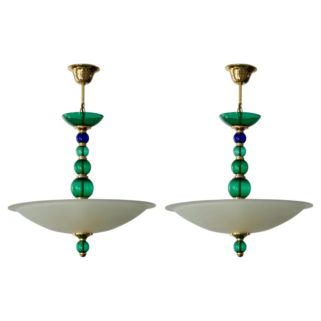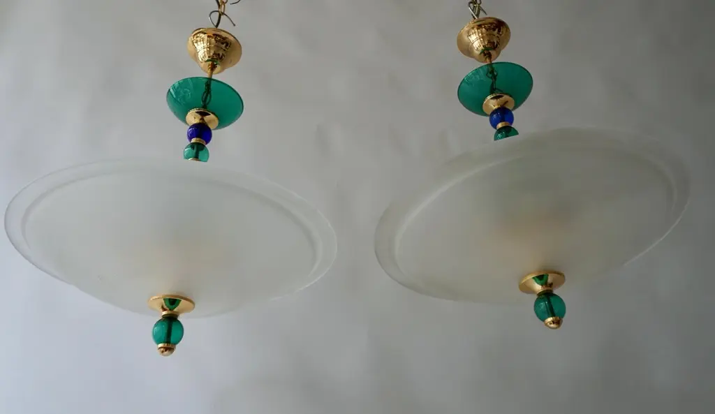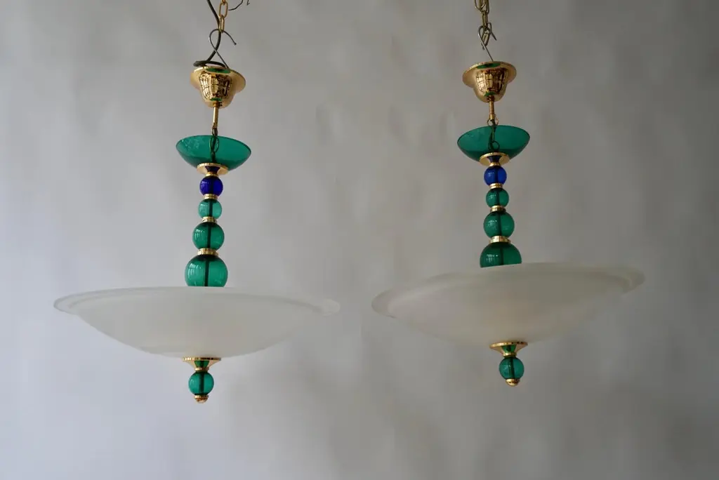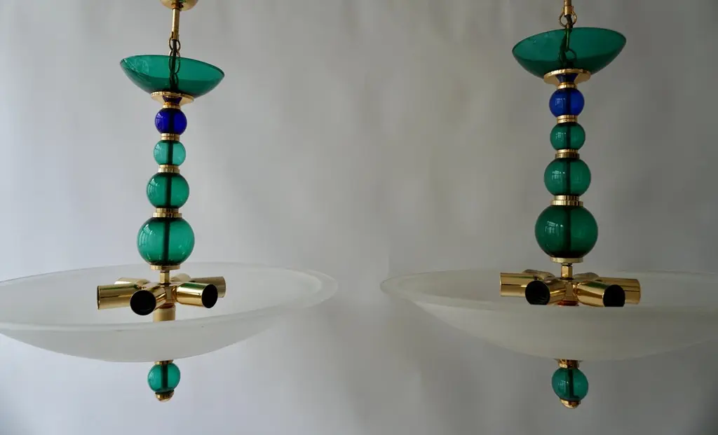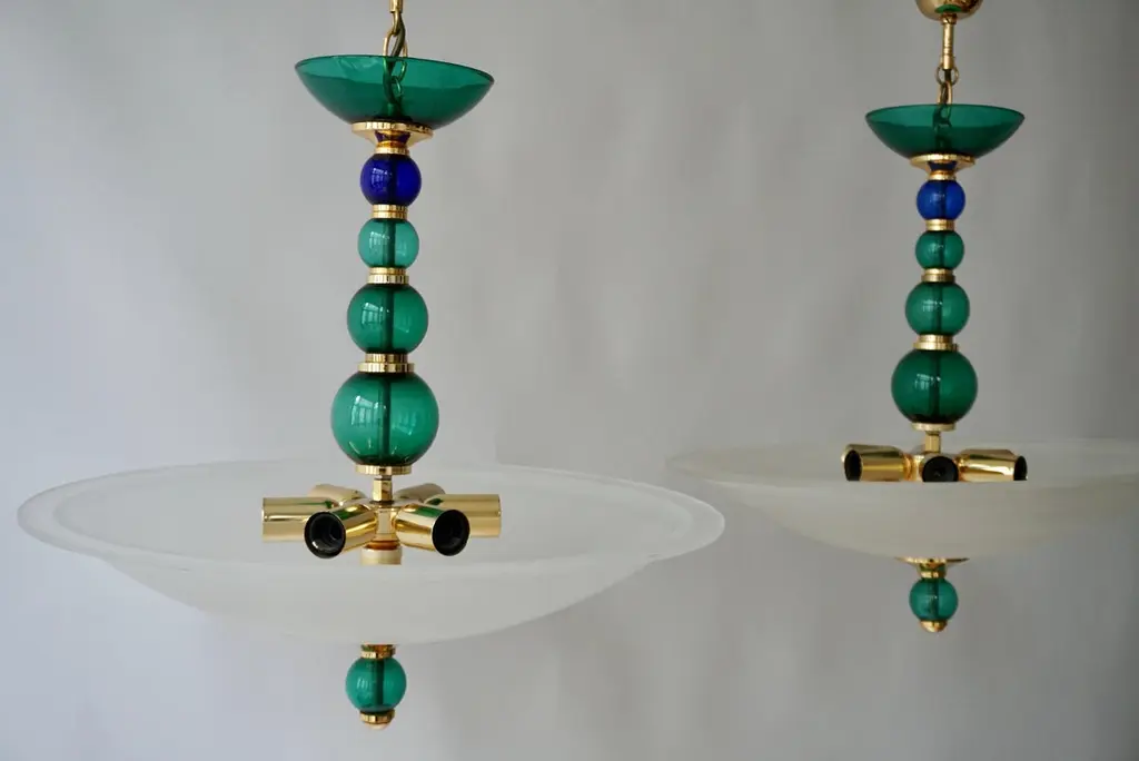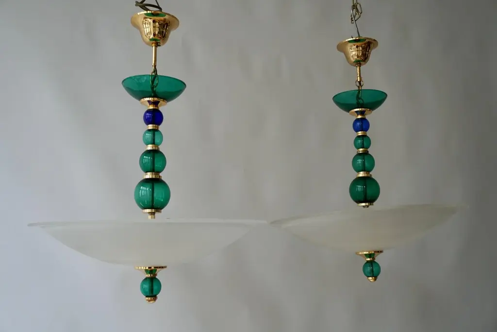 Two Murano glass pendant lights by F Fabbian, Italy, 1970s. Large pair Italian ceiling lights in blue and green Murano glass.Consisting of a beautiful round shaped and wit colored glass bowl, mounted on and decorated with brass. Due the combination of materials and forms these lights will create an absolute stunning light-partition.The light requires six single E14 screw fit lightbulbs (40 Watt max.) LED compatible.The height without the chain and ceiling plate is 48 cm.Please note that price is per item not for the set.