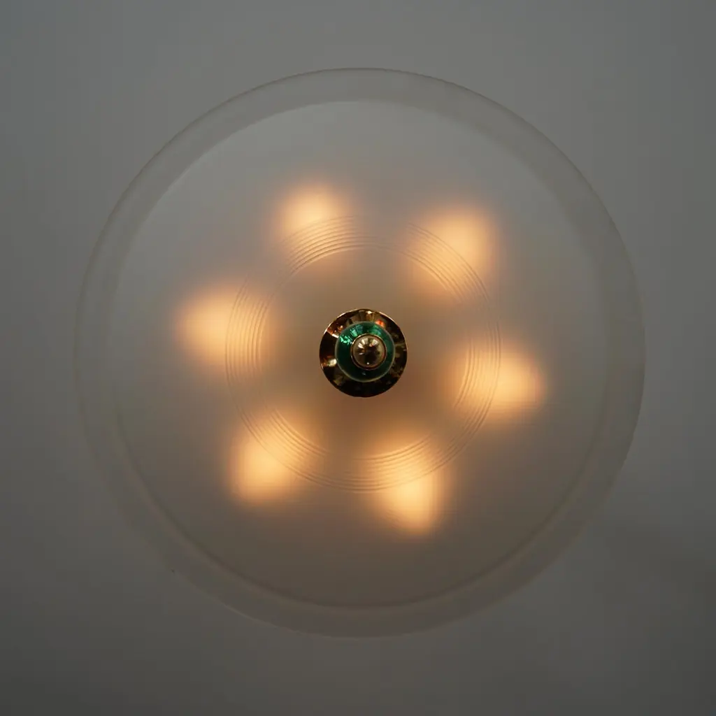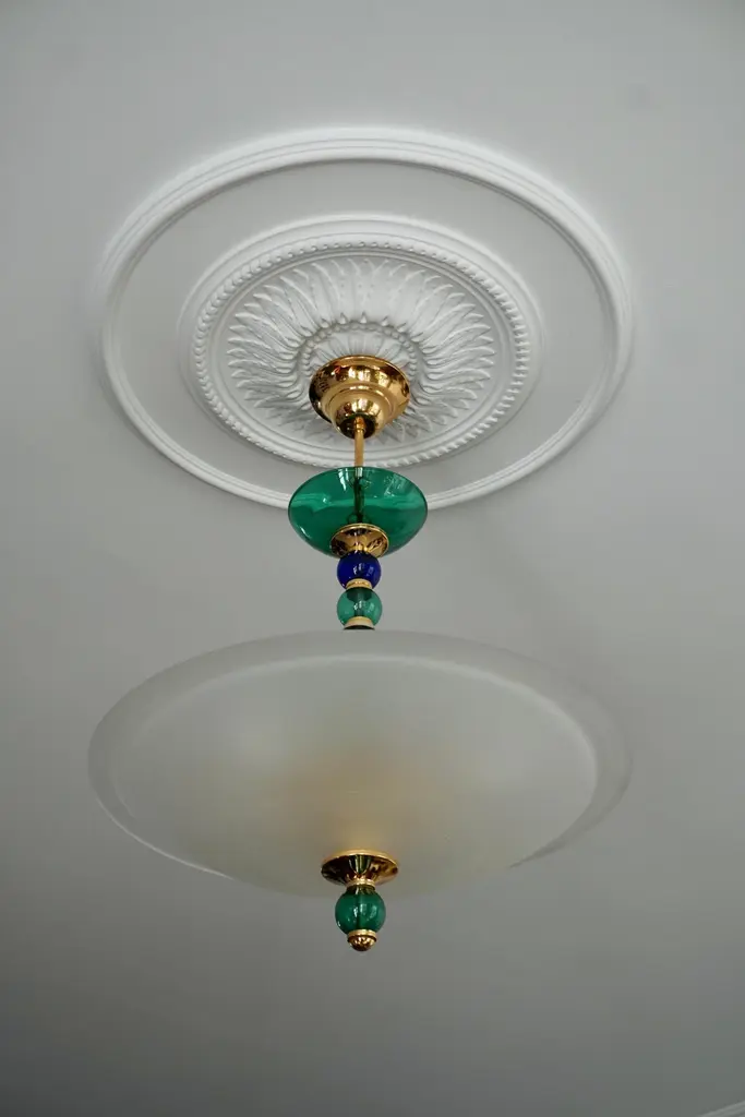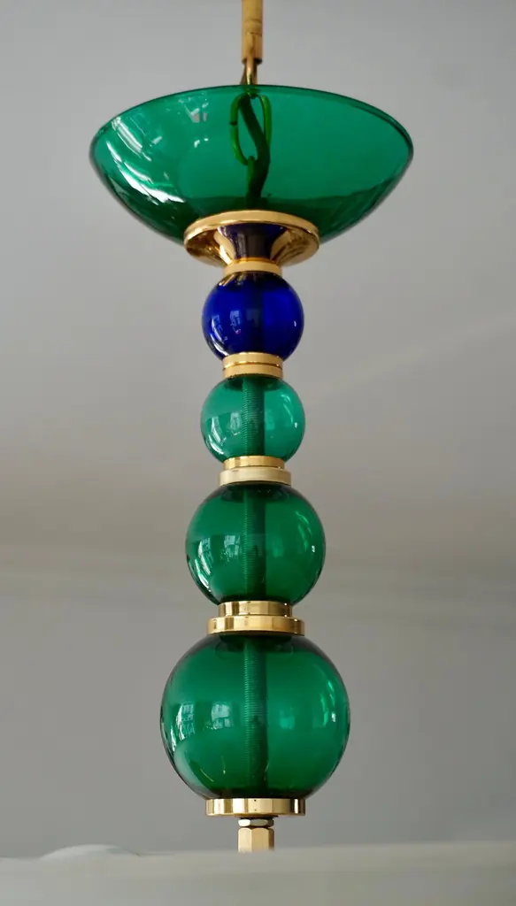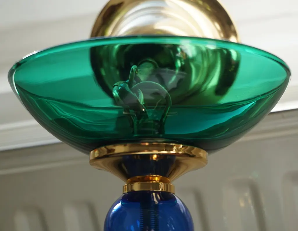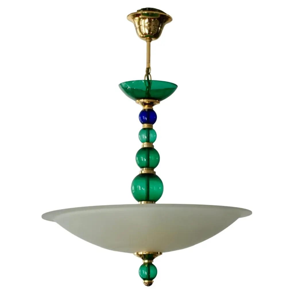 Two Murano glass pendant lights by F Fabbian, Italy, 1970s. Large pair Italian ceiling lights in blue and green Murano glass.Consisting of a beautiful round shaped and wit colored glass bowl, mounted on and decorated with brass. Due the combination of materials and forms these lights will create an absolute stunning light-partition.The light requires six single E14 screw fit lightbulbs (40 Watt max.) LED compatible.The height without the chain and ceiling plate is 48 cm.Please note that price is per item not for the set.