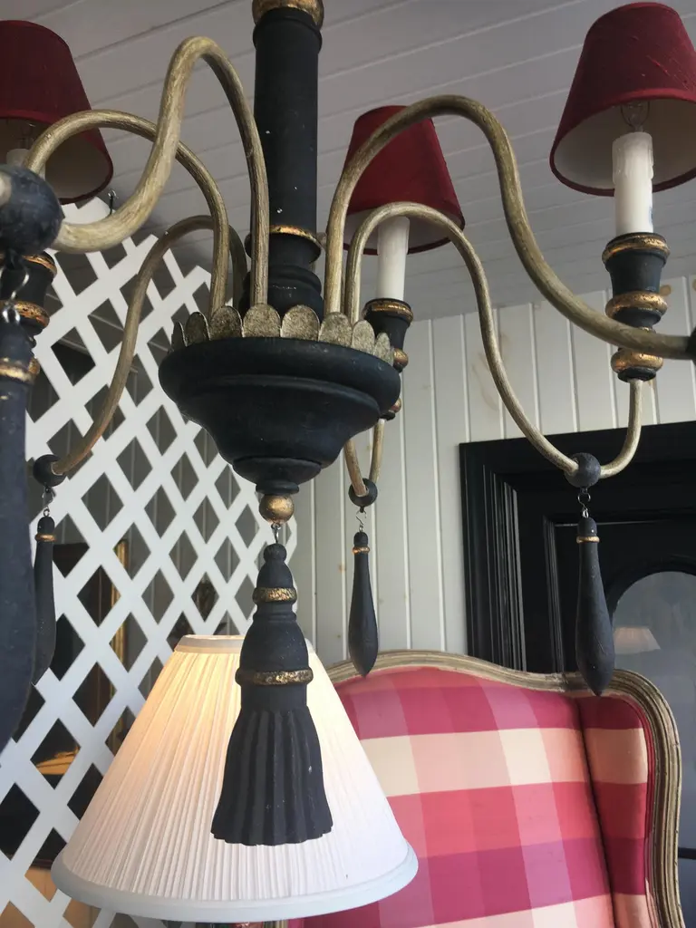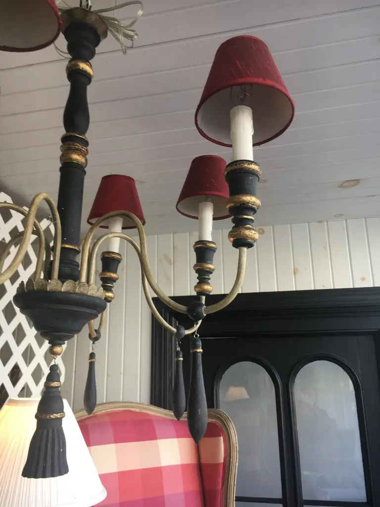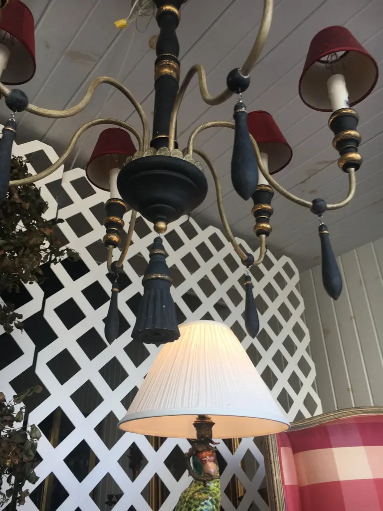 Two Regency Style Six-Arm Chandeliers With Ebonized Finish Gilt Details