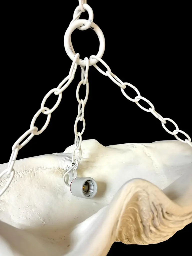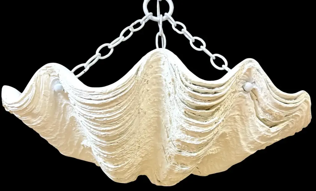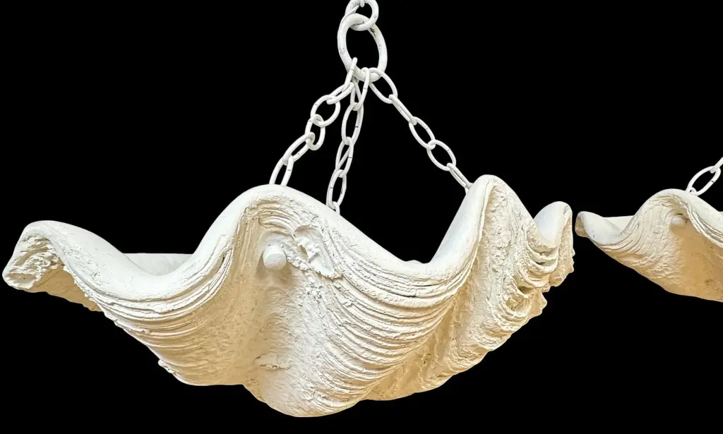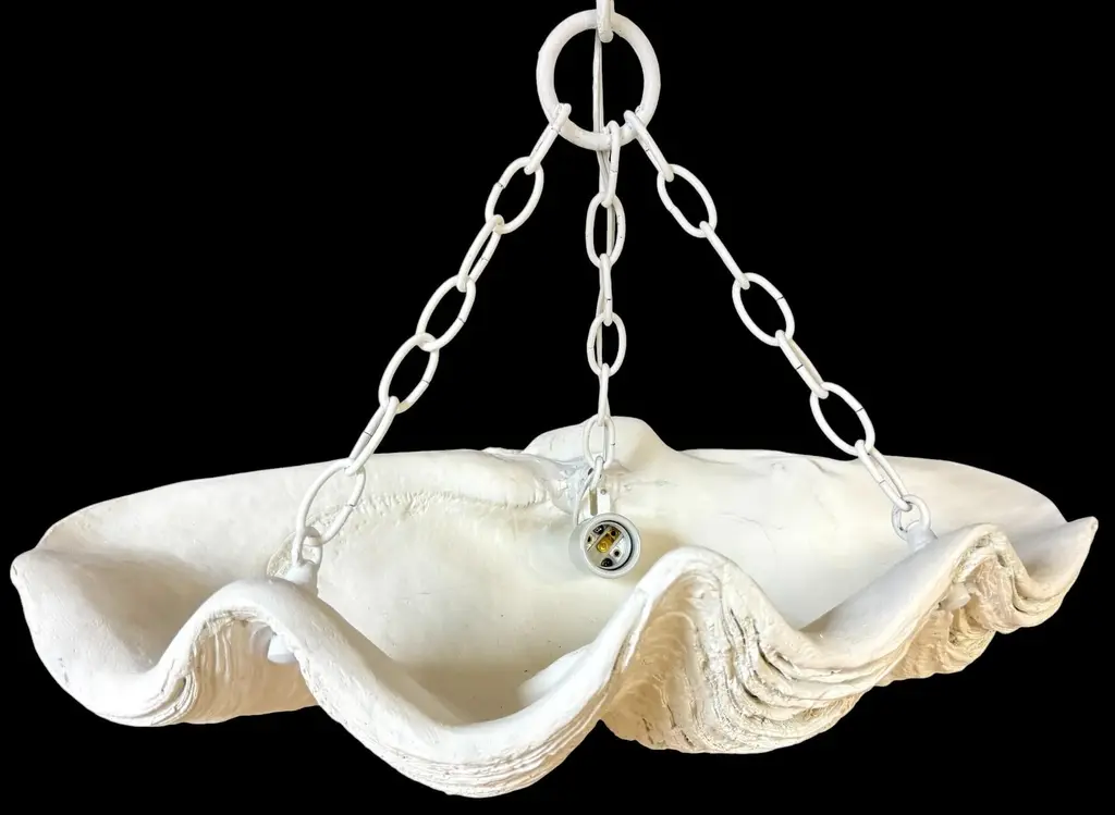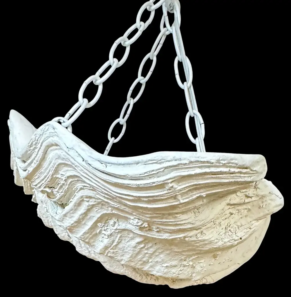 Two Serge Roche Attributed Cast Lacquered Plaster Clam Shell Chandelier Of the period, France, circa 1950s, attributed to Serge Roche (1898-1988) Sold individually. Two Serge Roche attributed cast and painted plaster clamshell chandeliers, from France and dating back to the 1950s. Each chandelier is a stunning example of mid-century design, reflecting Roche’s mastery in creating sculptural lighting pieces. These chandeliers are offered individually. Each chandelier is made from cast plaster, weighing over 25 pounds, and features a meticulously modeled clam shell design. The shell itself measures 6 inches in height, 22 inches in width, and 14 inches in depth, making it a substantial and sculptural work. The chandelier has a 16-inch drop and comes with 40 inches of chain, which has been replaced. Additionally, the chandelier has been rewired and is fitted to accommodate one standard US bulb, providing a soft ambient light. This chandelier is not only a functional lighting piece but also a work of art that adds the elegance and sophistication of French modern design to any room. Oh verall Measurements: Chandelier 16 inches high to ring/40 inches of chain Clam shell alone. 6 inches high x 22 inches wide x 14 inches deep