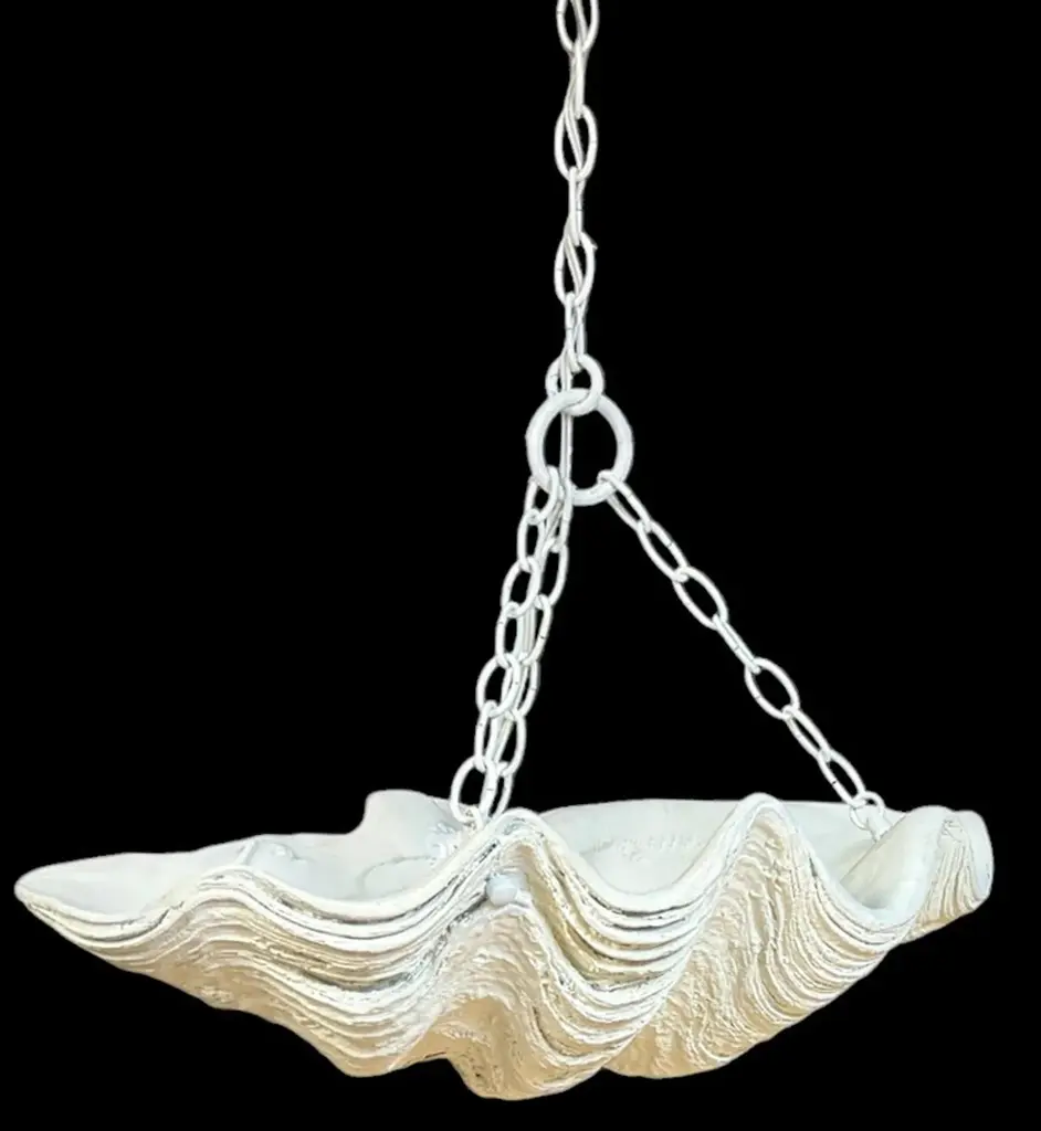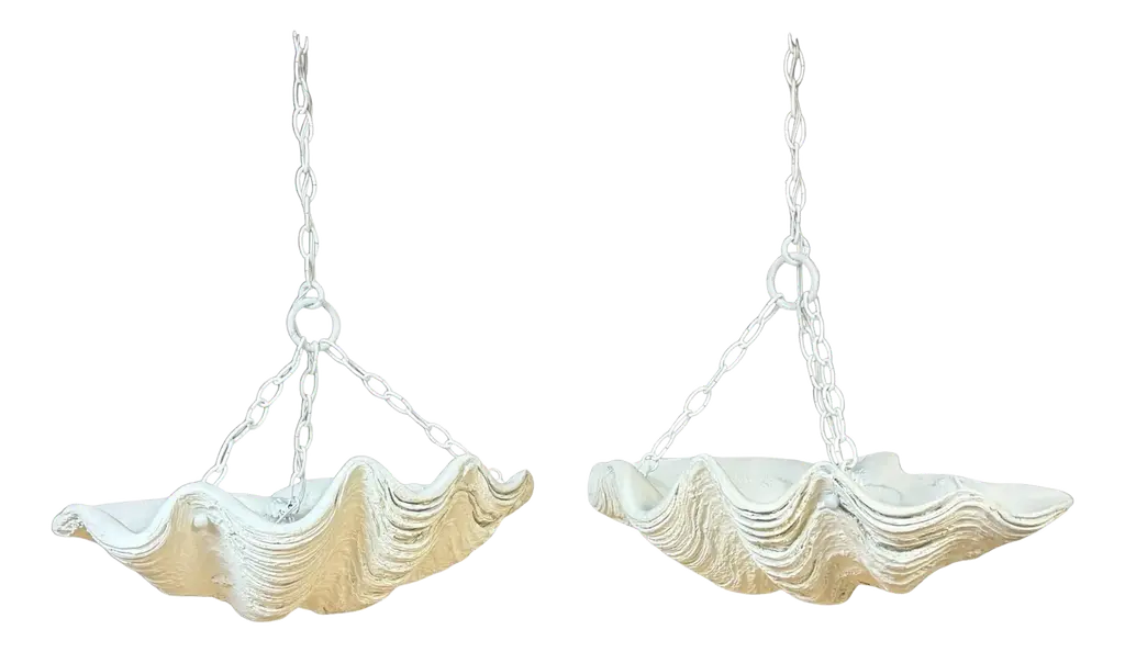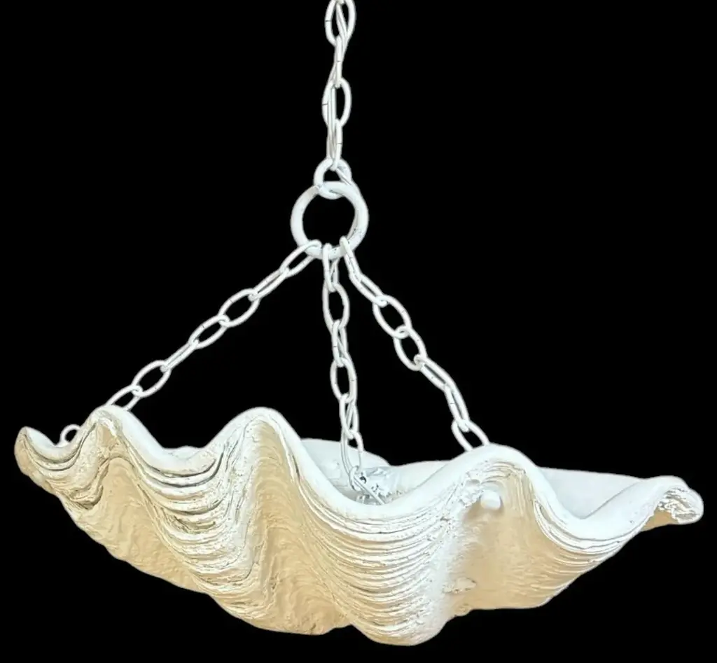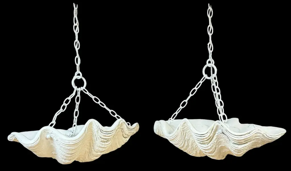 Two Serge Roche Attributed Cast Lacquered Plaster Clam Shell Chandelier Of the period, France, circa 1950s, attributed to Serge Roche (1898-1988) Sold individually. Two Serge Roche attributed cast and painted plaster clamshell chandeliers, from France and dating back to the 1950s. Each chandelier is a stunning example of mid-century design, reflecting Roche’s mastery in creating sculptural lighting pieces. These chandeliers are offered individually. Each chandelier is made from cast plaster, weighing over 25 pounds, and features a meticulously modeled clam shell design. The shell itself measures 6 inches in height, 22 inches in width, and 14 inches in depth, making it a substantial and sculptural work. The chandelier has a 16-inch drop and comes with 40 inches of chain, which has been replaced. Additionally, the chandelier has been rewired and is fitted to accommodate one standard US bulb, providing a soft ambient light. This chandelier is not only a functional lighting piece but also a work of art that adds the elegance and sophistication of French modern design to any room. Oh verall Measurements: Chandelier 16 inches high to ring/40 inches of chain Clam shell alone. 6 inches high x 22 inches wide x 14 inches deep