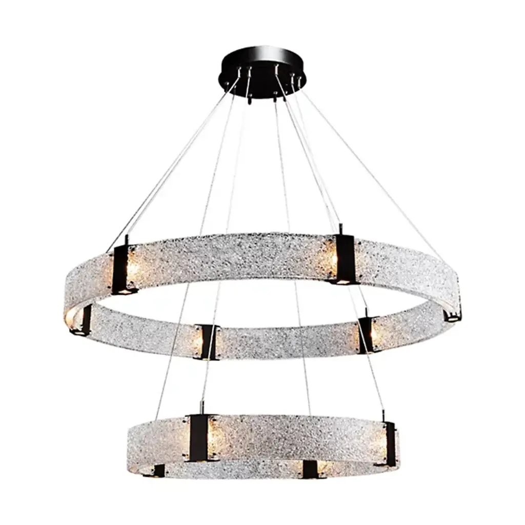 Enliven your indoor spaces with the Two Tier Parallel Ring LED Chandelier by Hammerton Studio, a clever contemporary take on a more traditional fixture. Designed by Levi Wilson, it makes its materials the centerpiece, suspending two segmented ring structures made of kiln-fused and hand-textured glass from a round metal canopy using several thin cables. Each segment is composed of two thin plates with space in between, restrained by evenly-spaced metal brackets and enlivened by integrated LED lamps that splash across their glittering interiors before diffusing outward in a warm corona of light.