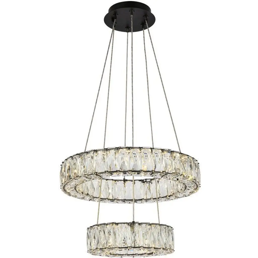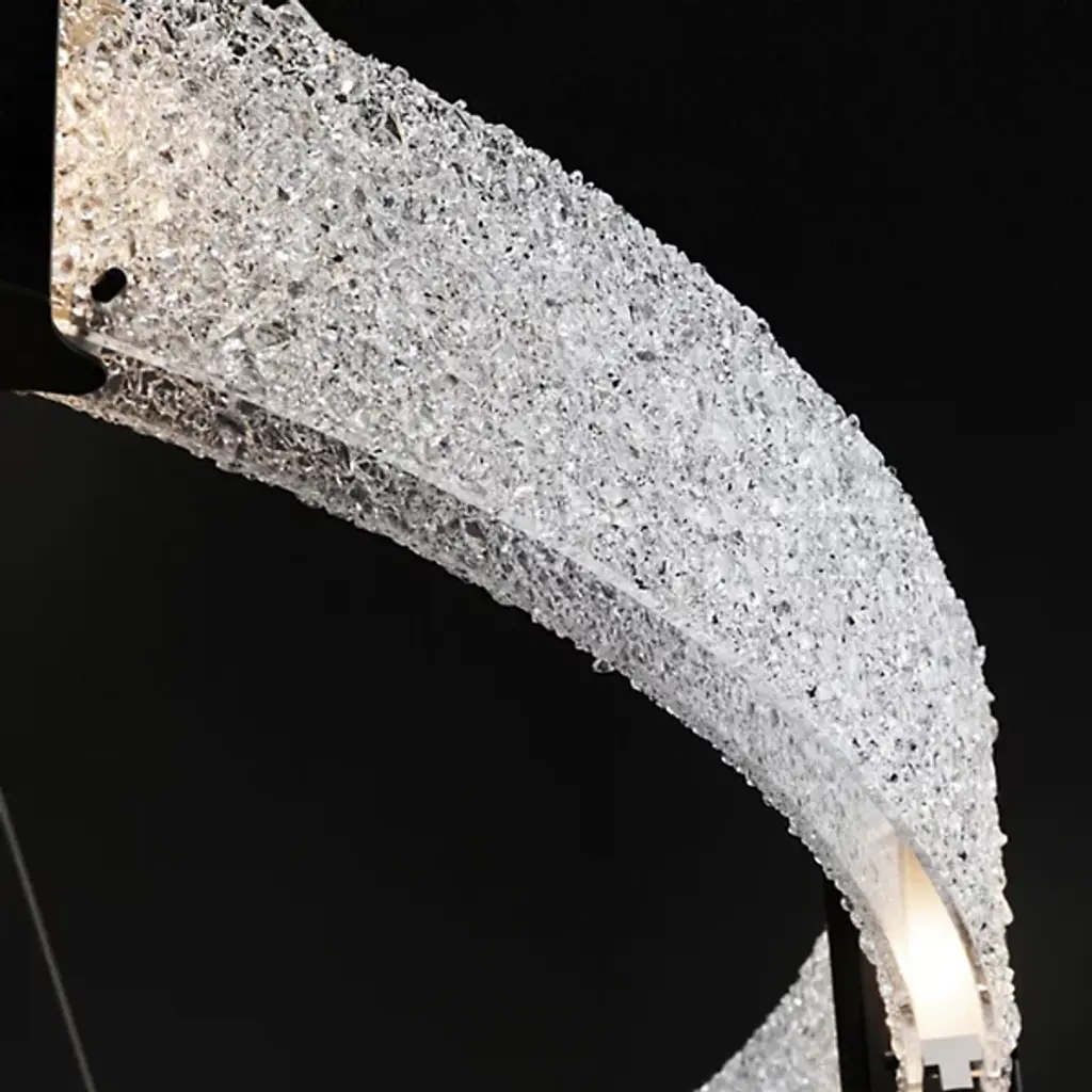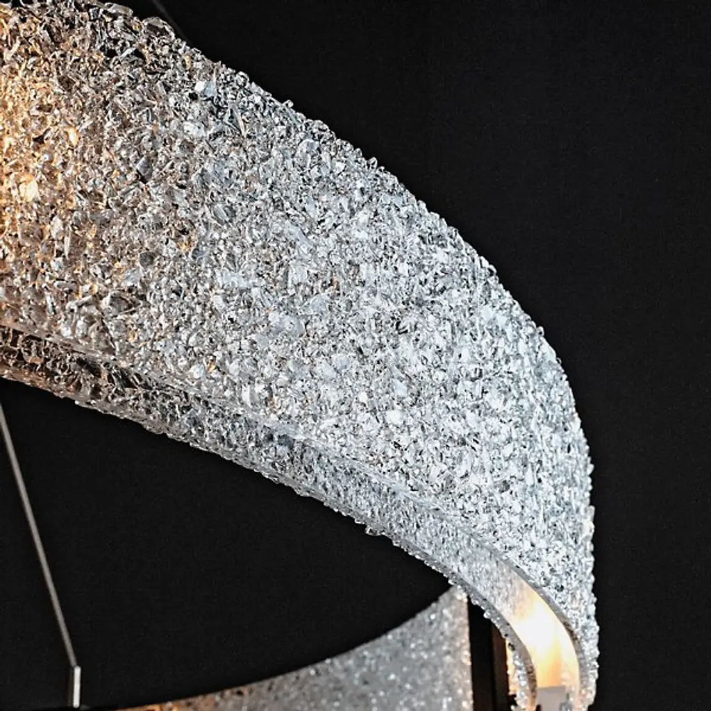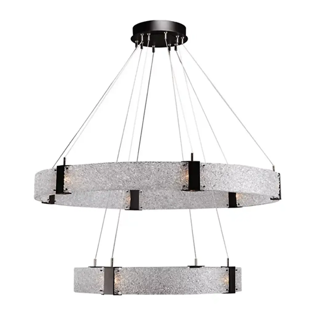 Enliven your indoor spaces with the Two Tier Parallel Ring LED Chandelier by Hammerton Studio, a clever contemporary take on a more traditional fixture. Designed by Levi Wilson, it makes its materials the centerpiece, suspending two segmented ring structures made of kiln-fused and hand-textured glass from a round metal canopy using several thin cables. Each segment is composed of two thin plates with space in between, restrained by evenly-spaced metal brackets and enlivened by integrated LED lamps that splash across their glittering interiors before diffusing outward in a warm corona of light.