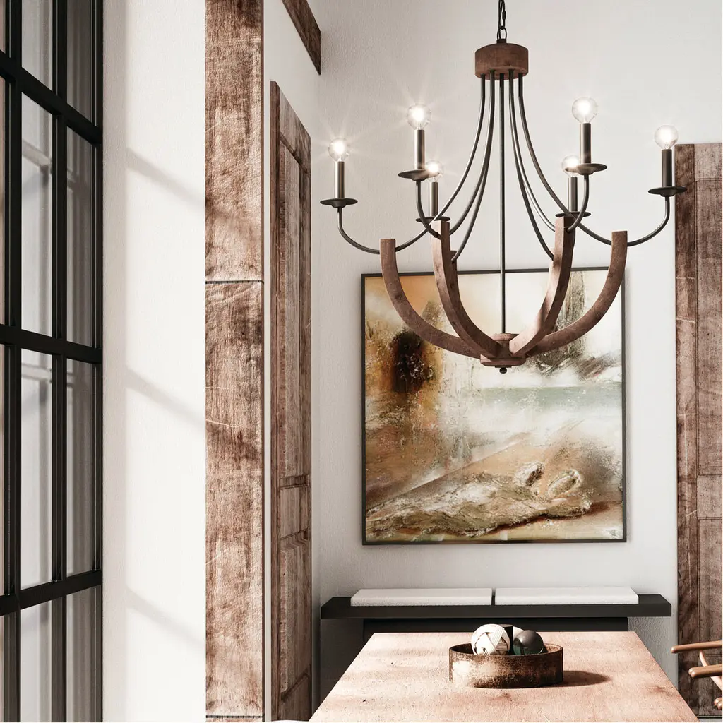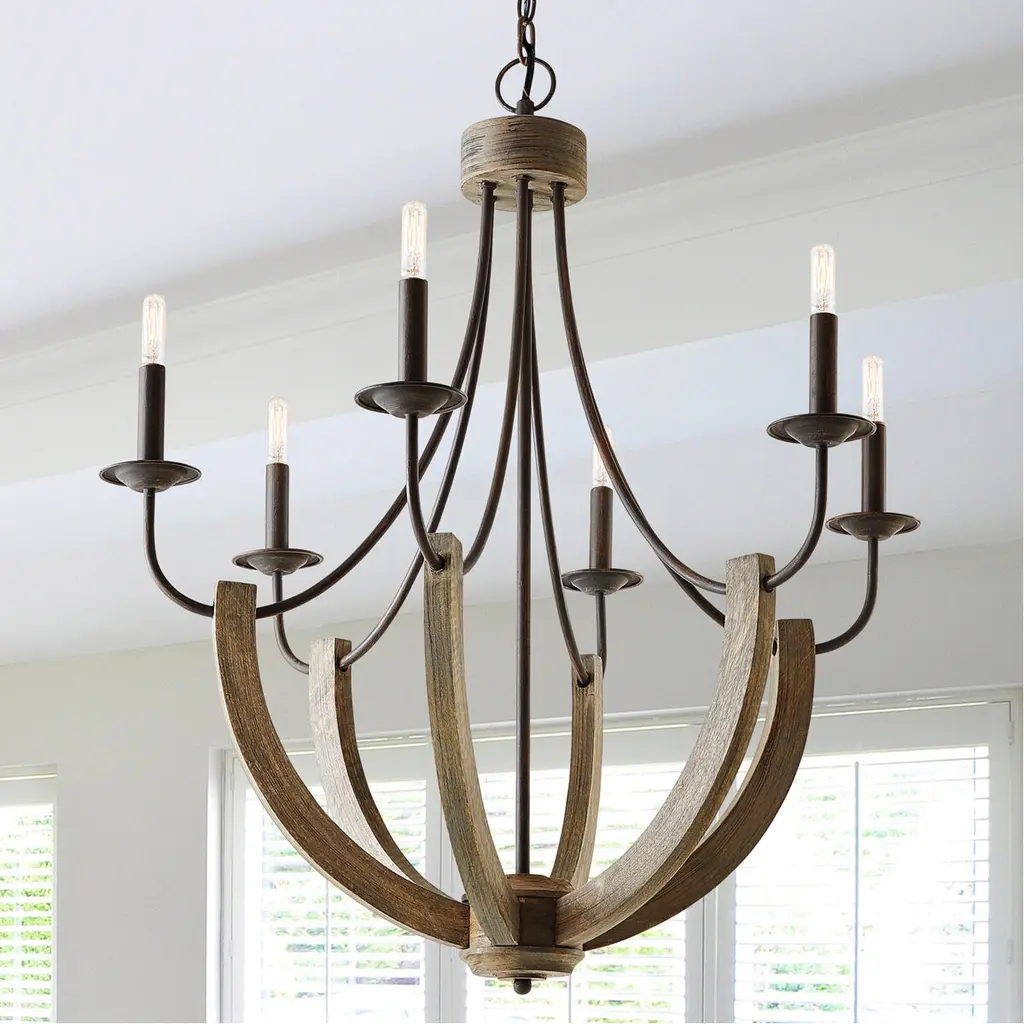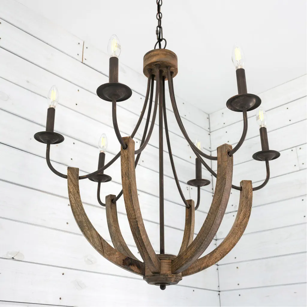 Featuring a distinctive barrel frame crafted of mango wood and metal, the Tybee chandelier boasts standout farmhouse character. The metal arms are sweeping arcs that appear to pierce through the wood, with lamps perched at the ends. Try Tybee as a dining room chandelier, a statement-making living room fixture, bedroom chandelier or in the foyer as an entryway fixture.