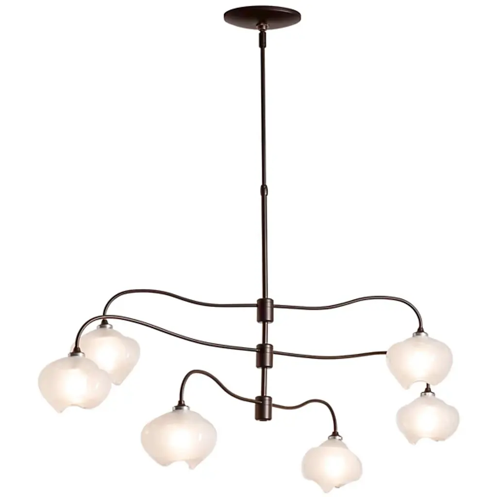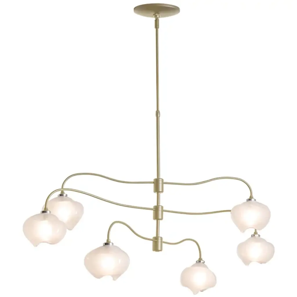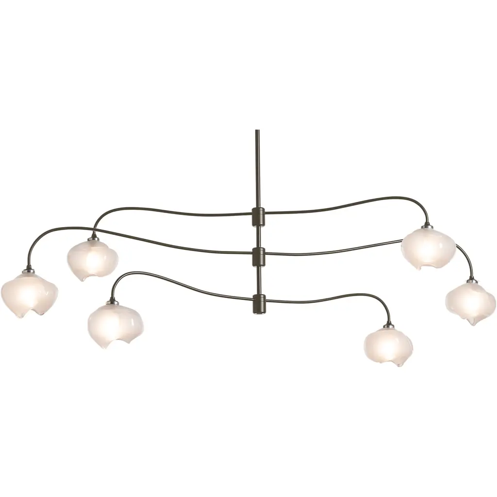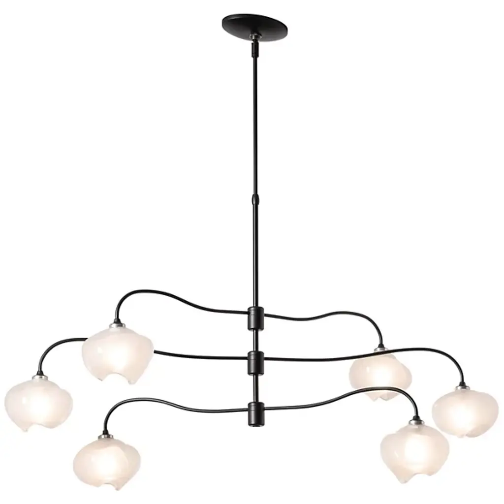 The Ume Large Chandelier by Hubbardton Forge is an elegant, contemporary addition to spaces. Supported by a single down rod, a tiered arrangement of gracefully curved arms extend different lengths above one another, each holding a beautiful, organically shaped glass shade at their ends. Delicate and unique, these shades have a soft, rounded silhouette that is similar to that of a blossoming plum and filter a lovely layer of illumination onto their surroundings.