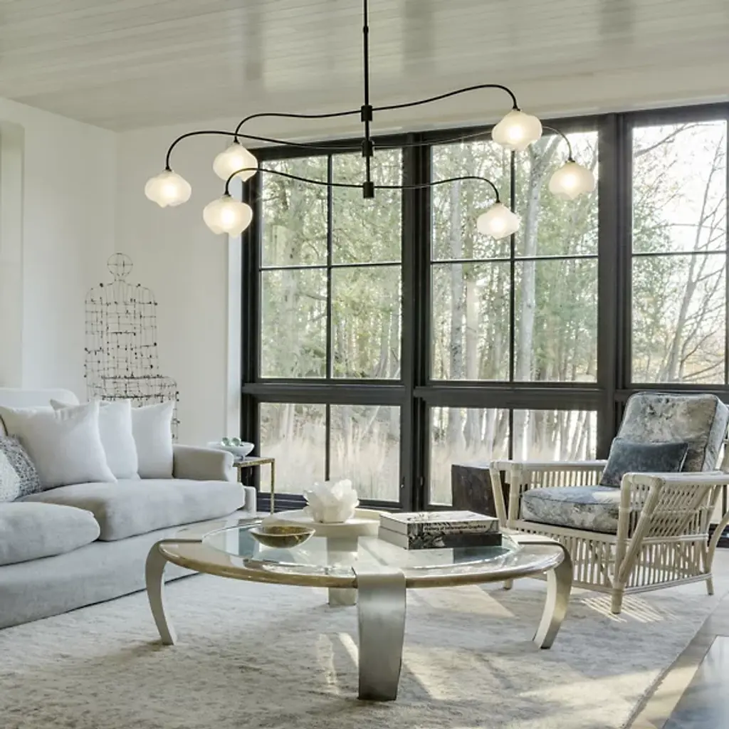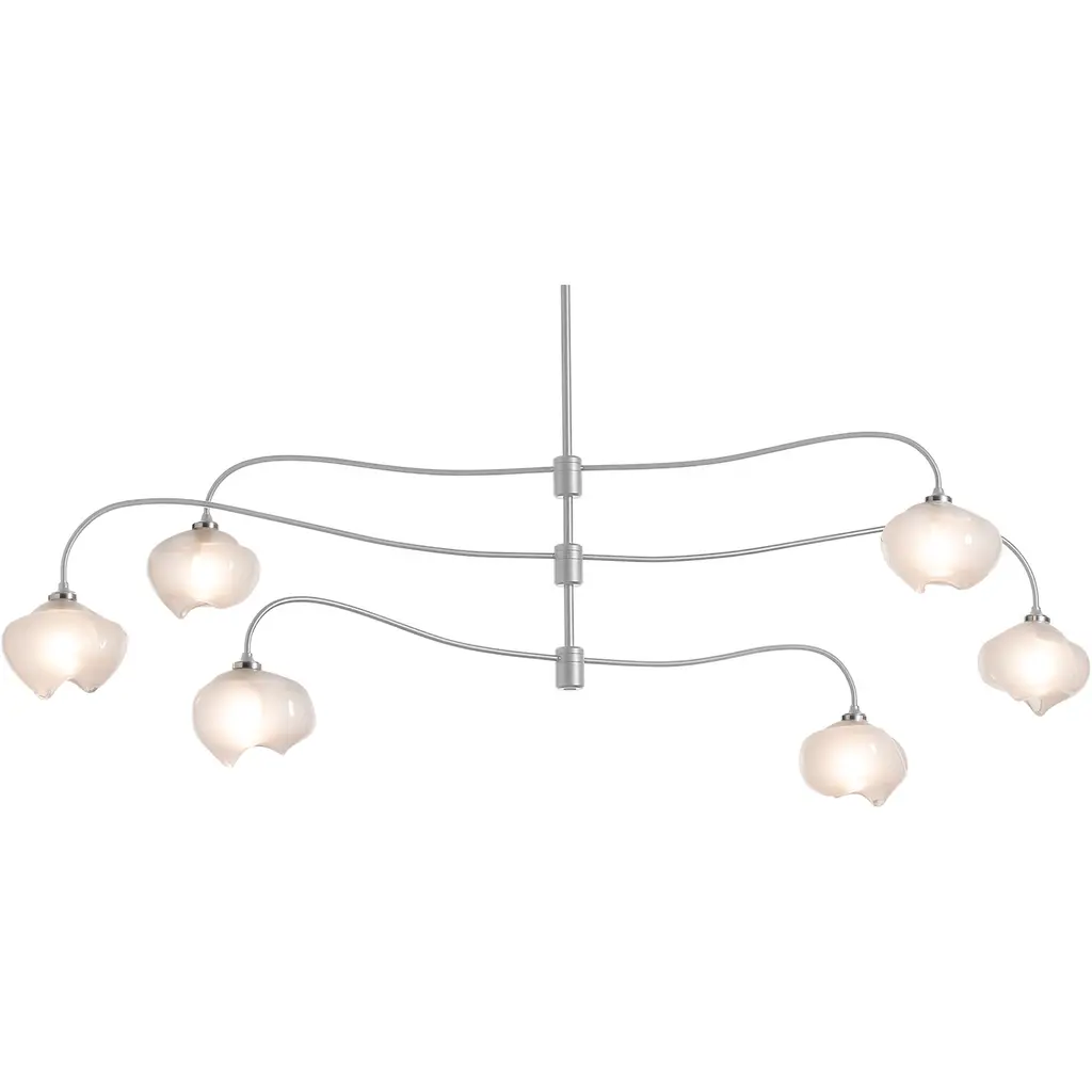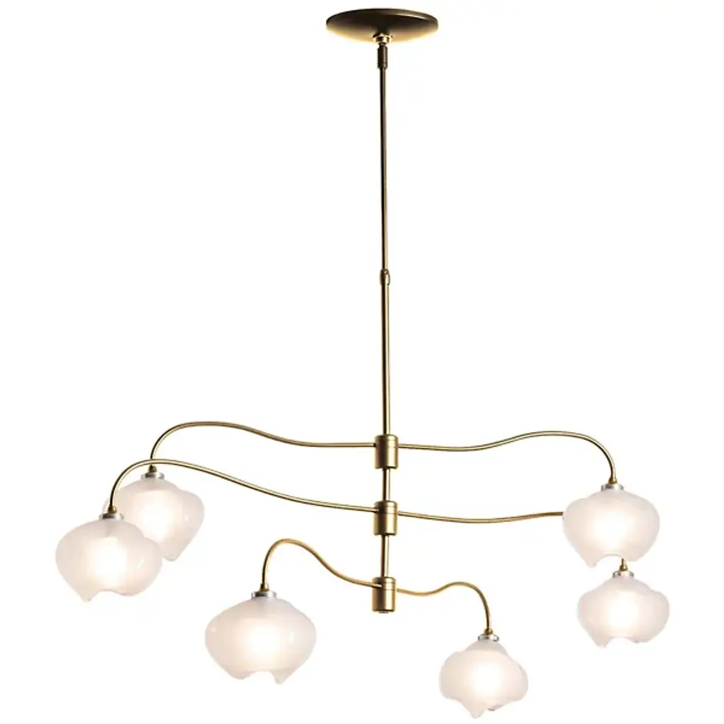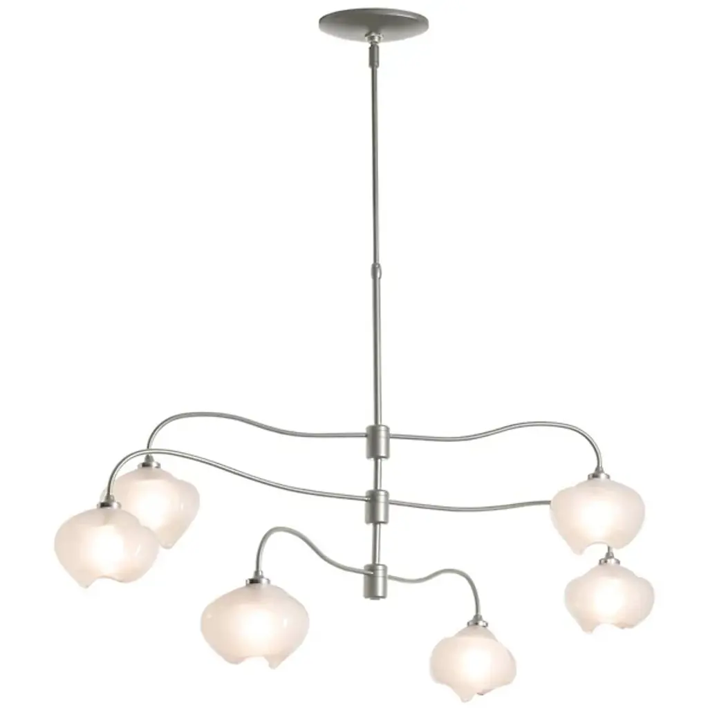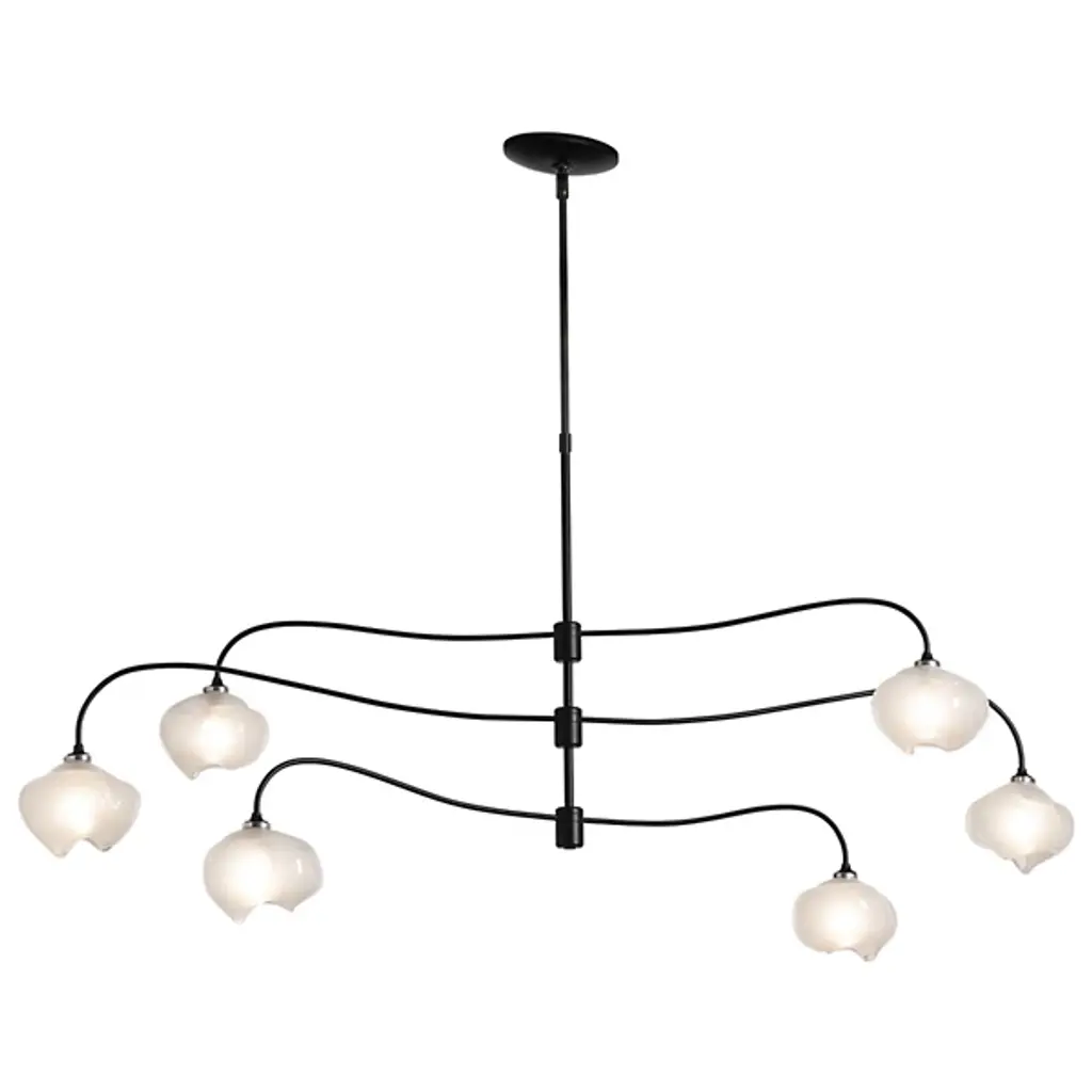 The Ume Large Chandelier by Hubbardton Forge is an elegant, contemporary addition to spaces. Supported by a single down rod, a tiered arrangement of gracefully curved arms extend different lengths above one another, each holding a beautiful, organically shaped glass shade at their ends. Delicate and unique, these shades have a soft, rounded silhouette that is similar to that of a blossoming plum and filter a lovely layer of illumination onto their surroundings.