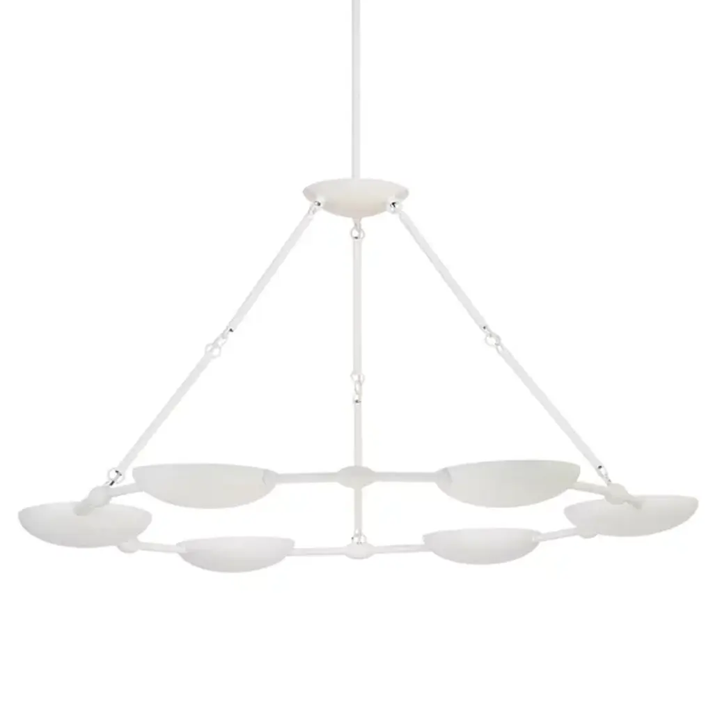 The Undertas Chandelier from George Kovacs arranges steel discs in a tiered composition that bridges mid-century and current design principles. Each disc floats horizontally, supported by slender stems that radiate from the central hub. The steel construction emphasizes clean lines and precise geometry while maintaining structural integrity. The fixture's balanced proportions create a visual tempo through repeated circular forms. Its design allows each disc to stand distinctly while contributing to the overall sculptural effect.