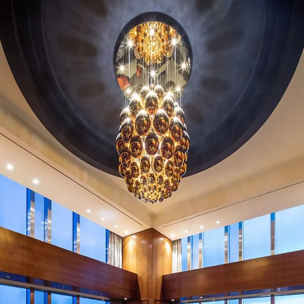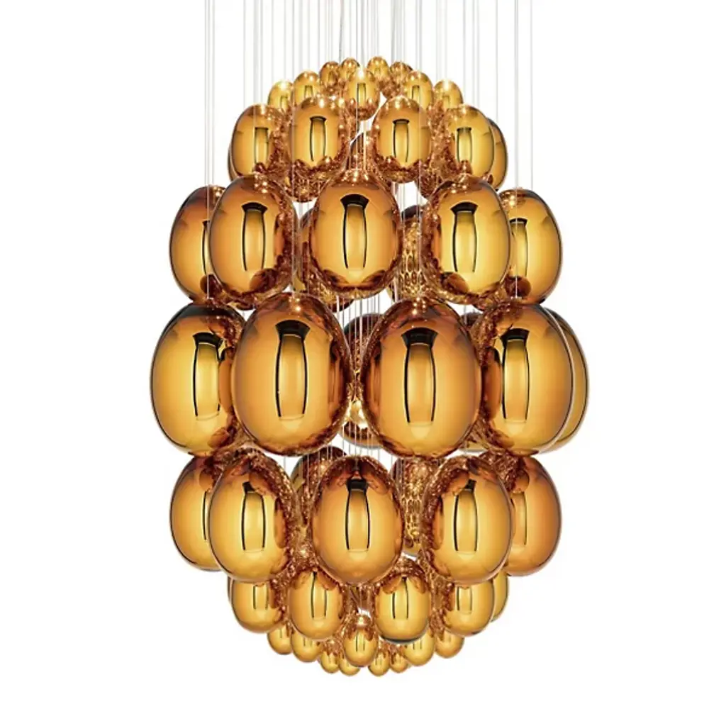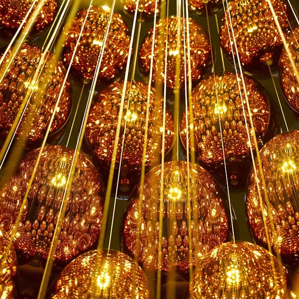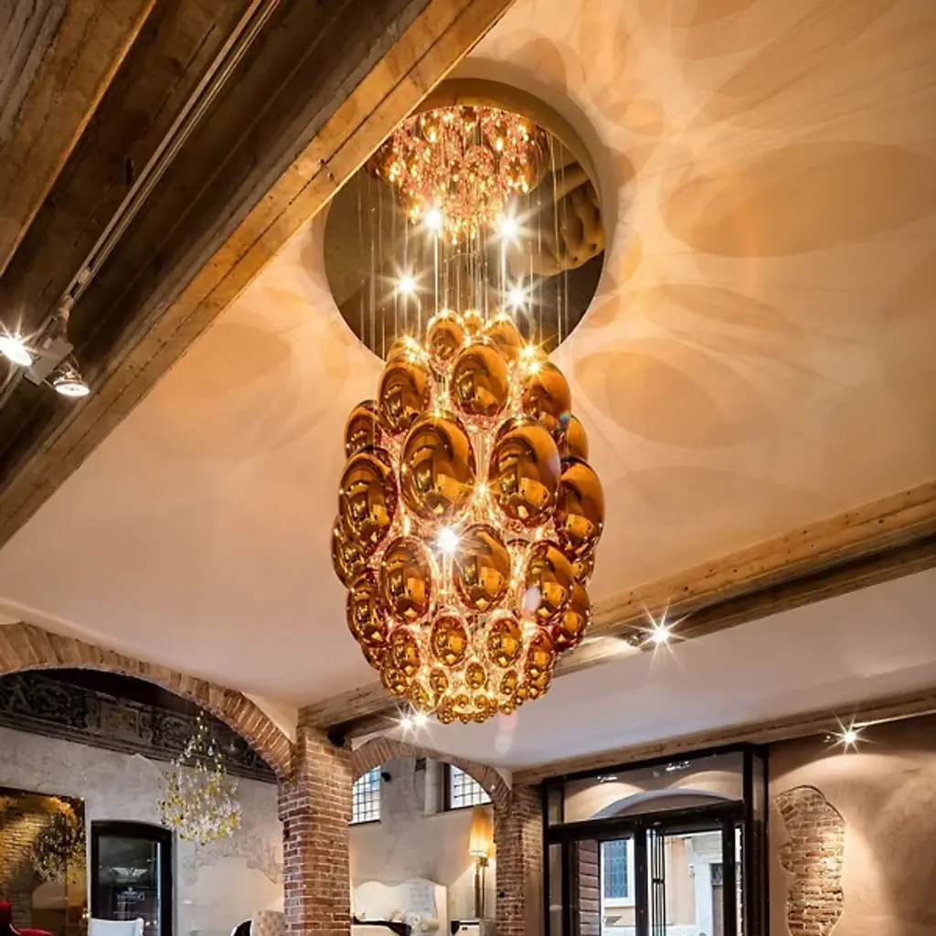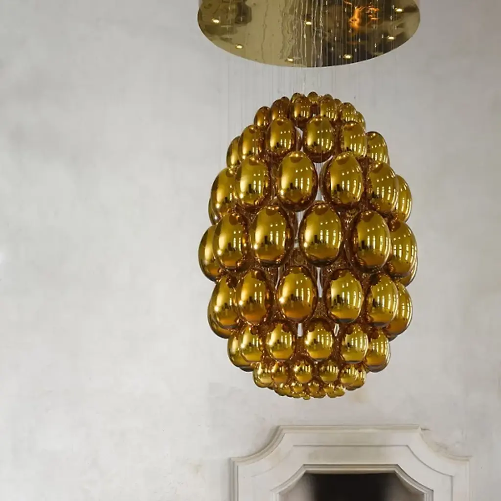 Evoking an ancient relic described in the pages of a fantasy epic. Translating to egg in Italian, the Uovo Chandelier from Lasvit amazes with as a functional sculpture, whose delicate, sparkling shapes give it the appearance of descending from the sky. Designer Rony Plesl creates pieces that are high in emotion and tell a story. Plesl’s background as a stone sculptor shows in the individuality of each floating glass gem. Glass artists shape the gems like an egg and give them a mirror-like finish. The mirrored surface displays the colors and shapes of the room for a cohesive look. Light rains down on the glass eggs from the canopy, creating a magical silhouette with glittering notes. This bright image creates a uniform aura of ambient illumination.