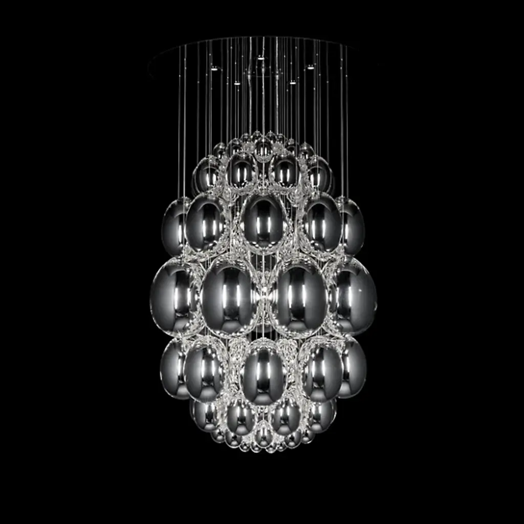 Evoking an ancient relic described in the pages of a fantasy epic. Translating to egg in Italian, the Uovo Chandelier from Lasvit amazes with as a functional sculpture, whose delicate, sparkling shapes give it the appearance of descending from the sky. Designer Rony Plesl creates pieces that are high in emotion and tell a story. Plesl’s background as a stone sculptor shows in the individuality of each floating glass gem. Glass artists shape the gems like an egg and give them a mirror-like finish. The mirrored surface displays the colors and shapes of the room for a cohesive look. Light rains down on the glass eggs from the canopy, creating a magical silhouette with glittering notes. This bright image creates a uniform aura of ambient illumination.
