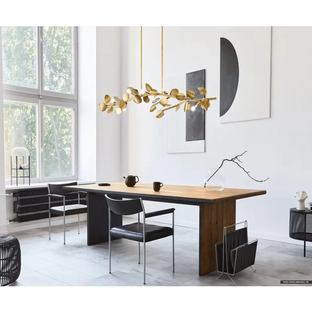 The Hervey collection is a blend of unique, artistic design and nature-inspired elements. The collection features an elongated, branch-like frame with a soft, metallic finish in either gold ombré or gilded silver. In the collection’s linear chandelier and wall sconce, this frame mimics the natural appearance of a tree branch, enhancing the organic aesthetic of the fixture. The collection’s pendant lights, ceiling lights, and some variations of Hervey chandeliers, the tree branch is twisted to form a circular frame with leaves arranged in a way that they encircle the frame, creating a lush, foliage-like appearance. The linear Harvey chandelier and wall sconces are adorned with numerous leaf-shaped metal accents arranged along the length of the branch-like frame. These leaves have a slightly distressed metallic finish, adding texture and a natural feel to the design. Small, clear light bulbs are integrated into the frame, positioned strategically among the leaf accents. These bulbs provide illumination that highlights the leaves, creating interesting shadows and a warm glow. The bulbs have a simple design, ensuring they complement the overall aesthetic without overwhelming the decorative elements. The chandelier is suspended from the ceiling by two thin rods that connect to a rectangular ceiling mount, providing a balanced and stable suspension while maintaining a sleek and minimalistic look. Like every Hervey fixture, the circular Hervey pendant light, ceiling light, and chandelier’s design is heavily inspired by natural elements, particularly tree branches and leaves, giving each a whimsical and organic look. The soft, metallic finish adds a touch of elegance and sophistication, making the fixtures suitable for various interior styles, from contemporary to rustic. The arrangement of the bulbs and leaves ensures that light is evenly distributed, creating a warm and inviting ambiance.