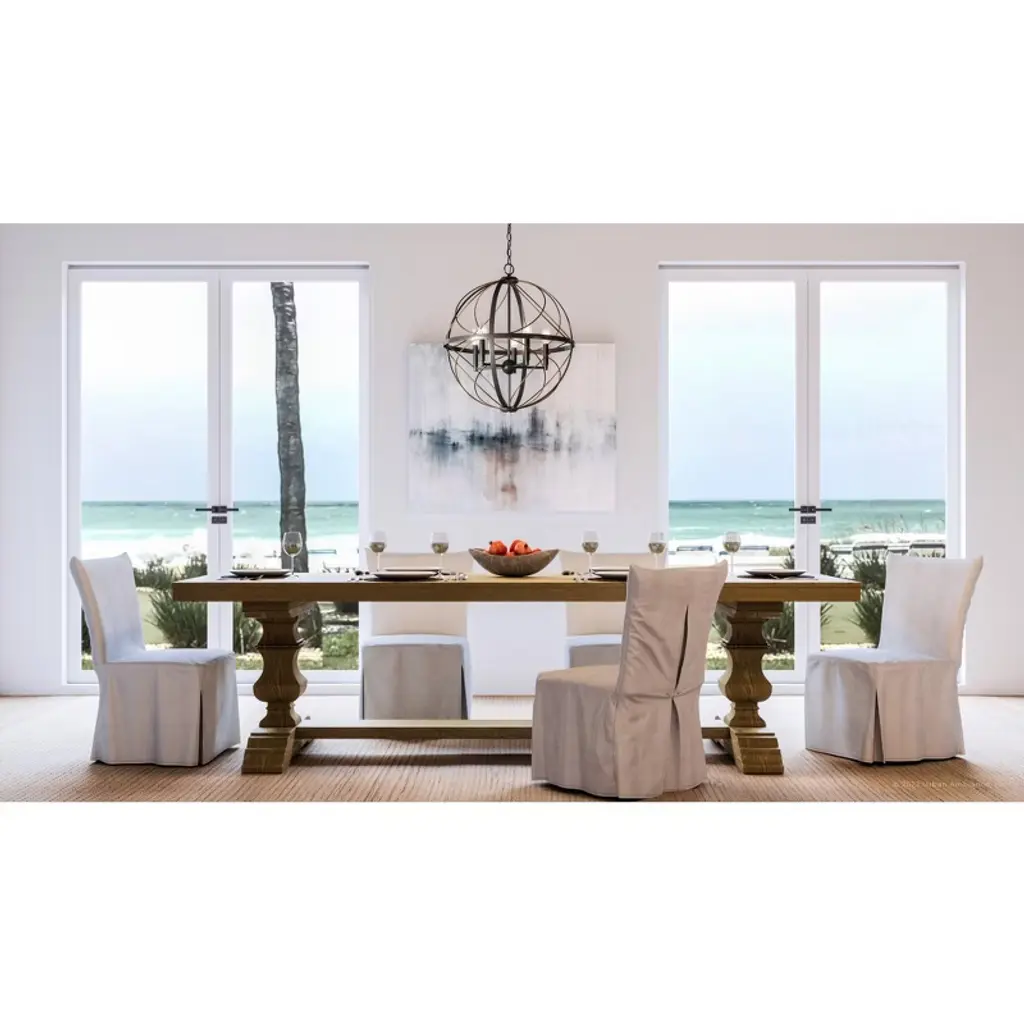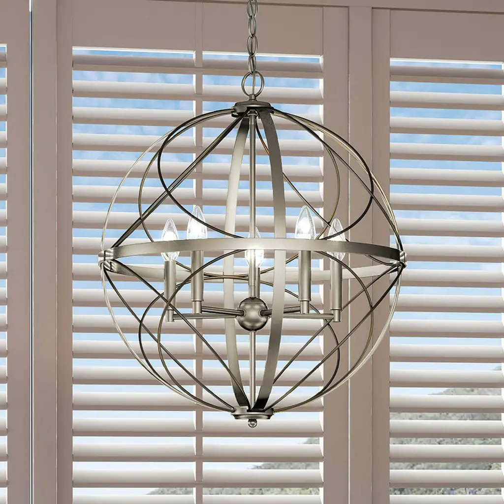 Adding a dash of luxury in a timeless design, the Omaha Collection plays with elliptical curves and interlocking spheres to juxtapose bold construction with delicate finishes ideal for any farmhouse or transitional interior setting. These fixtures build on artful silhouettes made possible by the open frame layout that encloses a cluster of candelabra base bulbs. A centrally placed metallic down rod passes through the spherical frame but bulges into an elegantly finished metallic ball in its midsection that anchors the socket-bearing stems before terminating at the base canopy. The spherical frame features three upright metal hoops passing through the two canopies at the top and bottom of the frame such that they intersect at the top and at the bottom. The other metal hoop hugs the frame’s midsection to reinforce the upright hoops. The fixtures further employ four wire hoops on each half of the sphere such that each hoop intersects with two other hoops on either side to ornament the frame.
