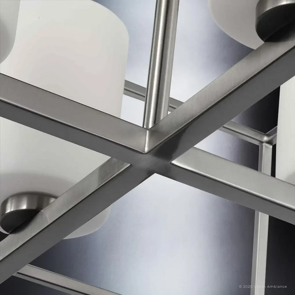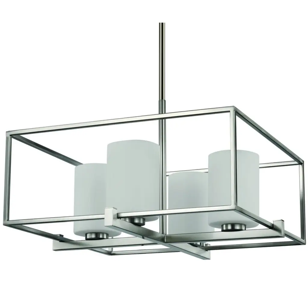 The Kennewick collection features a crisp modern design with endless geometric intricacies. A clean box framework is the principal exterior highlight, while a neat etched opal glass shade reigns on the interior. The sharply defined framework not only boasts a variety of finishes but also different positions to suit any décor. To add nuance to the typical box frame, the design integrates a signature detail in form of crisscrossing angular bars resembling clutched claws that provide both functional and decorative reinforcement at the point of suspension. The bars also act as the perching base where the opal glass cylinders sit. The neat cylinders add both visual contrast and warmth.