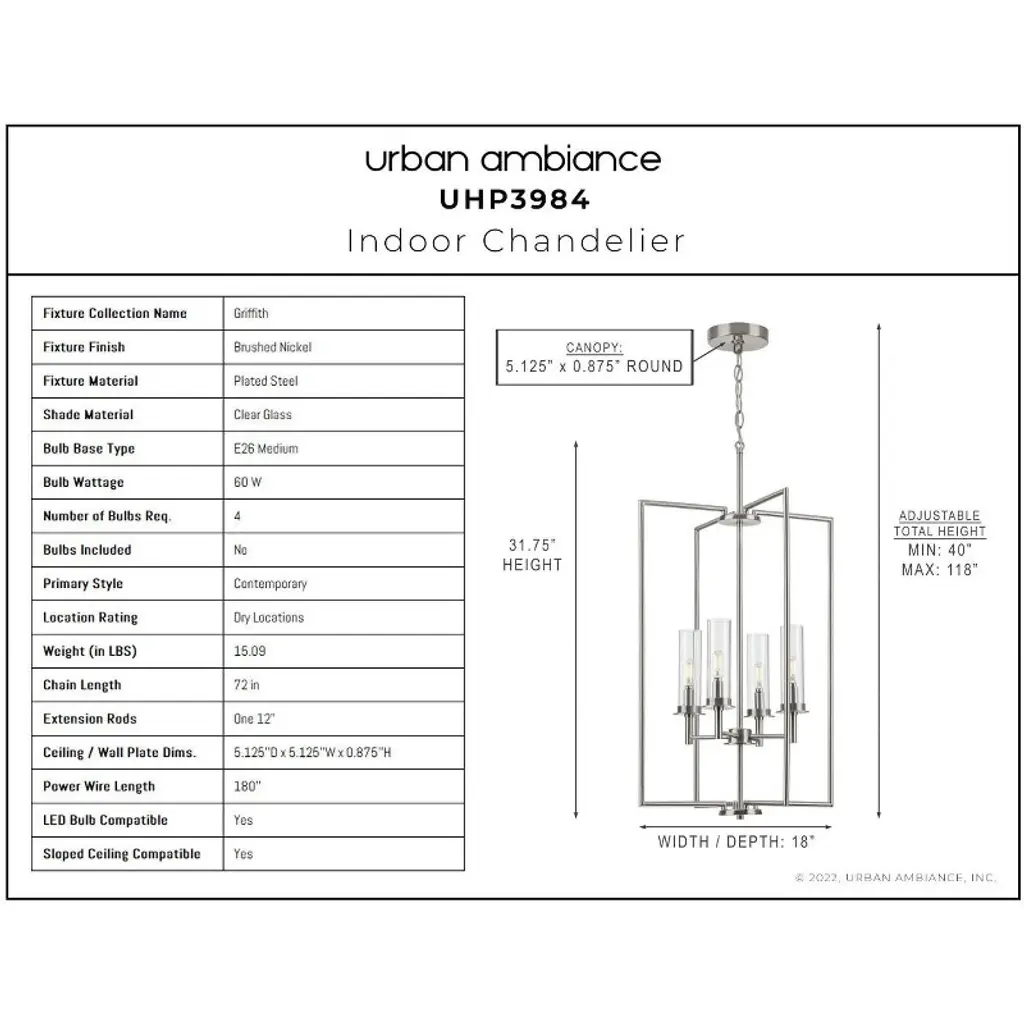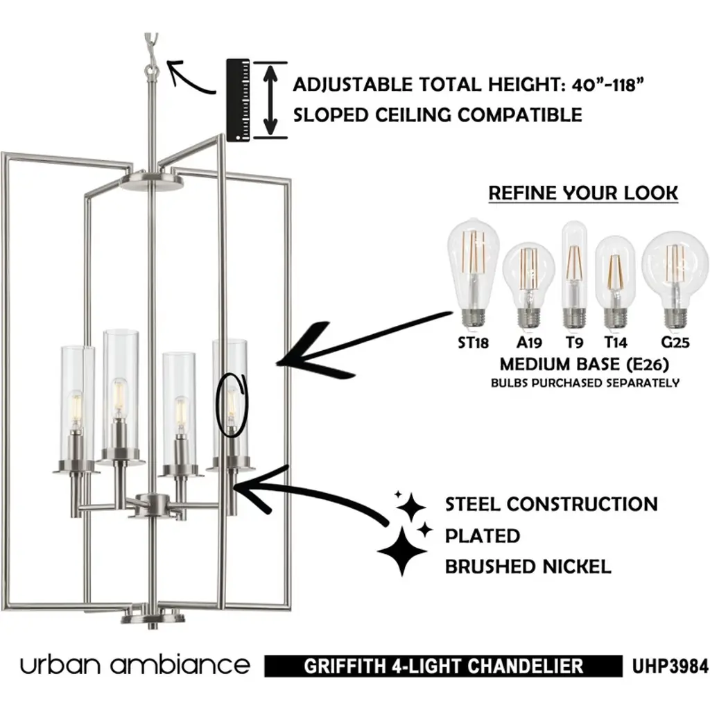 Urban Ambiance Luxury New Traditional Chandelier 31.75''h X 18''w, Brushed Nickel Finish, Griffith Collection, Uhp3984