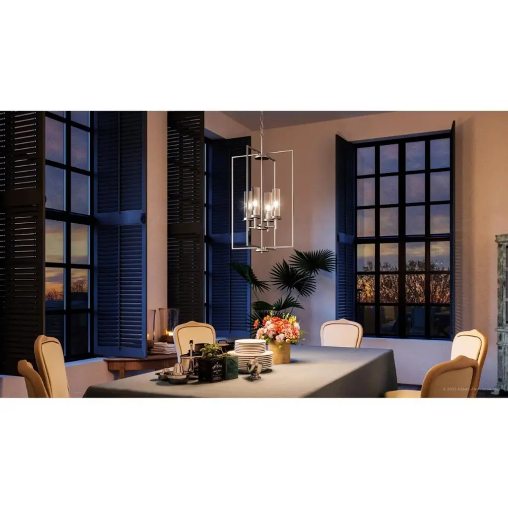 Built on classic frames, the Griffith Collection of lighting fixtures exemplify luxurious transitional lighting at its best. With an elegant balance between 90-degree hard angles and cylindrical clear glass shades these fixtures are a good fit in many interior spaces. And with plenty of balanced illumination, they are a great choice for areas that need lots of light - from dining rooms, kitchens, and bedrooms to hallways and foyers. The fixture design displays an aptitude for working with metal. From the top of the fixture to its base, the diameter of the metal changes to reflect the look of historical architectural practices. Emanating at right angles from the central column are evenly spaced candle arms, which are terminated with oversized socket arms, leading up to the cylindrical “wax catchers” and clear glass.