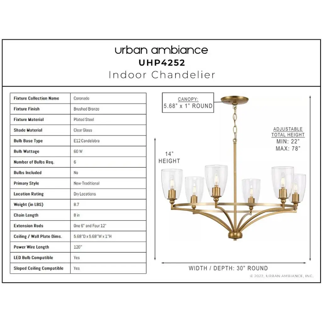 Urban Ambiance Luxury Transitional Chandelier 14''h X 30''w, Brushed Bronze Finish, Coronado Collection, Uhp4252