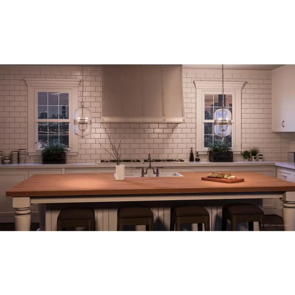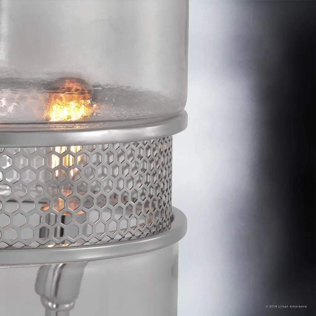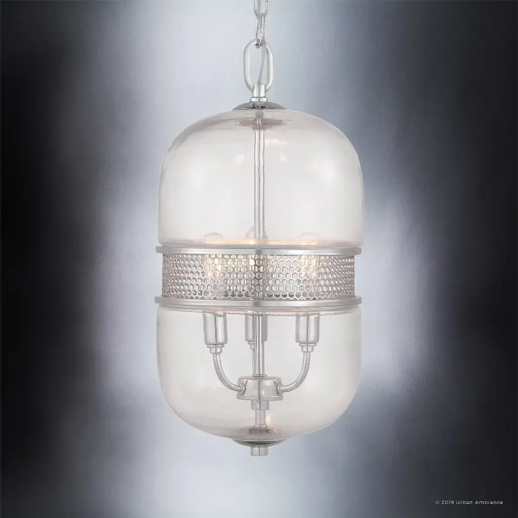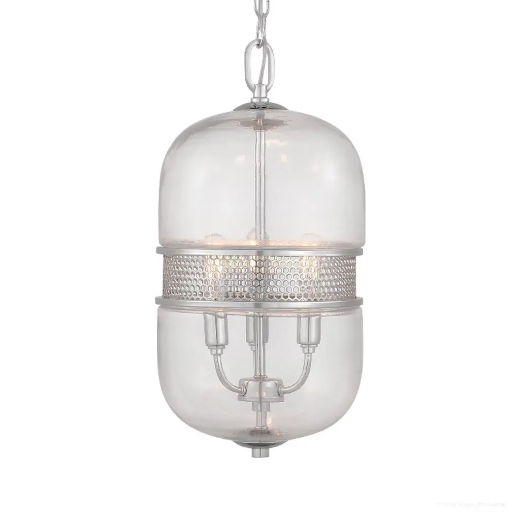 The Varna collection brings an eclectic yet stylish ambiance to any space. The vintage-inspired capsule design radiates beauty from the inside out. The oversized clear glass capsule connects to the chain drop through a tiny thin canopy casing that matches the sleek center stem. The stem links both capsule peaks through a similar casing and snout detail, but not before introducing gently curved upright socket arms. The middle section is adorned with a recessed trimmed mesh detailing tiny hexagonal patterns. Elongated vintage bulbs pierce through the mesh and glow above the top trim.