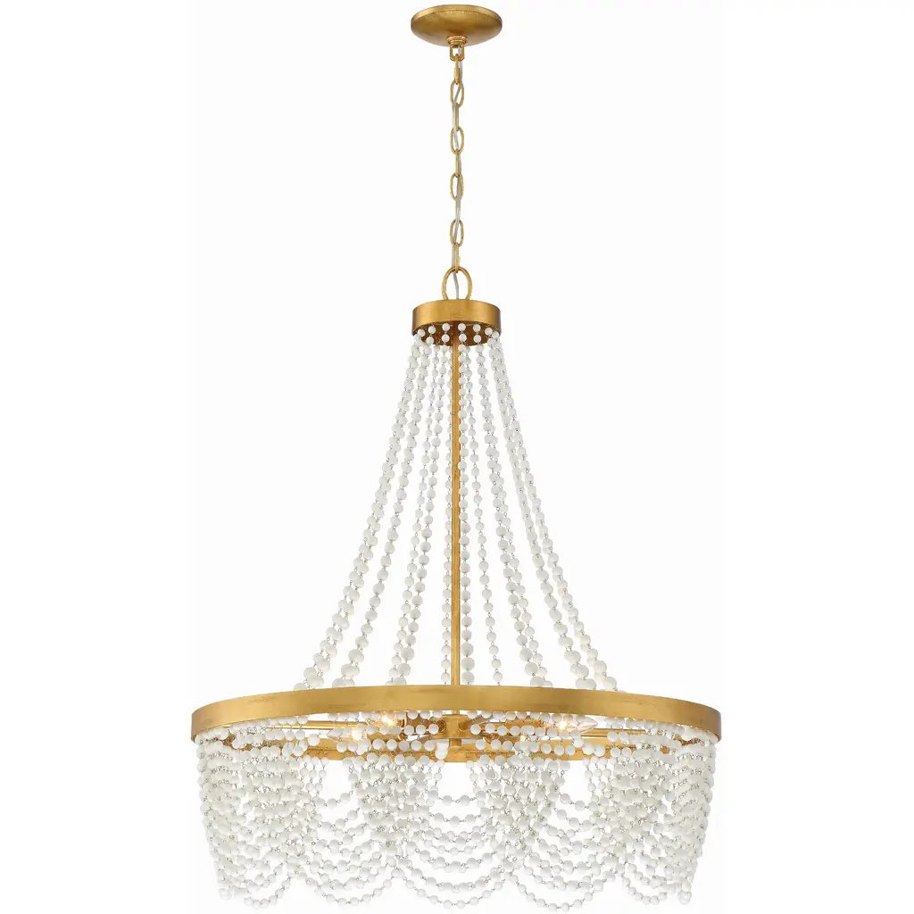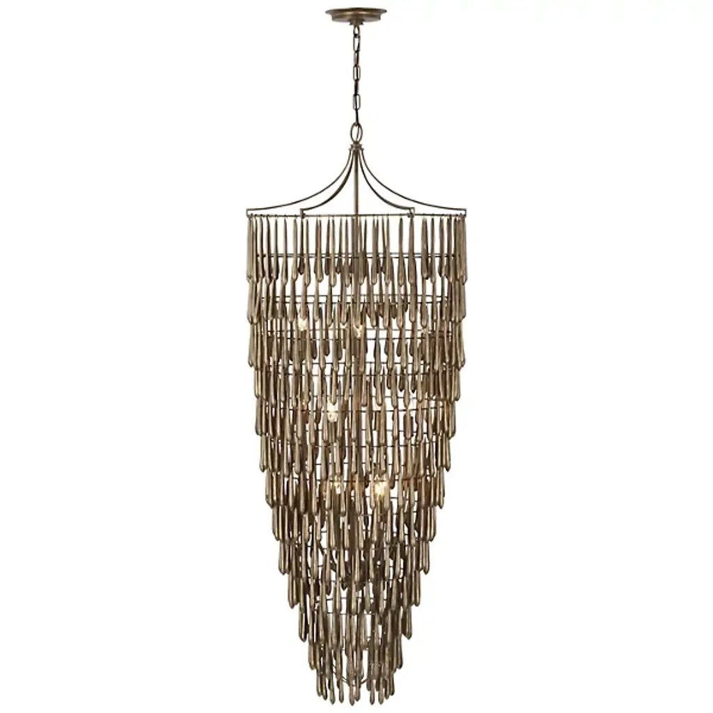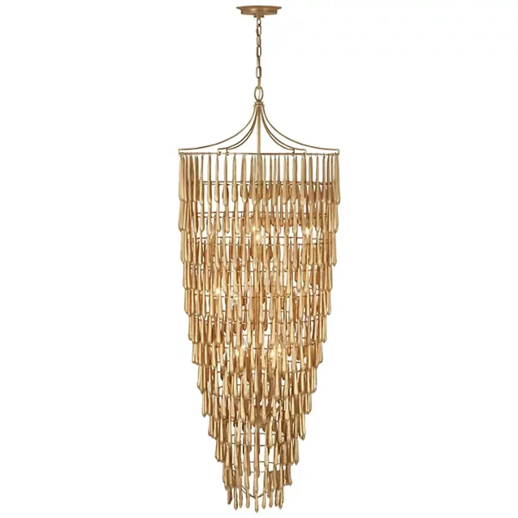 Art and lighting find an elegant meeting point in the intricate design of the Vacarro Cascading Chandelier from Visual Comfort Signature, formerly known as Visual Comfort, The chandelier’s great attention to detail, craftsmanship, and seductive form offers something for a range of home styles. It impresses without the lights on as a tiered form with a tapered silhouette. Each tier is home to dozens of organically shaped accents that hang with a delicate hook. The accents evoke elongated water droplets, thus enhancing the cascading feeling of the piece. The bulbs tuck inside the chandelier and glaze the accents with a golden hue. The chandelier produces pops of warm light that result in an atmospheric glow.