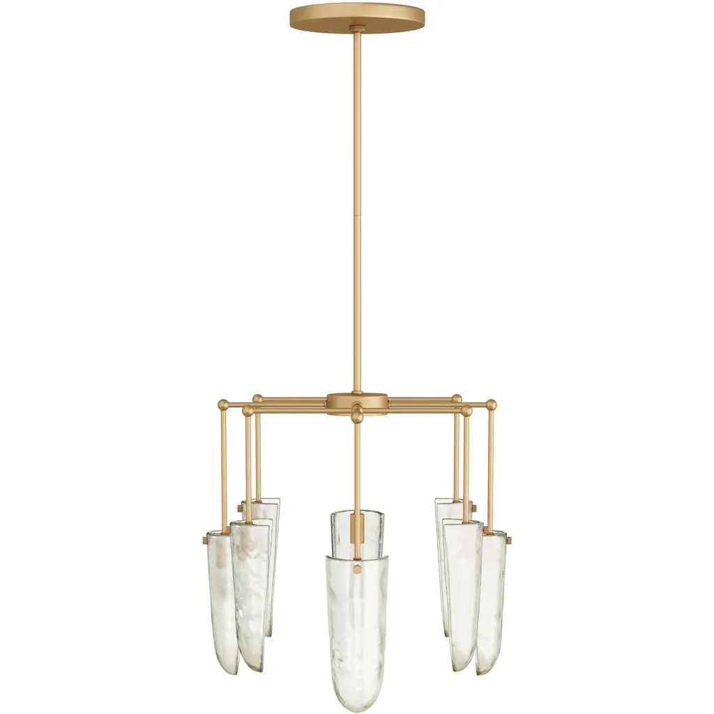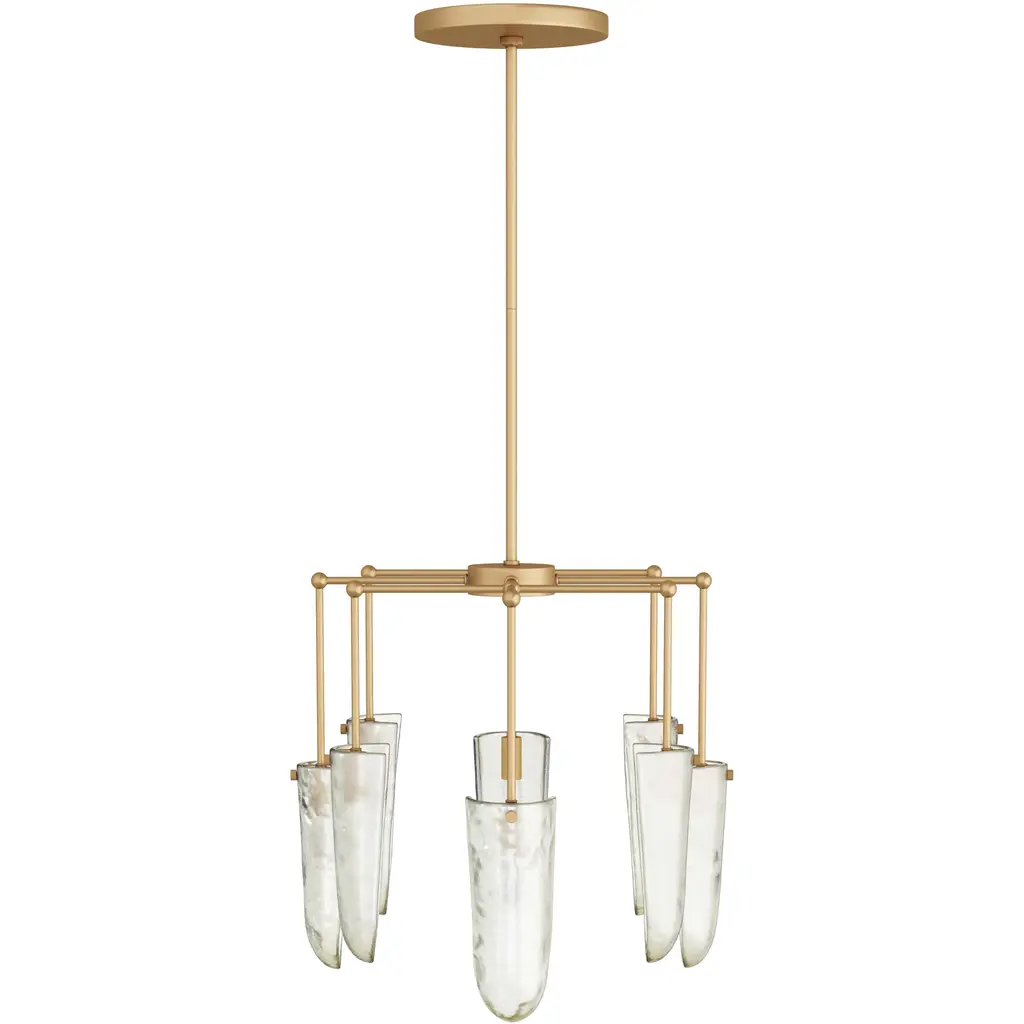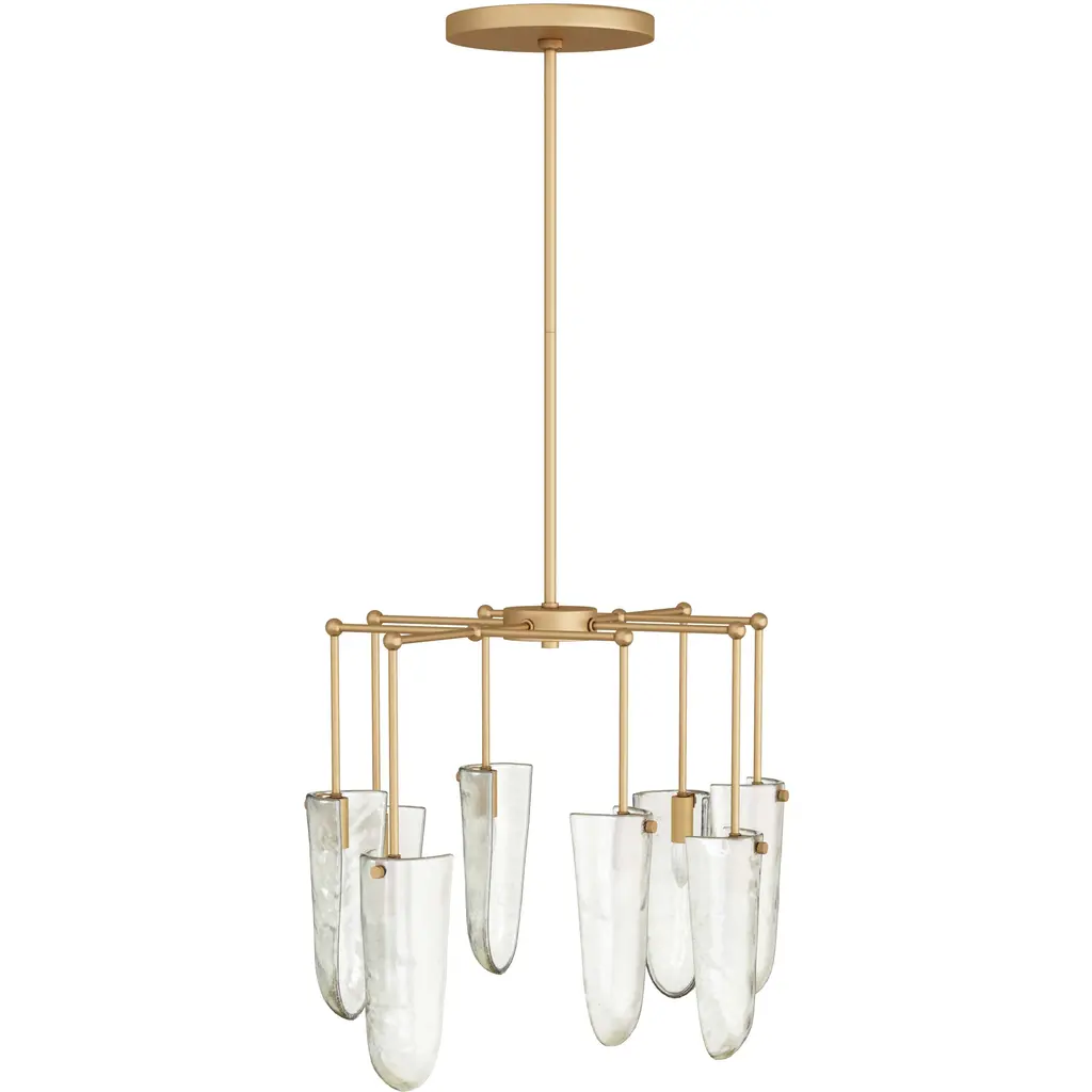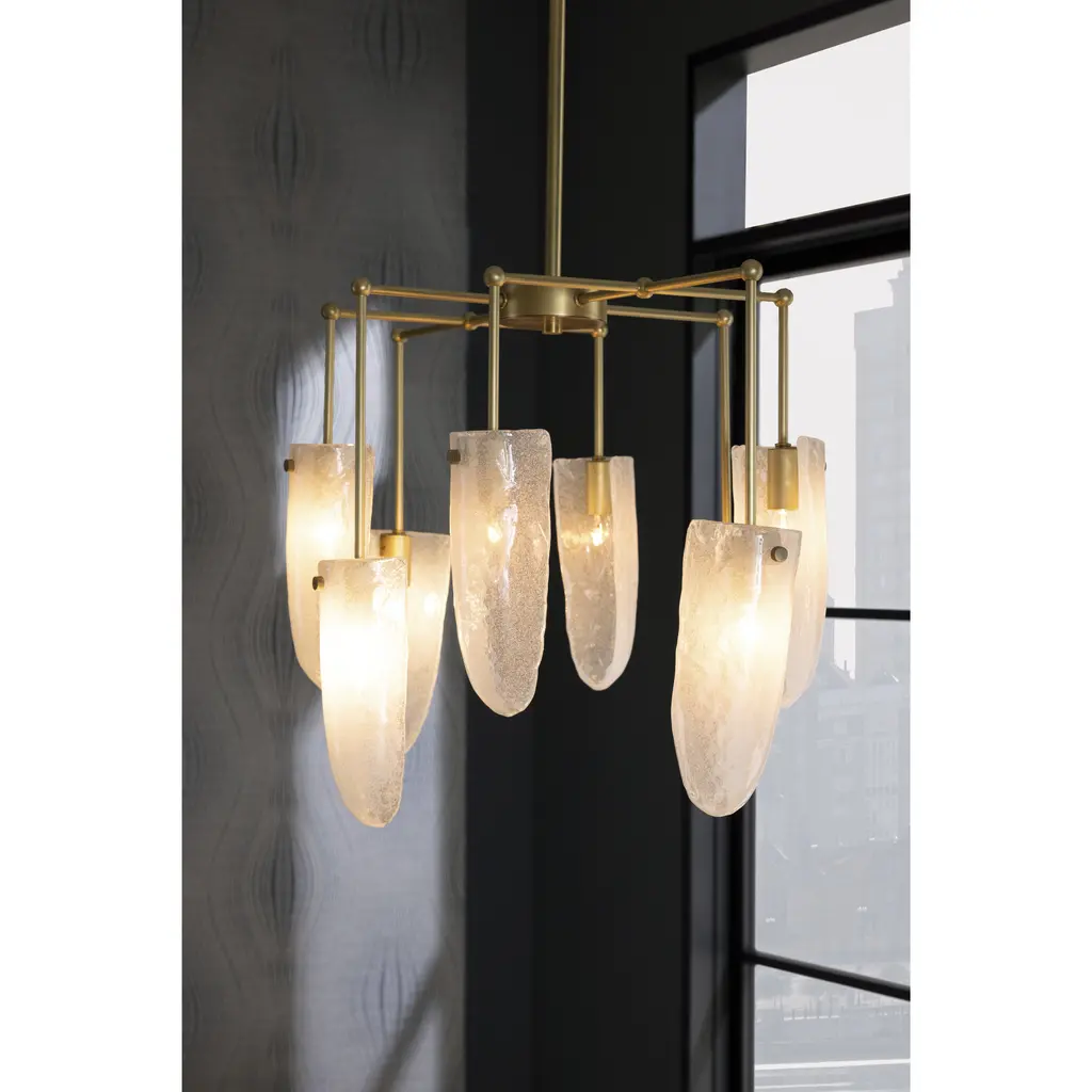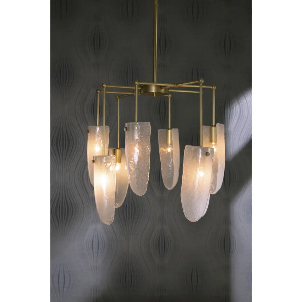 Our luxe valeria chandelier is fashioned in clear seedy glass, with a delicate, oval pipe framework in antique brass iron. Like glistening water droplets, shield-shaped shades cascade from each arm, casting warm ambient light as it passes through the textured glass. Finish will vary.