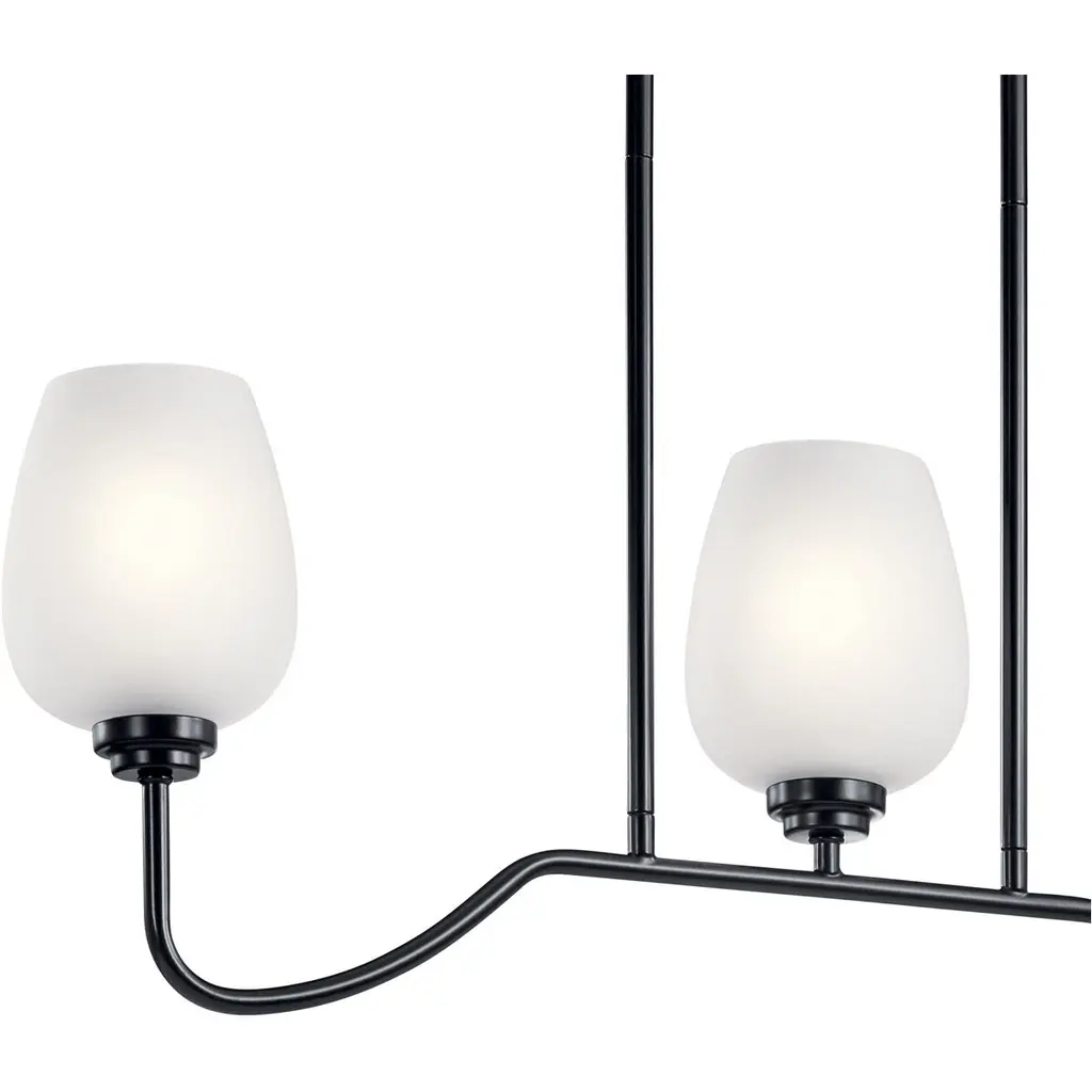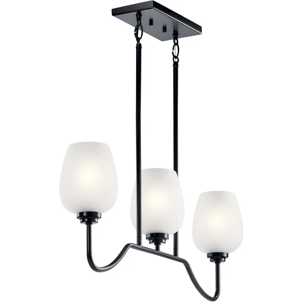 Inspired by the elegant and sleek design of a wine goblet, the 3-light linear chandelier from the Valserrano(TM) collection conveys grace and beauty with its sweeping Black finish and Satin Etched glass. The Valserrano(TM) linear chandelier pairs traditional elements with a simple design to create a clean, classic look.