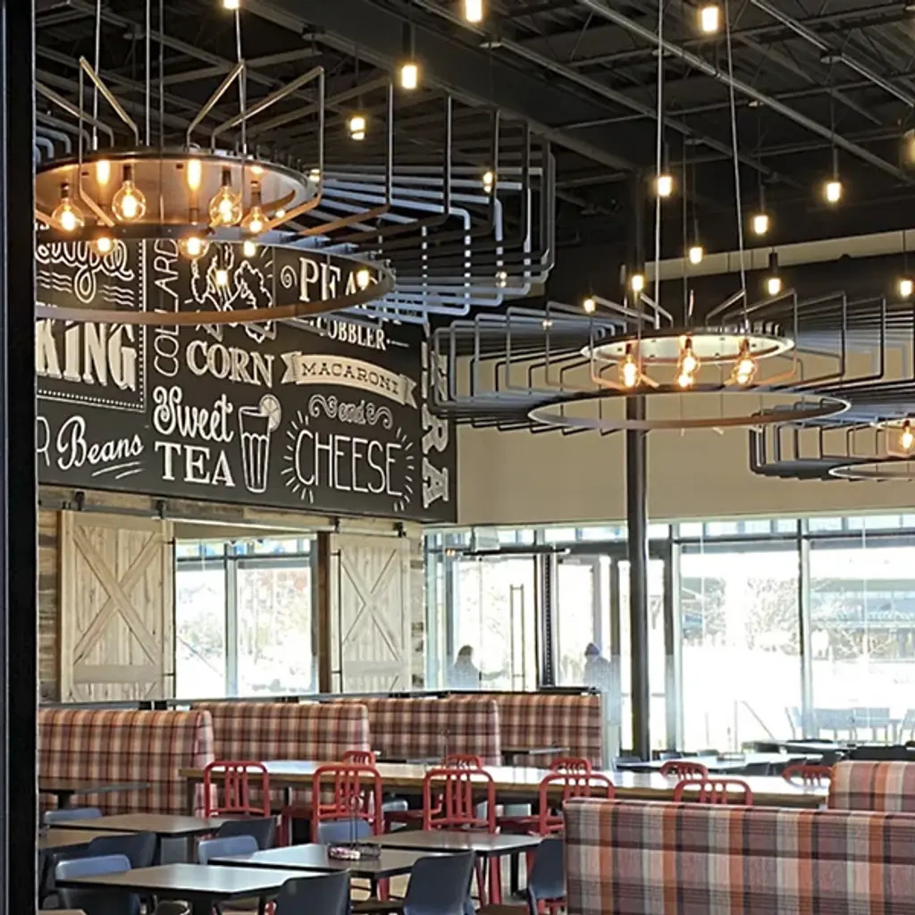 Easy to appreciate at any time of day, the Vasi 21472 Chandelier from Ultralights is a statement piece enhanced by repeating elements. It's a high design piece with a contemporary personality. As a metal construction, this chandelier gives off a bold and enduring character. It slices overhead with sleek metal frames arranged like a short drum. The frames create a sense of awe as one looks through them and sees a bevy of repeating lines. The sharp lines point your eyes at the gorgeous bare bulb setup. The crisp bulbs glaze the metal frames to accentuate an already dramatic silhouette. The outpouring light creates a simply pleasant ambiance.