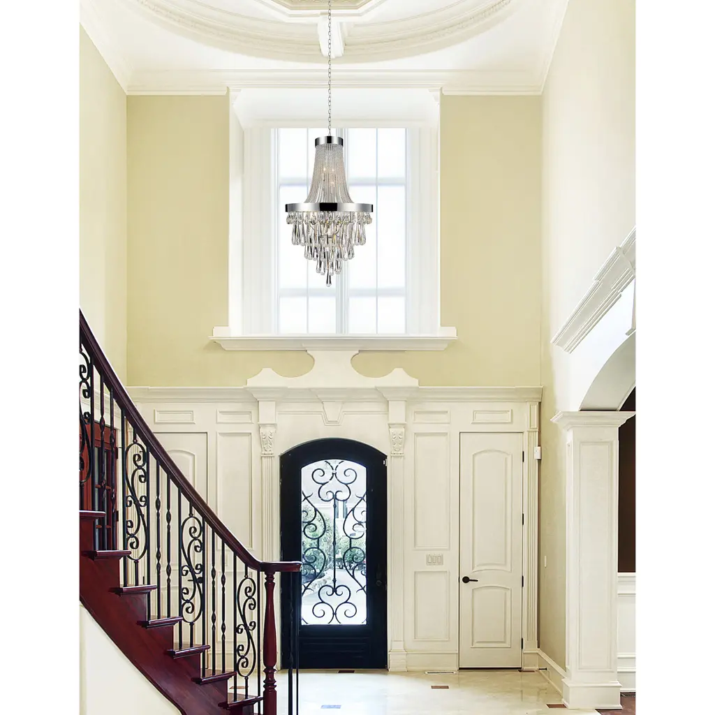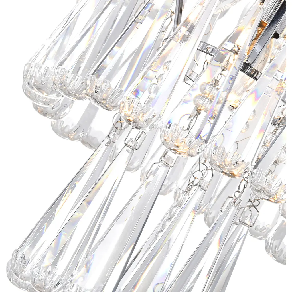 The Vast 13 Light Chandelier casts a romantic and magical vibe to a room. This down chandelier in chrome is designed with a glamorous style as presented by the cascading crystal strands and the dripping clear crystal beads. Complementing the classy look are candelabra bulbs concealed underneath the curtains of crystals.