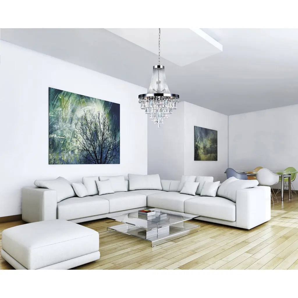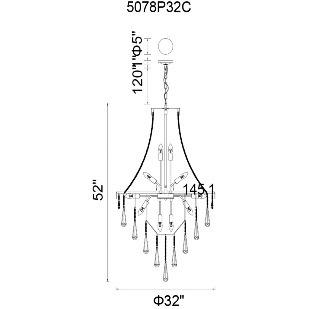 The Vast 17 Light Chandelier is a stunning light source with boundless elegance. This down chandelier has a chrome finish and an oversized 32 inch middle circular frame dripping with crystal drops. Cascading strands of crystals are also present to conceal the candelabra bulbs. Opt for this chandelier if you want to add an air of grace and elegance to your space.