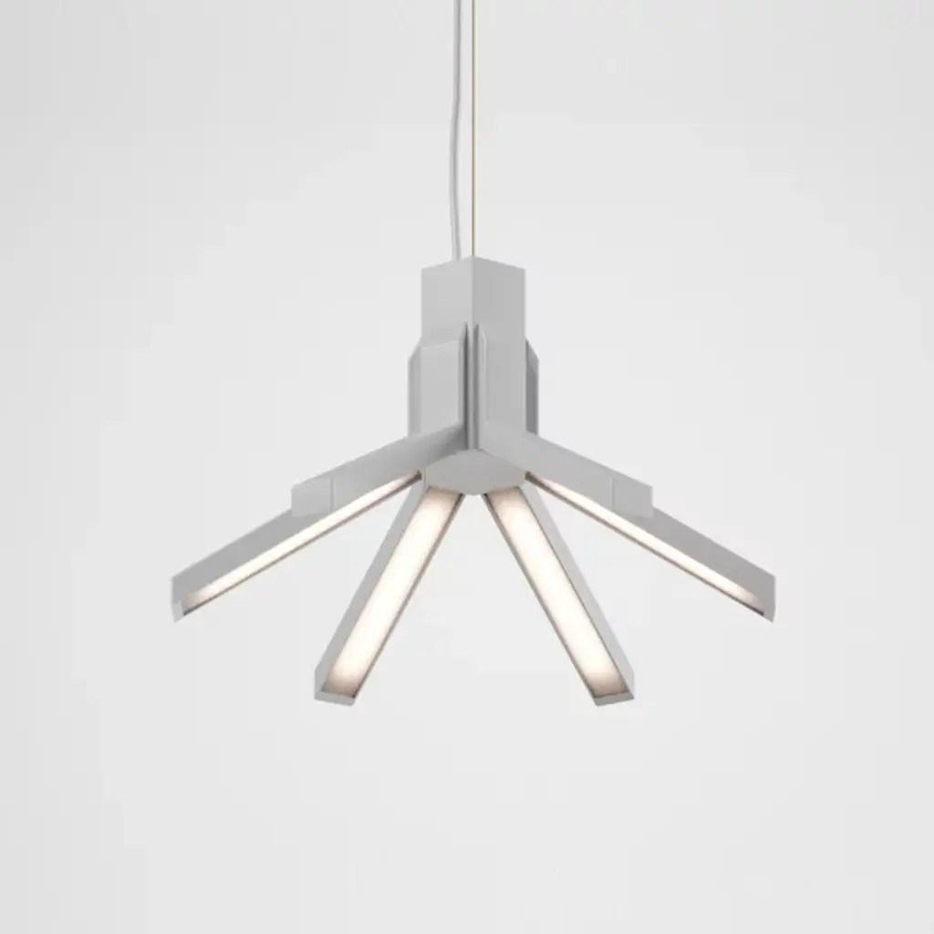 The linear lights can be configured at different heights and angles to create distinct sculptural orientations. Ordered into clean parallels or jumbled in playful asymmetry, Vega can be customized to complement any space.