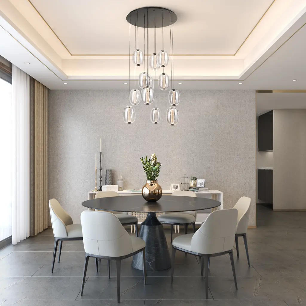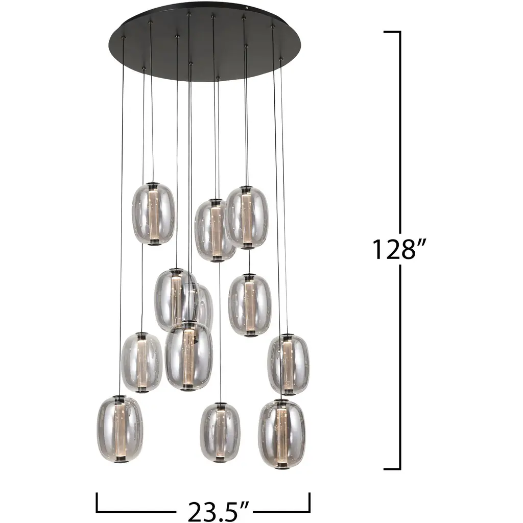 The LED foyer chandelier from the Vega Collection exudes an ethereal charm. The reflective dark smoke glass cradles a clear LED-illuminated cylinder, casting an alluring interplay of light and shadow. Complemented by rich black metalwork and an easy-to-use push-pin height adjustment, this pendant seamlessly blends elegance with practicality. A great addition to any surrounding.