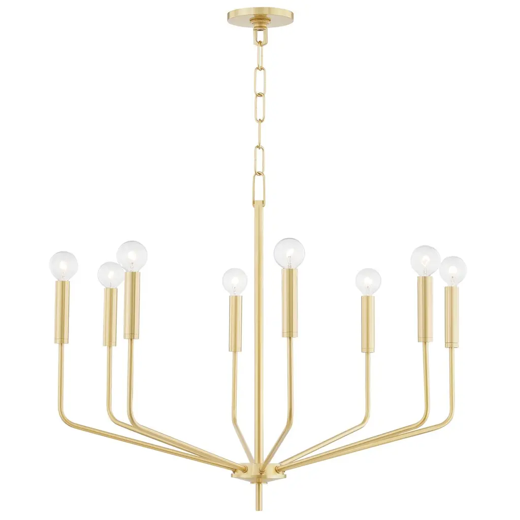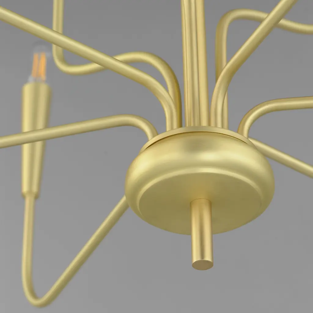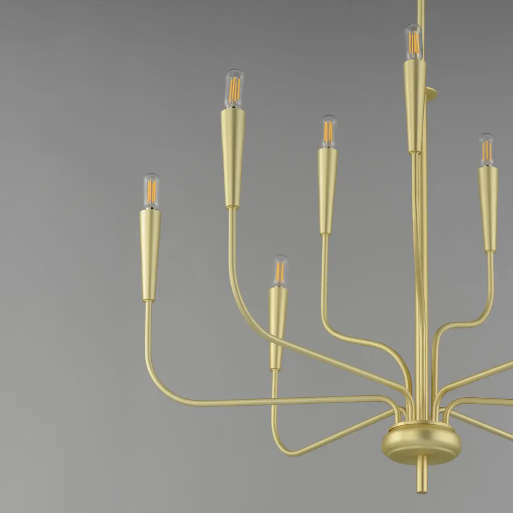 A simple candle style chandelier is given a modern edge with tall tapered candle covers that sit at the ends of curved arms without a bobeche beneath them. Available in Satin Brass or Matte Black, the collection compliments many architectural interiors and allows for creative styling through the selection of lamp type. Pair with our T6 lamp for more modern, industrial flair or classic candelabra for a clean, transitional look. This series provides a convenient new take on the candle chandelier with subtle and unique design details.