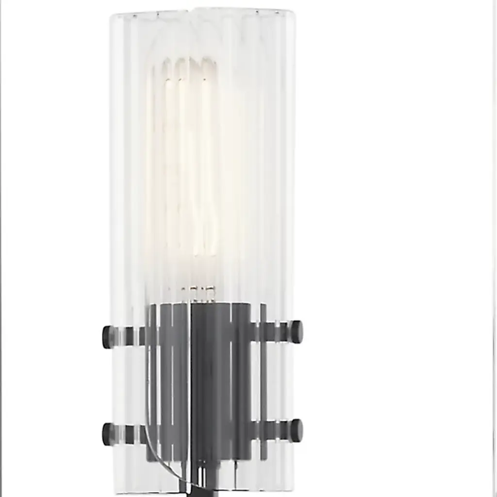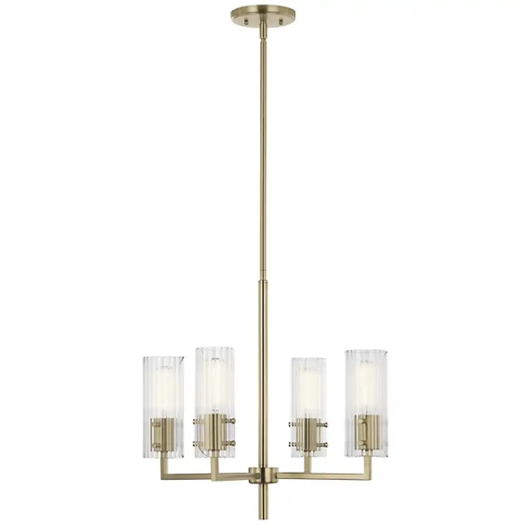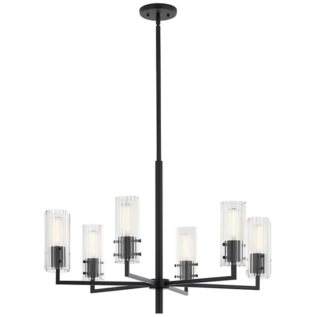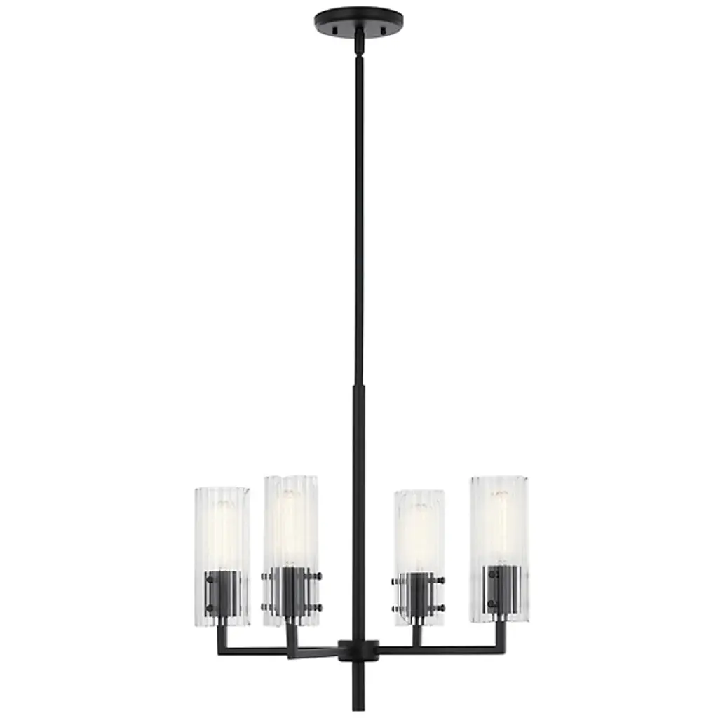 The Velestino Chandelier from Kichler merges straight lines with organic glass forms. Each glass cylinder features distinct ribbing that creates dynamic light patterns. One side flows in a gentle curve while the opposite maintains a crisp edge, adding subtle complexity. This piece’s steel frame provides a structured foundation that contrasts with its fluid glasswork. Adaptable to sloped ceilings, this chandelier brightens dining spaces and foyers while its thoughtful design casts intriguing shadows both day and night.