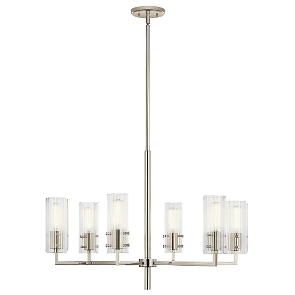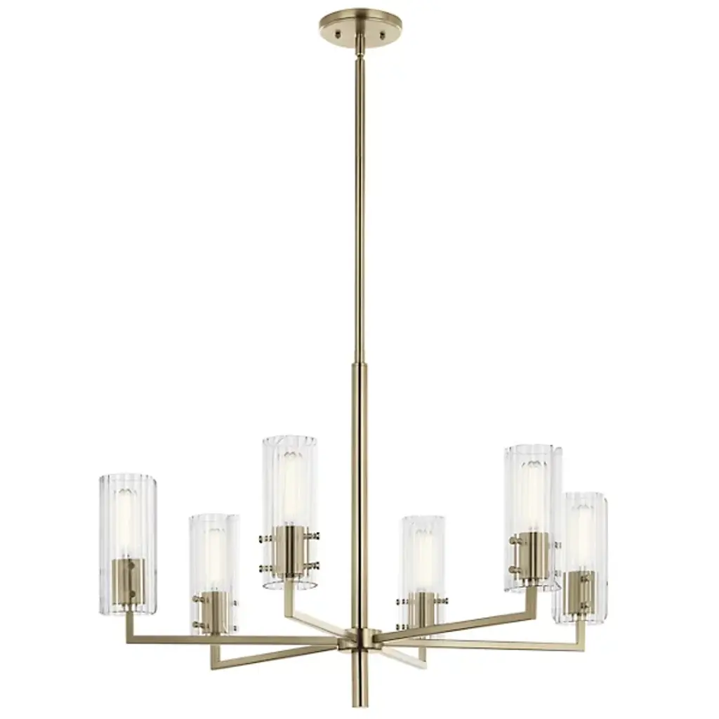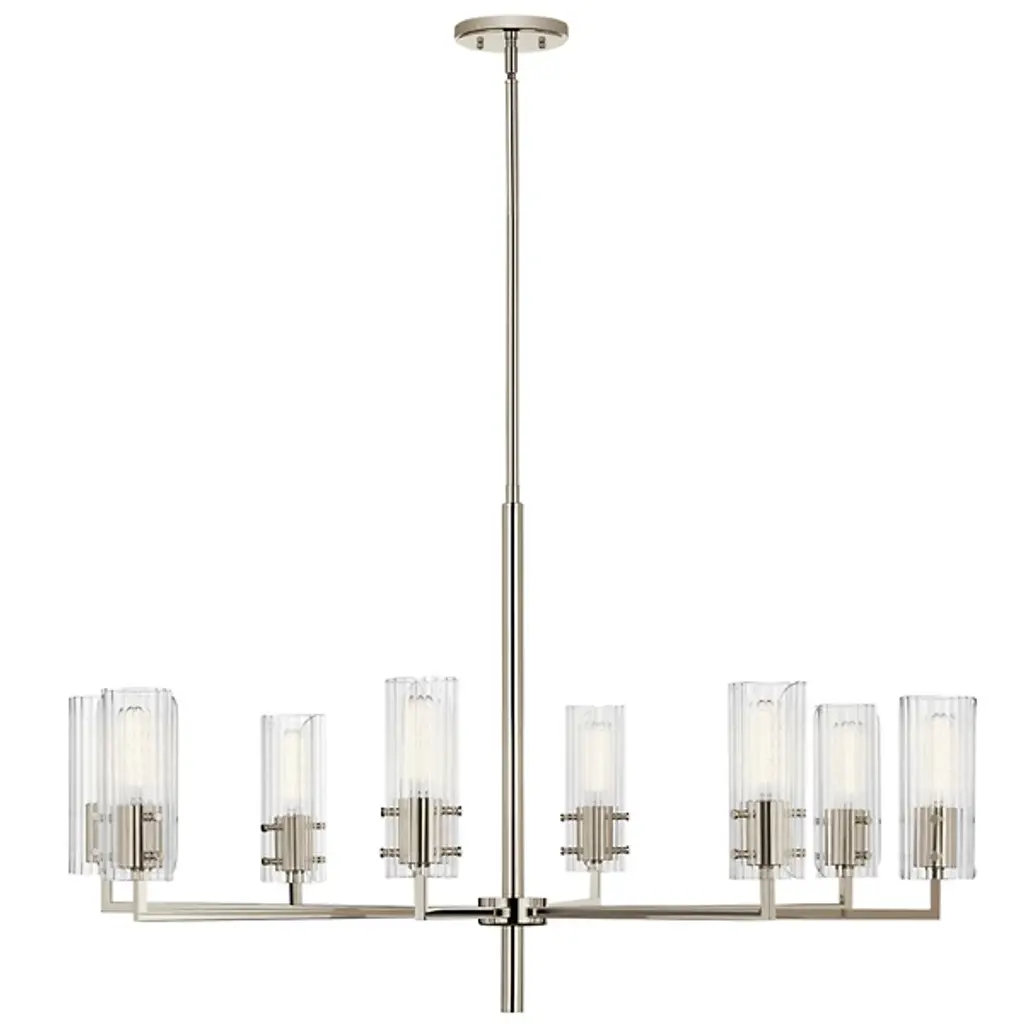 The Velestino Chandelier from Kichler merges straight lines with organic glass forms. Each glass cylinder features distinct ribbing that creates dynamic light patterns. One side flows in a gentle curve while the opposite maintains a crisp edge, adding subtle complexity. This piece’s steel frame provides a structured foundation that contrasts with its fluid glasswork. Adaptable to sloped ceilings, this chandelier brightens dining spaces and foyers while its thoughtful design casts intriguing shadows both day and night.