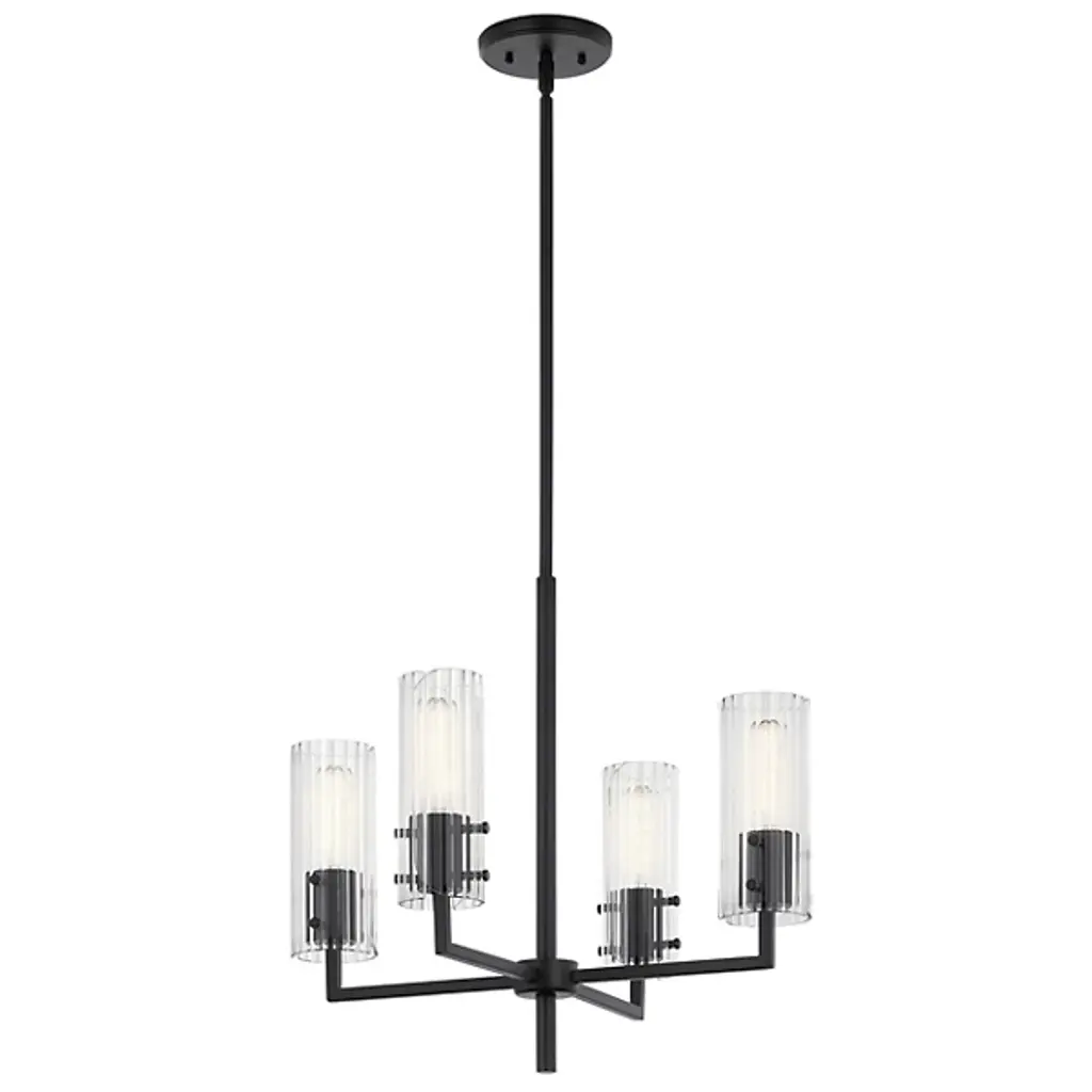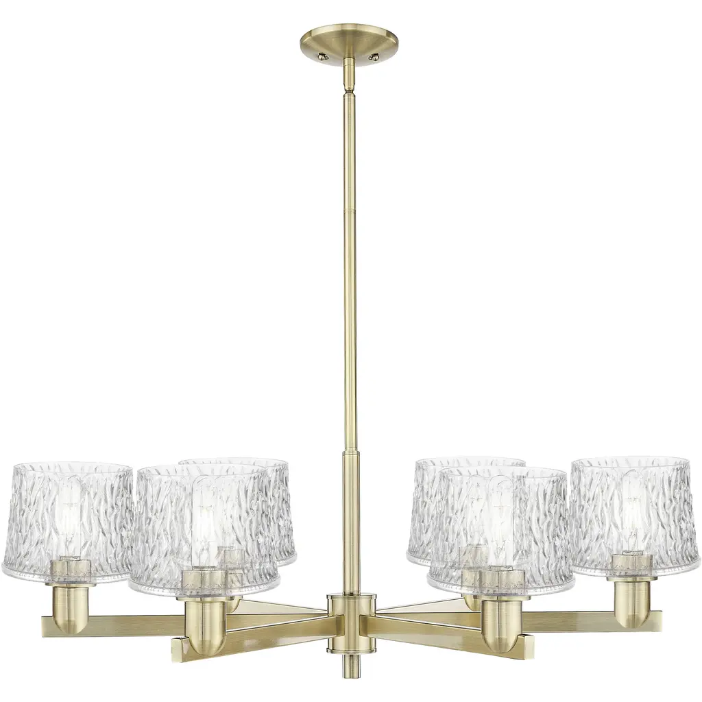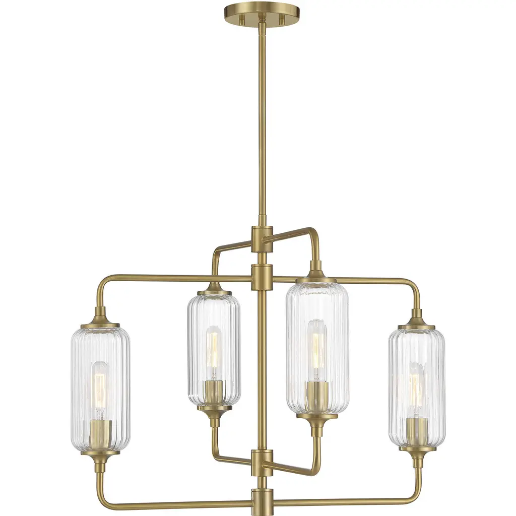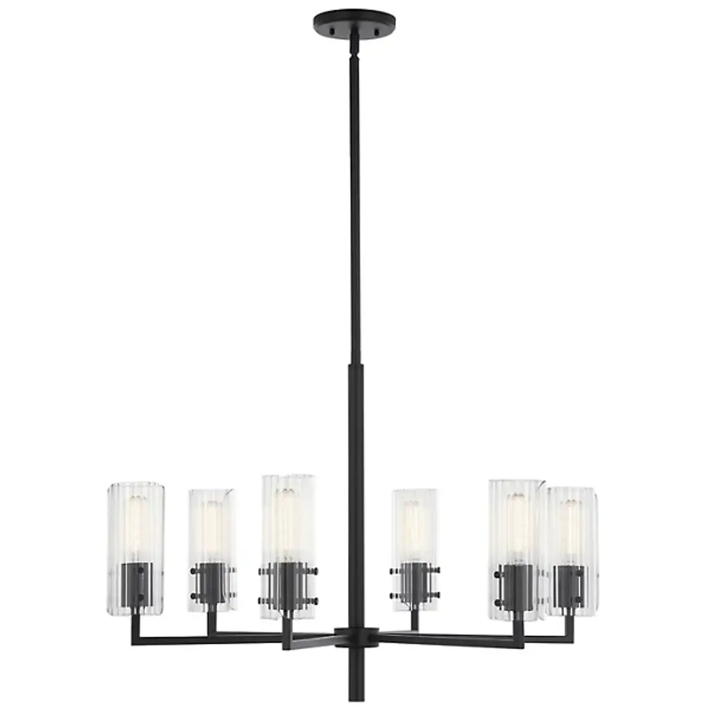 The Velestino Chandelier from Kichler merges straight lines with organic glass forms. Each glass cylinder features distinct ribbing that creates dynamic light patterns. One side flows in a gentle curve while the opposite maintains a crisp edge, adding subtle complexity. This piece’s steel frame provides a structured foundation that contrasts with its fluid glasswork. Adaptable to sloped ceilings, this chandelier brightens dining spaces and foyers while its thoughtful design casts intriguing shadows both day and night.