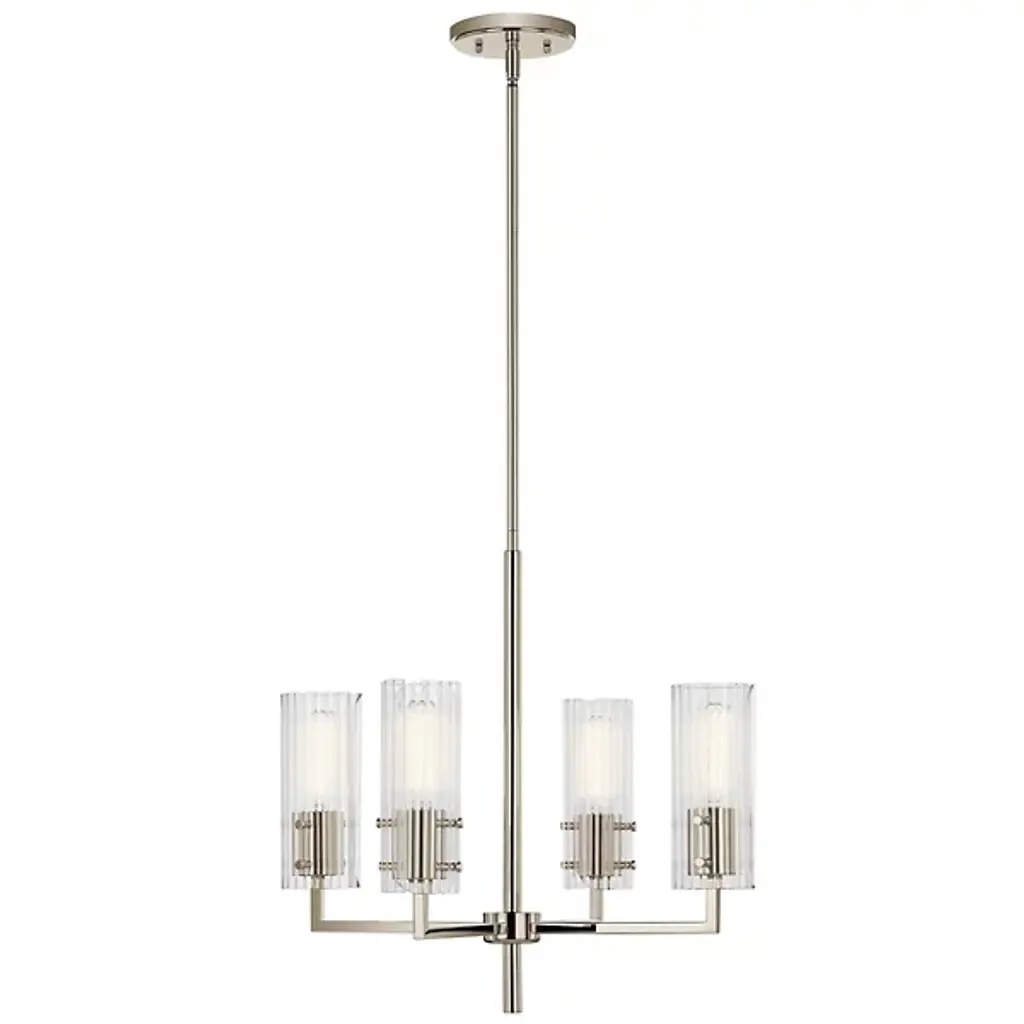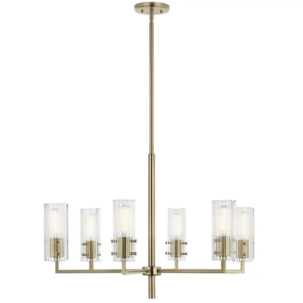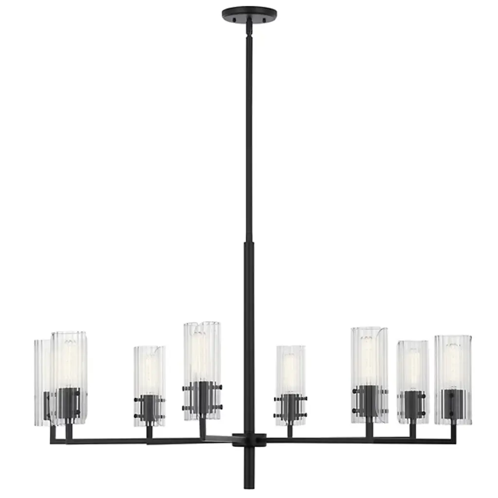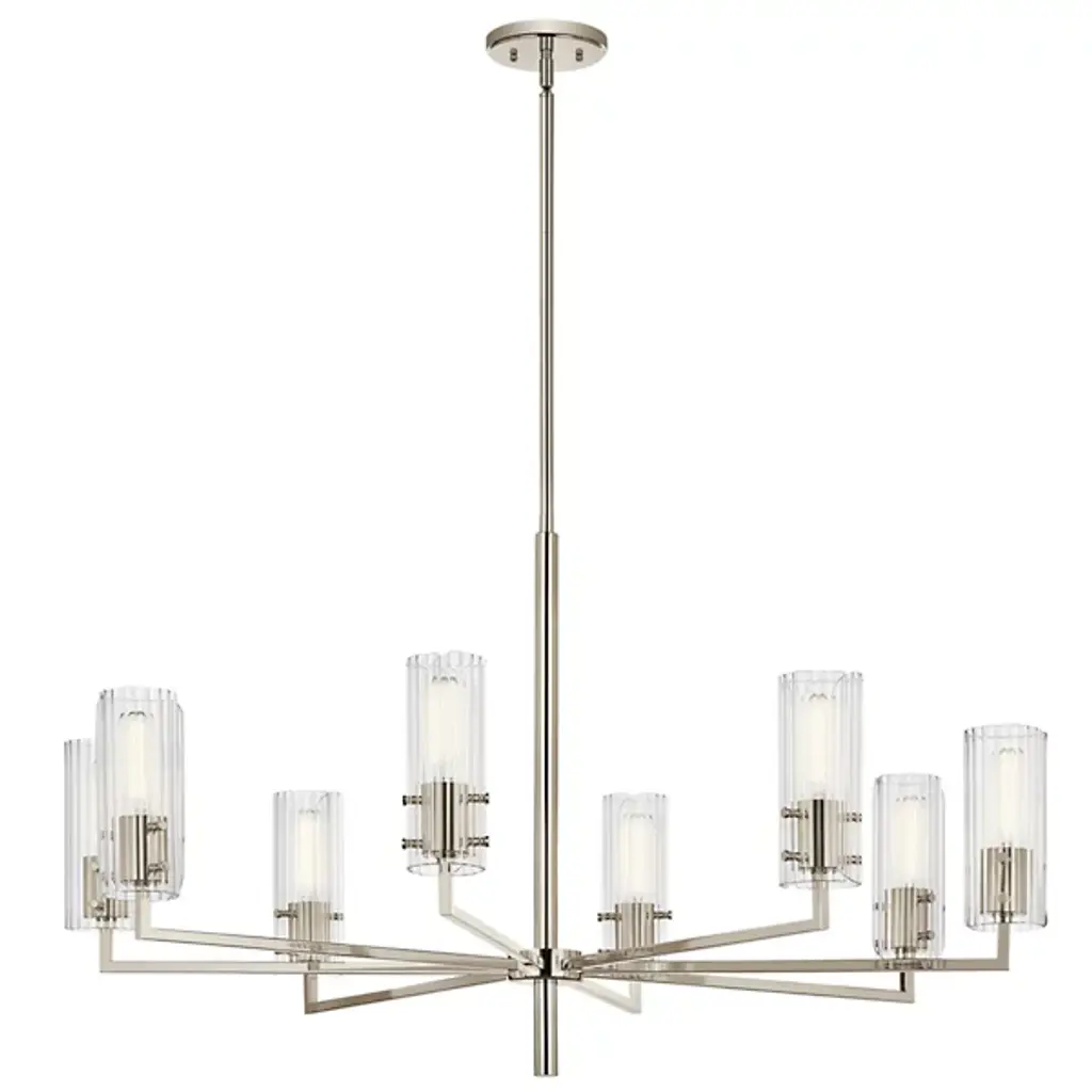 The Velestino Chandelier from Kichler merges straight lines with organic glass forms. Each glass cylinder features distinct ribbing that creates dynamic light patterns. One side flows in a gentle curve while the opposite maintains a crisp edge, adding subtle complexity. This piece’s steel frame provides a structured foundation that contrasts with its fluid glasswork. Adaptable to sloped ceilings, this chandelier brightens dining spaces and foyers while its thoughtful design casts intriguing shadows both day and night.